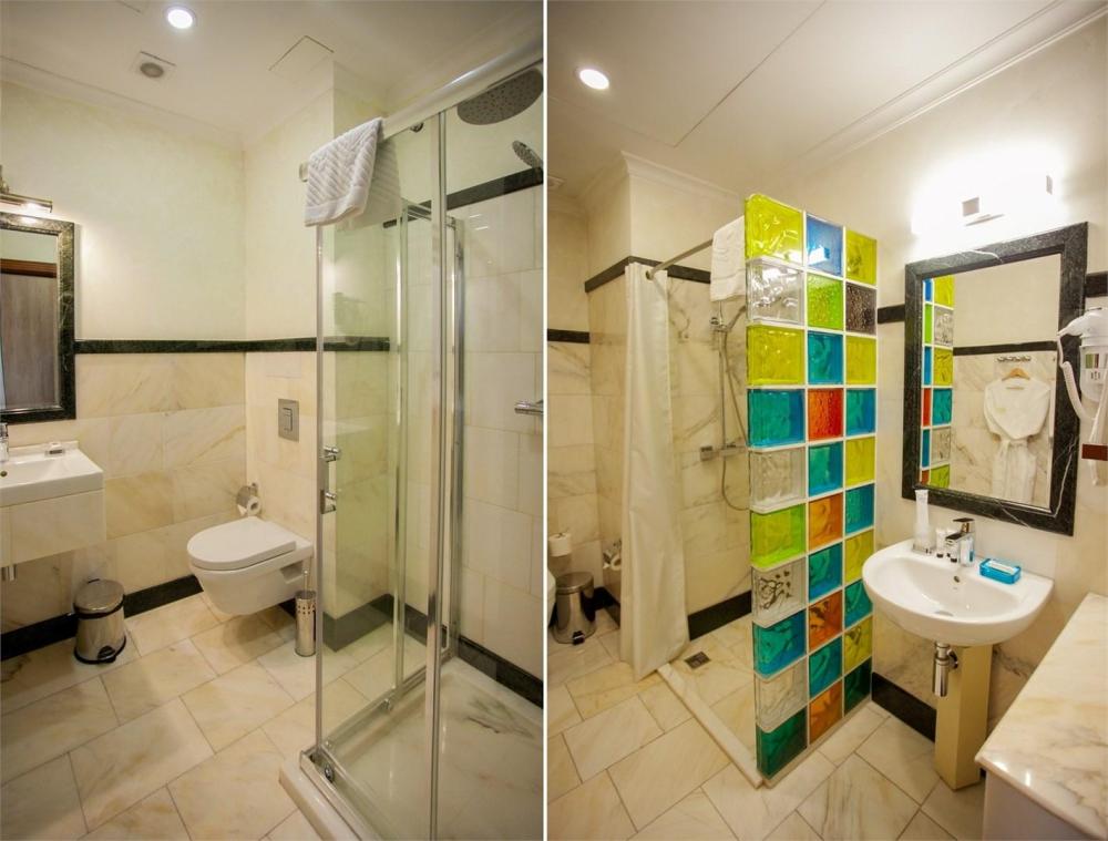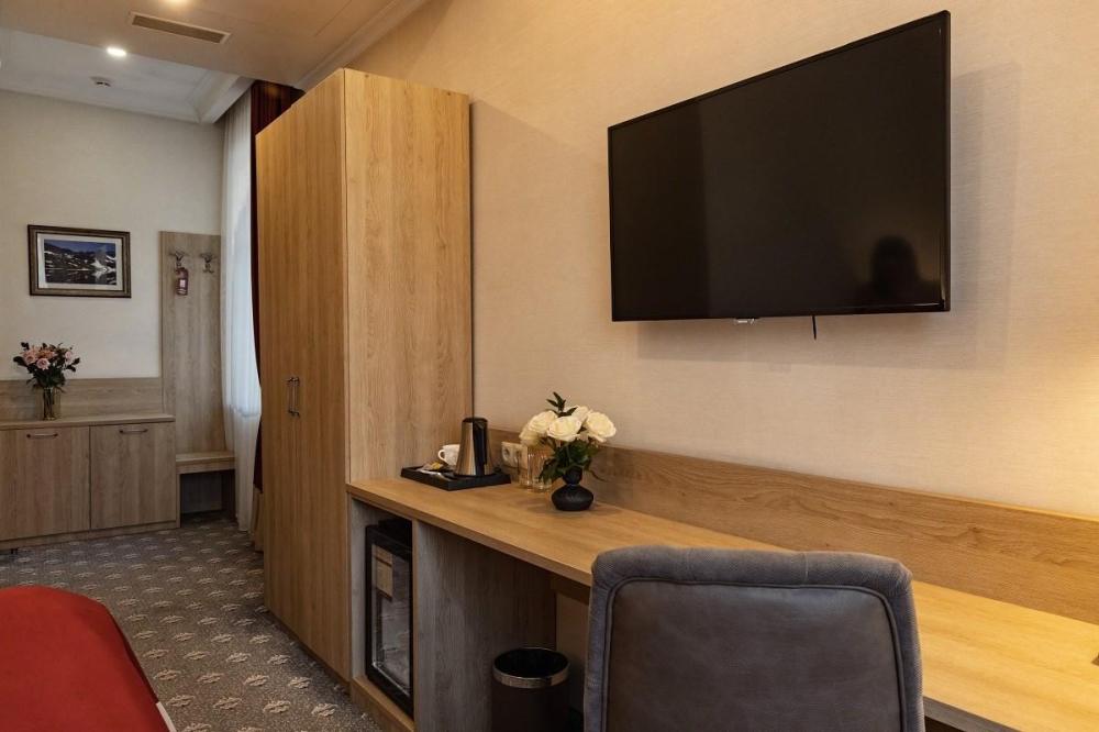 В номере: индивидуальная система кондиционирования, два LED ТV, сейф, фен, мини-бар, чайная станция, гладильный центр, набор белоснежных полотенец, халат, тапочки и косметический набор. Просторная ванная комната с мраморной отделкой включает классическую ванну или удобную душевую кабину. Набор косметики (шампунь, гель для душа, мыло, зубной набор) и махровых полотенец (6 шт), махровый халат, тапочки. Элегантная мебель из массива бука, комплект эргономичной мягкой мебели.