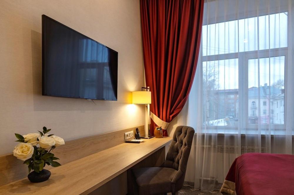 Двухкомнатный номер с видом на город (на уютный сквер и центральный проспект). Гостиная разделена на несколько зон: обеденную, рабочую и зону отдыха. В спальне удобная двуспальная кровать 180см*200см, ортопедический матрас. 2 ЖК ТВ с отличным выбором каналов и функцией Smart TV. Просторный рабочий стол, оборудованный радиотелефоном, чайная станция, кофе машина, микроволновая печь, Бесплатный беспроводной доступ в Интернет (Wi-Fi), мини-бар, фен, сейф, халат, тапочки.