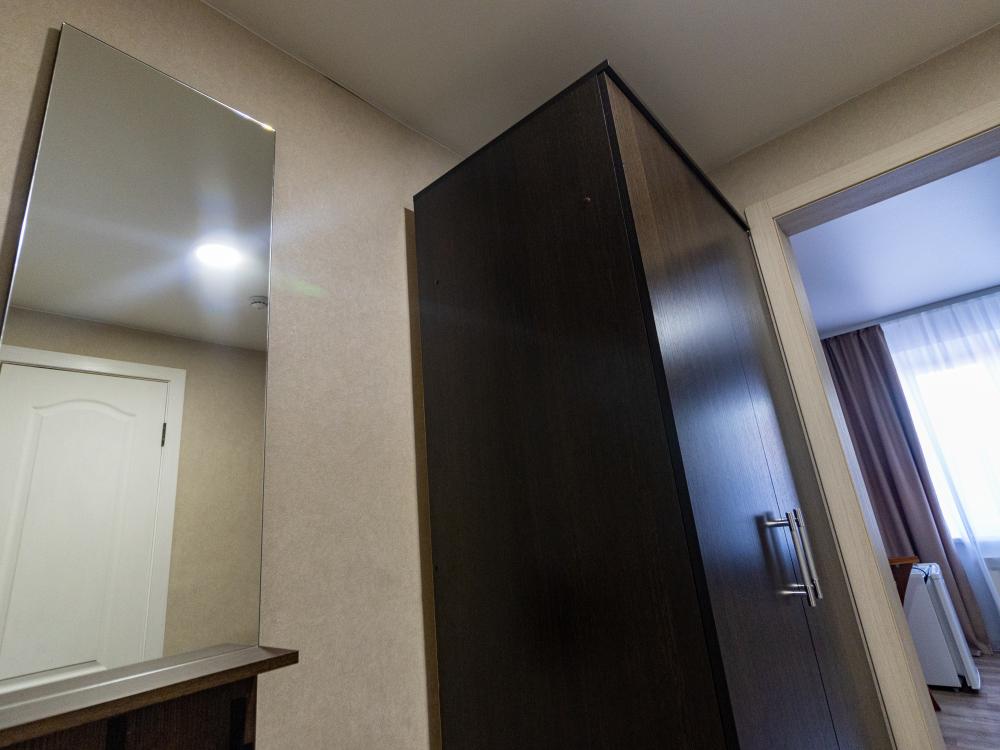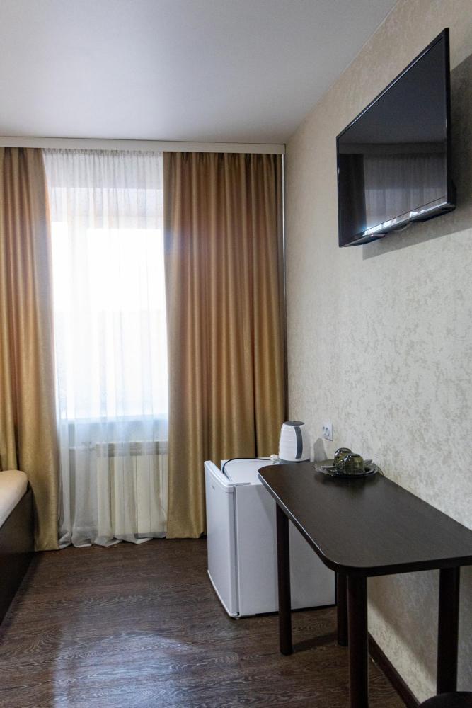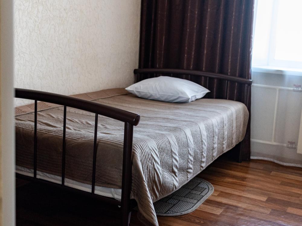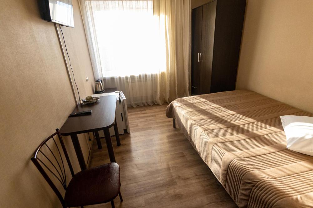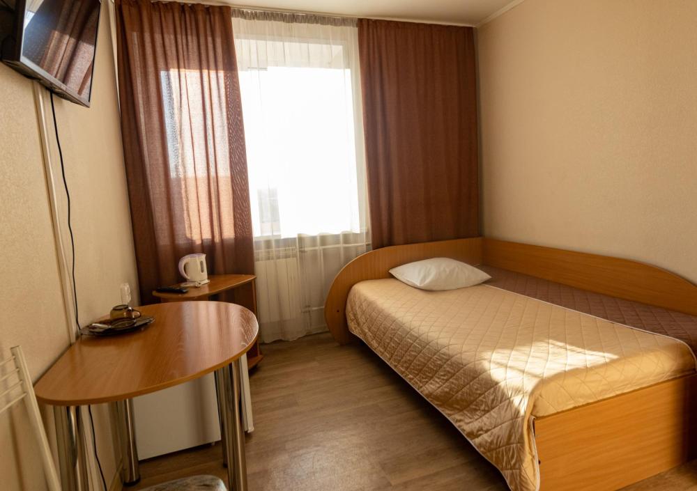 Одноместный однокомнатный номер с односпальной или двуспальной кроватью. Номер оборудован небольшой ванной комнатой. В номере холодильник, телевизор, электрический чайник. В ванной полотенца и туалетные принадлежности.