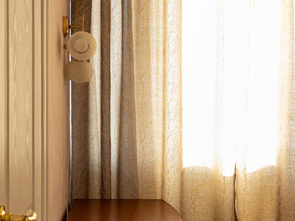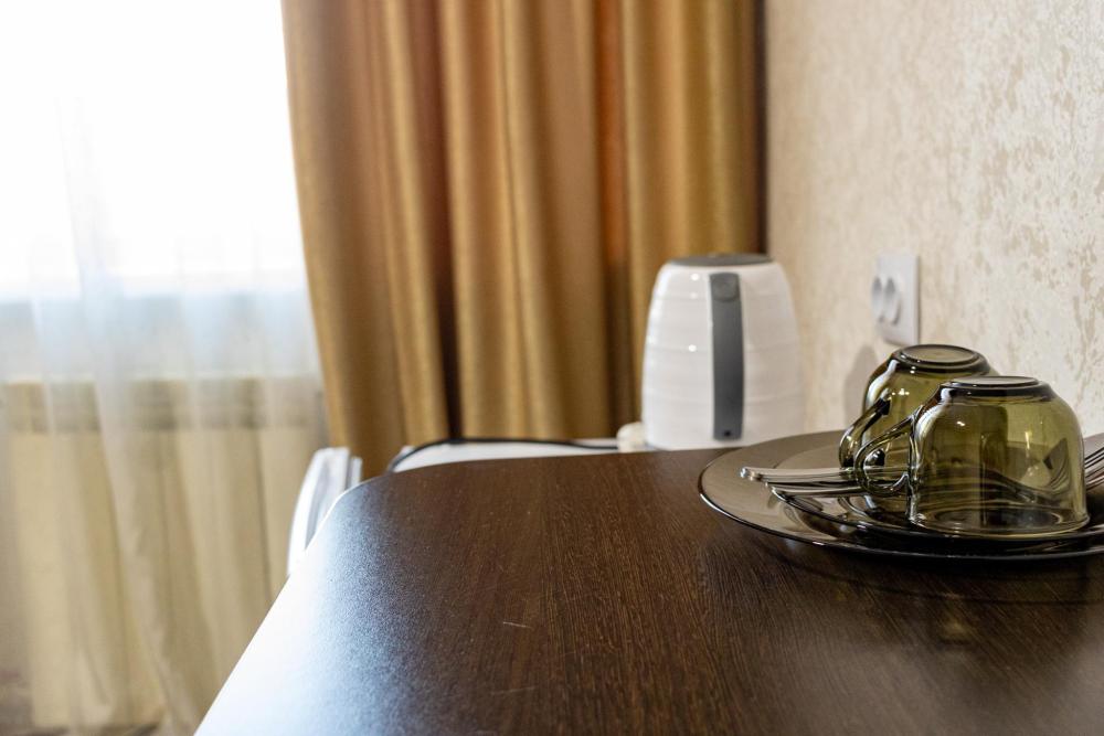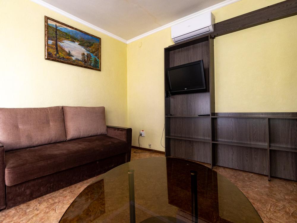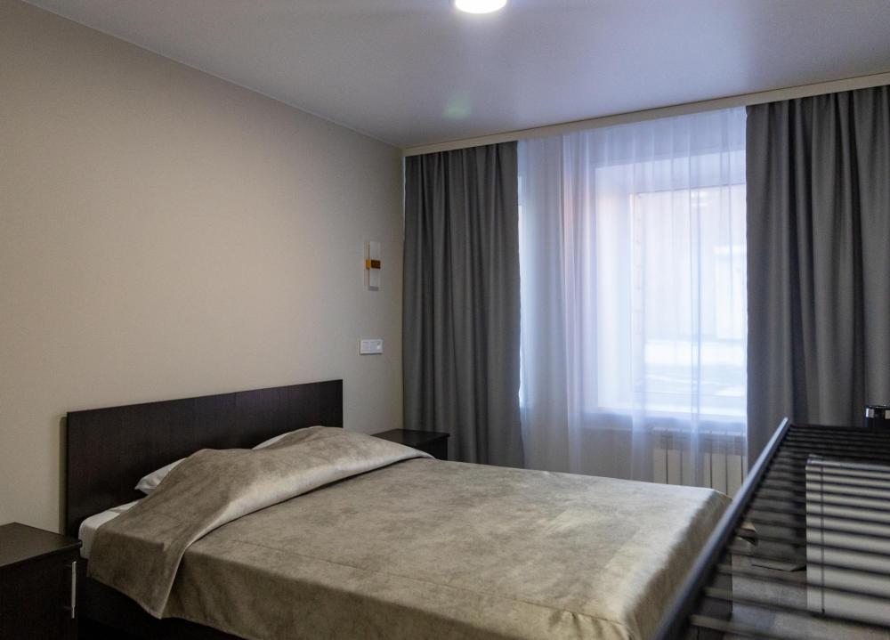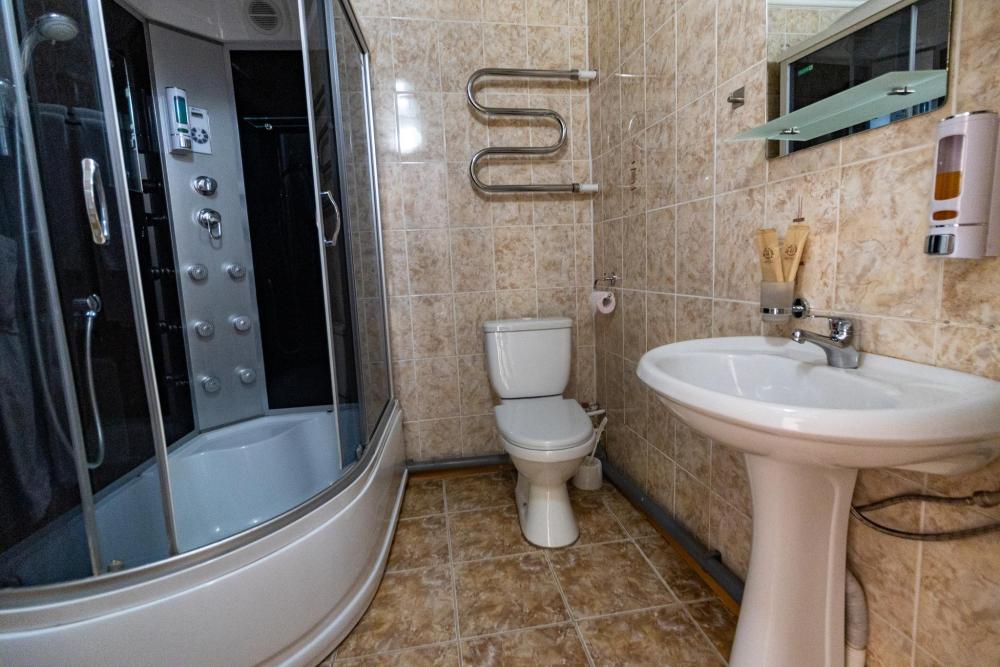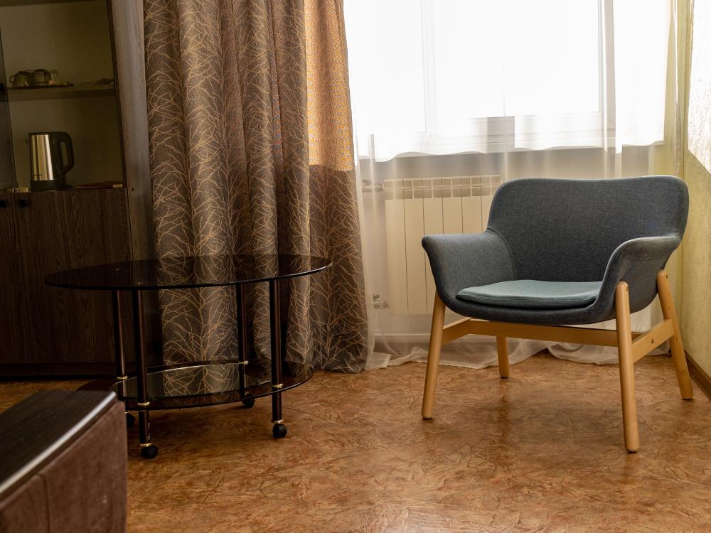 Двухместный двухкомнатный номер с двумя полутораспальными кроватями. Номер оснащен кондиционером. В номере находятся диван, стулья, журнальный столик, также холодильник, телевизор и электрический чайник. В ванной есть туалетные принадлежности, полотенца, халаты и тапочки.