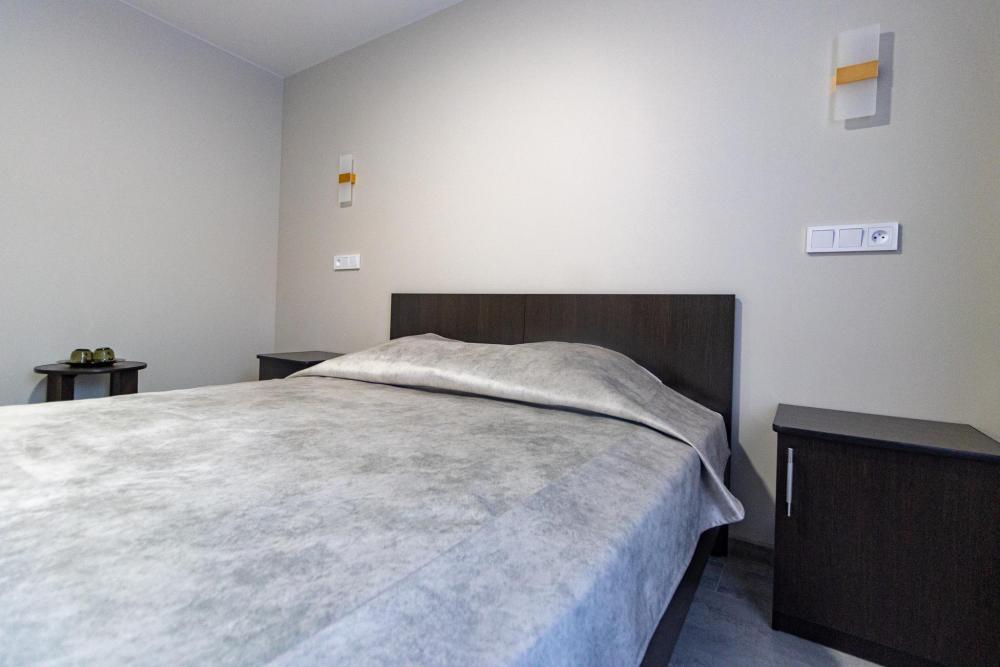 Двухкомнатный люкс с двуспальной кроватью. Номер оснащен кондиционером. В номере находятся диван, тумбочка, кресло, журнальный столик, также холодильник и телевизор. В ванной комнате есть туалетные принадлежности, полотенца, халат, тапочки.