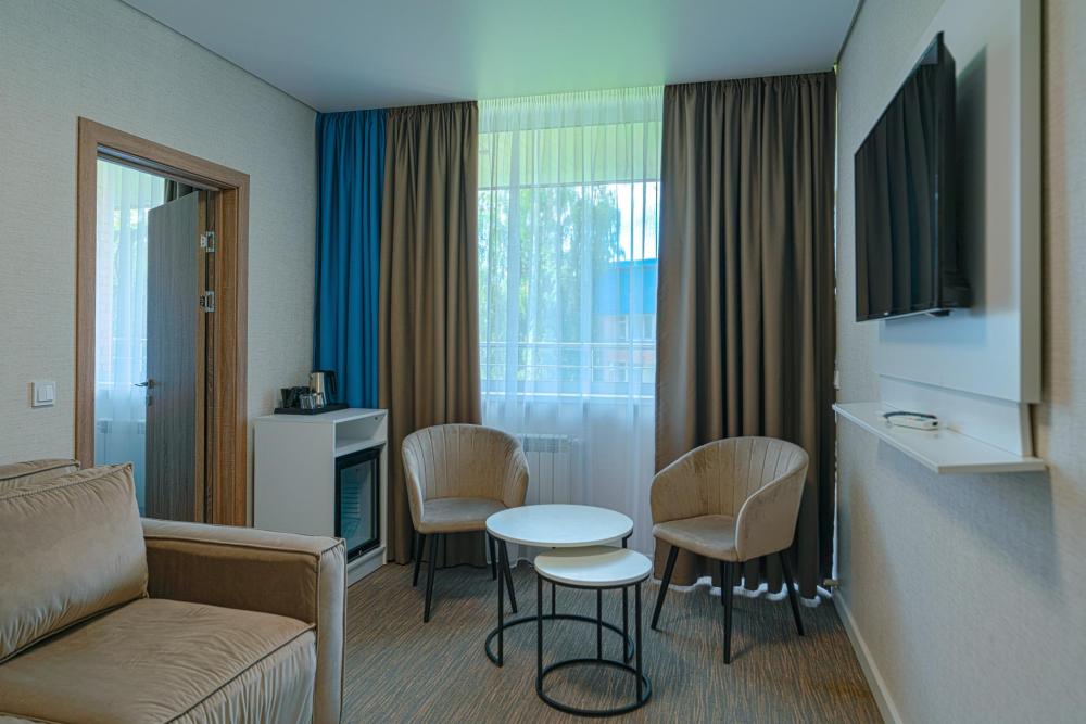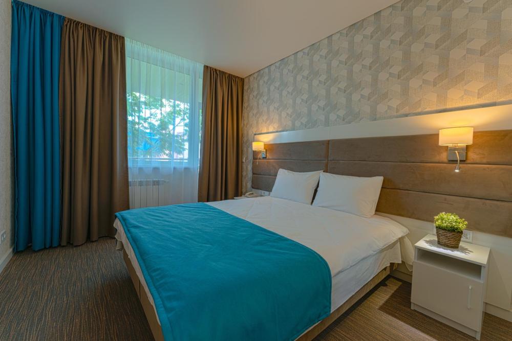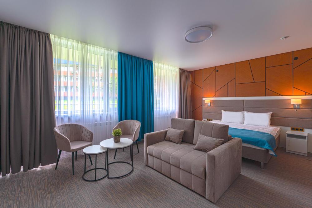 Двухкомнатный двухместный полулюкс «DBL» корпус 4 Категория полулюкс премиум / 3*. Удобный и комфортабельный 2-комнатный номер премиум-класса площадью 32 кв. м. Данная категория номеров пользуется популярностью у семей с детьми или тех, кто решил приехать на отдых с друзьями. Номера данной категории расположены в 4 корпусе на основной территории санатория. Корпуса соединены с медицинским корпусом теплым переходом: не нужно выходить на улицу. Инфраструктура основного корпуса: • медицинский корпус • фитнес-зал с силовыми и кардио тренажерами • игровая комната (бильярд, настольный теннис) • детские комнаты • библиотека • кафе • бар • прокат спортивного инвентаря • беседки для барбекю Что входит в стоимость номера: • Размещение в номере выбранной категории • Трехразовое питание по системе "шведский стол" Бесплатно предоставляются следующие услуги: • Бассейн 25 м с детской купелью (1 час в день с учетом времени нахождения в раздевалке) • Тренажерный зал • Анимационные программы • Парковка (при наличии машиномест) • WiFi • Размещение детей до 1 года без предоставления допместа Медицинские услуги входят в стоимость при покупке санаторно-курортной путевки (с лечением)