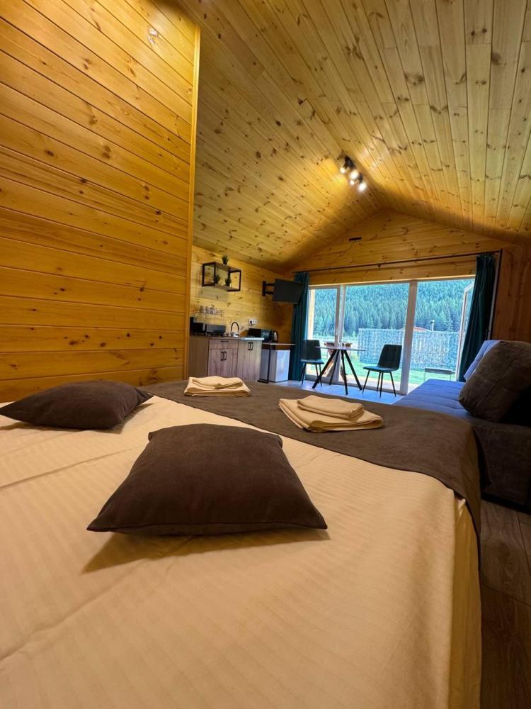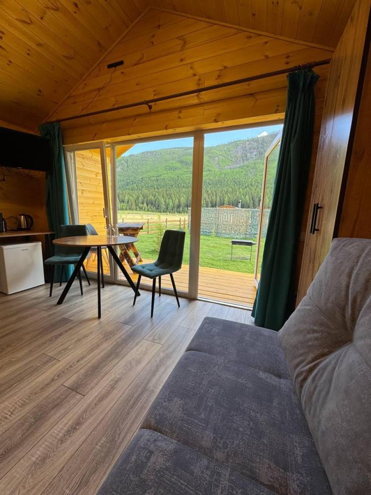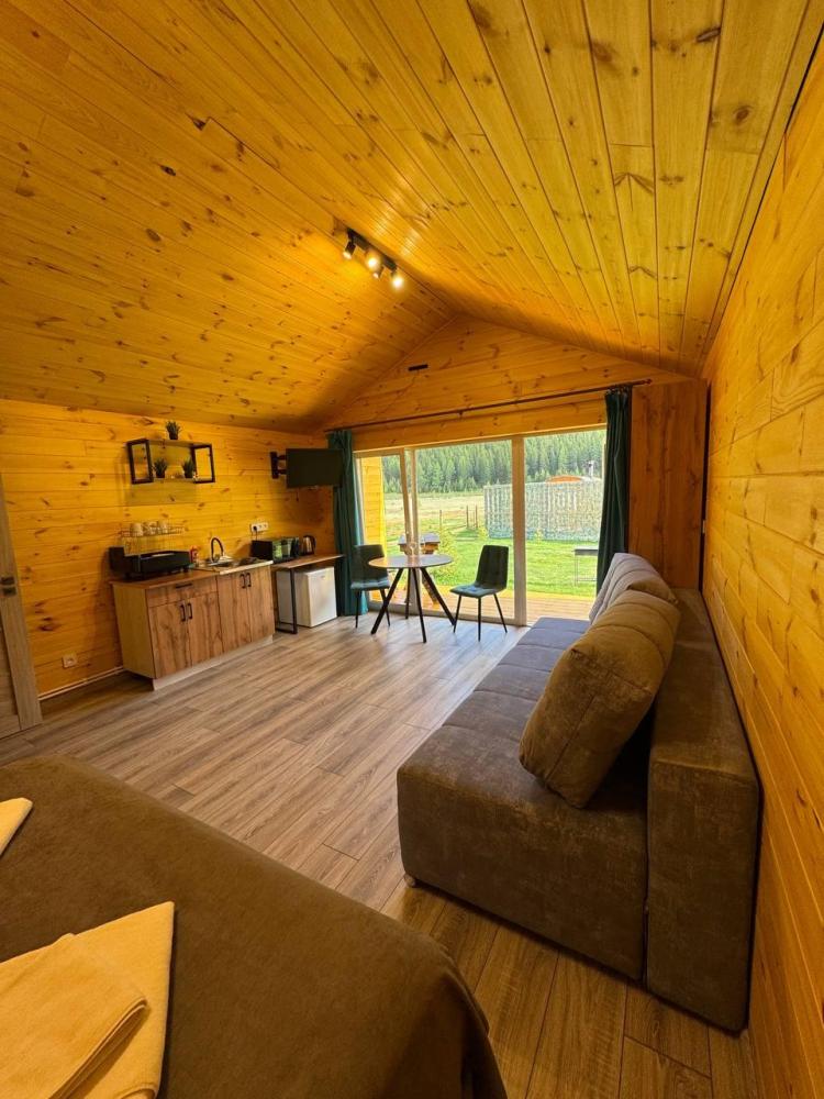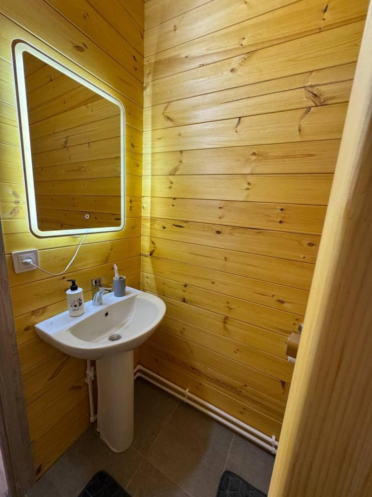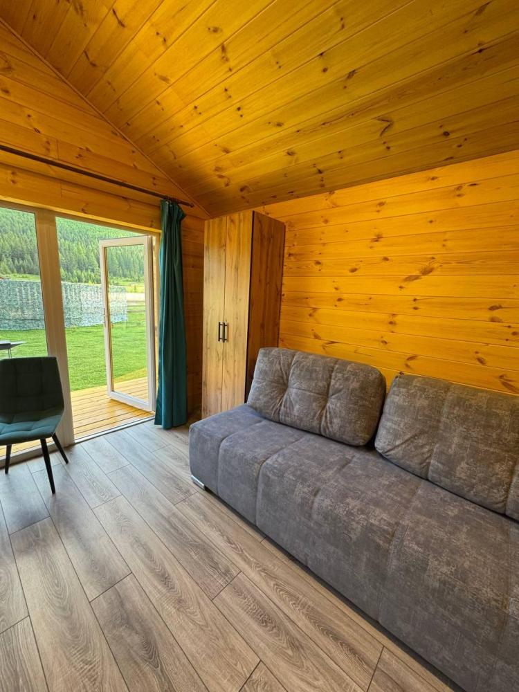 Однокомнатный дом 30 кв. м. с панорамным видом на гору Бельнек. Первая линия от реки Менка — Двухспальная кровать; — Дополнительное место ( раскладной диван); — Прикроватная тумба; — Обеденный стол в стиле LOFT; —Два стула; —Телевизор; —Чайник; —Микроволновая печь; — Холодильник; — Микроволновка; — Посуда; — Душ, туалет; — Полотенца; — Фен; — Тапочки; — Завтрак включен в стоимость проживания. Домик оснащен системой теплых полов с возможностью регулировки температуры (дополнительно имеется обогреватель). У каждого дома собственная терраса, на которой располагается стол и два стула. — Мангальная зона для прекрасного время провождения и романтических вечеров. Отдельно стоящие дома, наполненные светом, теплом и ароматом кедра.