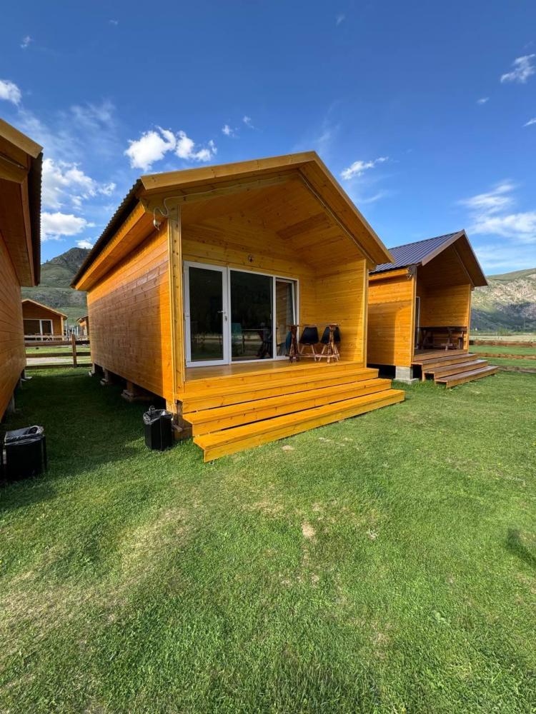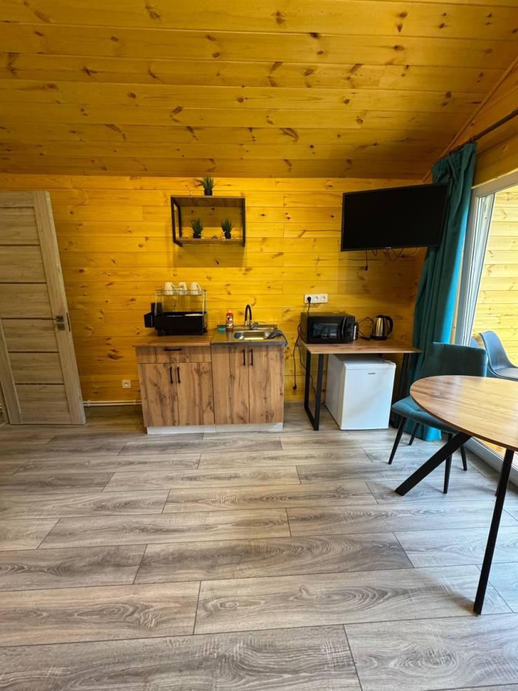 Дом площадью 23 кв. м. Дом оборудован всем необходимым для комфортного проживания: двухспальная кровать, прикроватная тумба, обеденный стол в стиле LOFT, два стула, телевизор, чайник, холодильник, посуда на две персоны, душ, туалет, полотенца на две персоны, фен,завтрак включен в стоимость проживания. Домик оснащен системой теплых полов с возможностью регулировки температуры (дополнительно имеется обогреватель). У каждого дома собственная терраса, на которой располагается стол и два стула, мангальная зона для прекрасного время провождения и романтических вечеров.