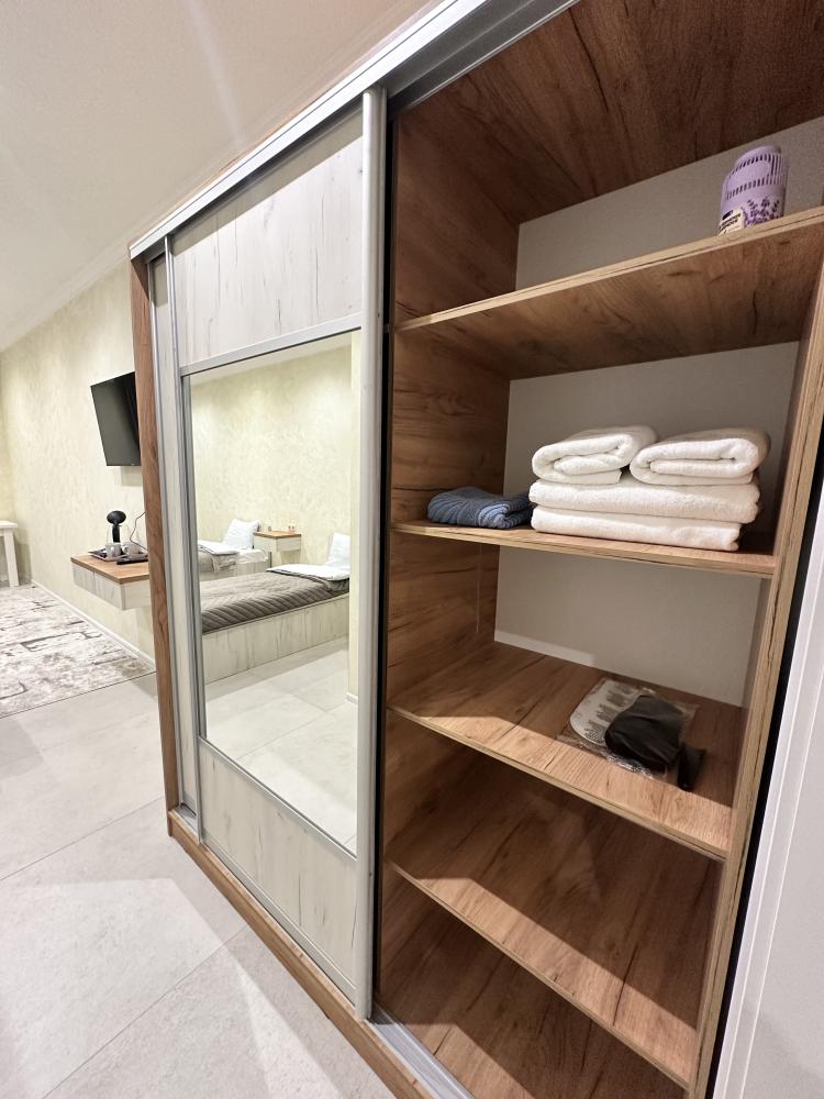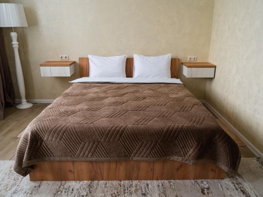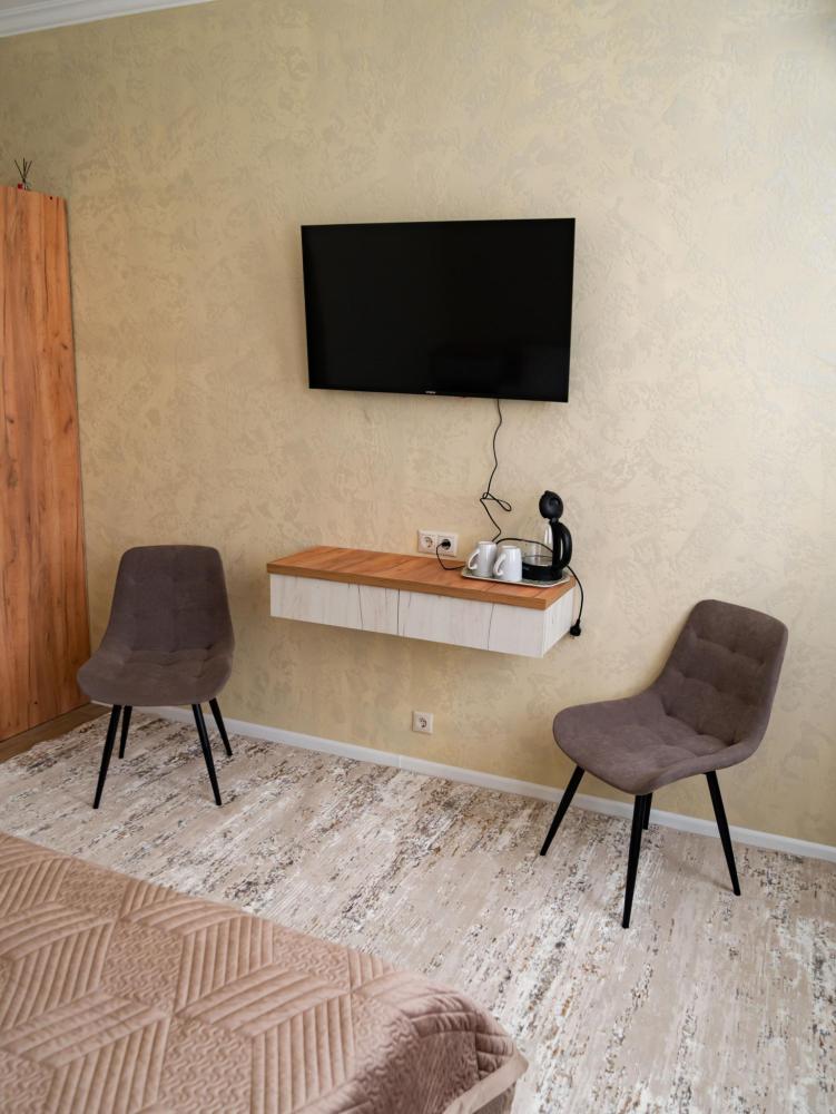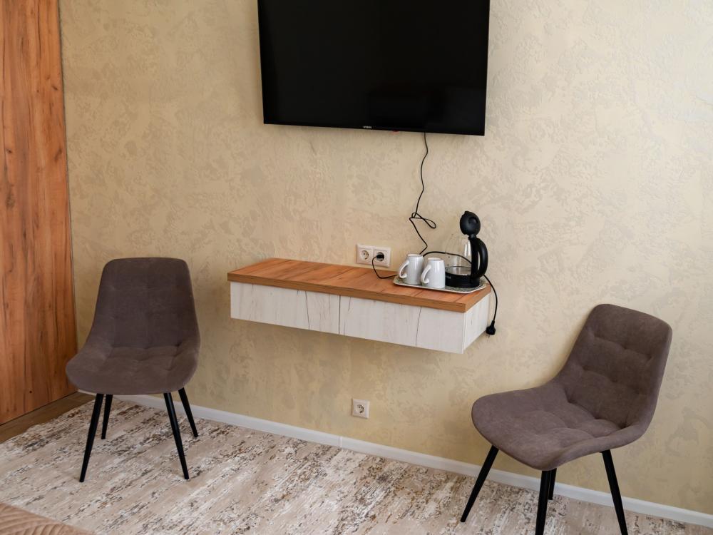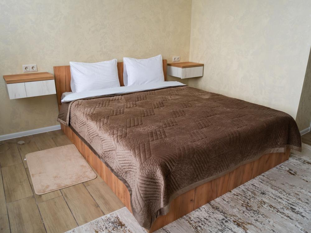 Номер «Люкс» (25 м²) Премиум-категория для романтического отдыха или особенного путешествия. Центром номера является большая двуспальная кровать. Здесь есть все для максимального комфорта: от кондиционера и телевизора до внимания к каждой детали. В номере есть: Большая двуспальная кровать с ортопедическим матрасом , Собственный санузел с душевой кабиной , Чайник с набором для чая , Набор полотенец и банные тапочки , Туалетные принадлежности (шампунь, гель для душа, мыло) , Фен, телевизор, кондиционер , Высокоскоростной Wi-Fi