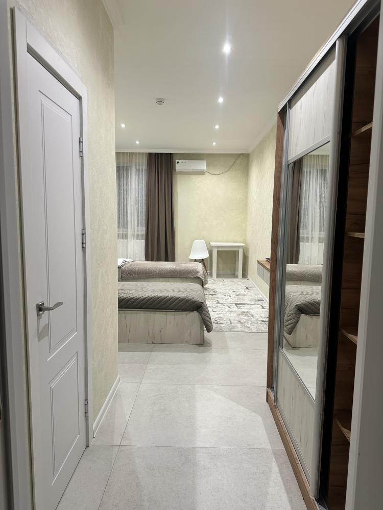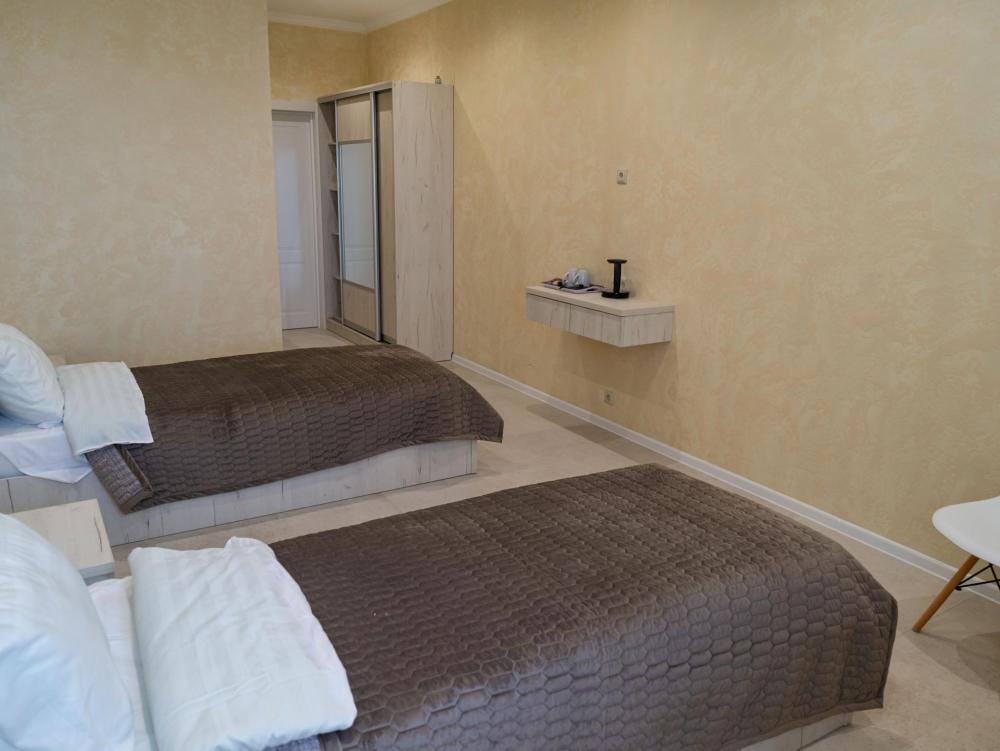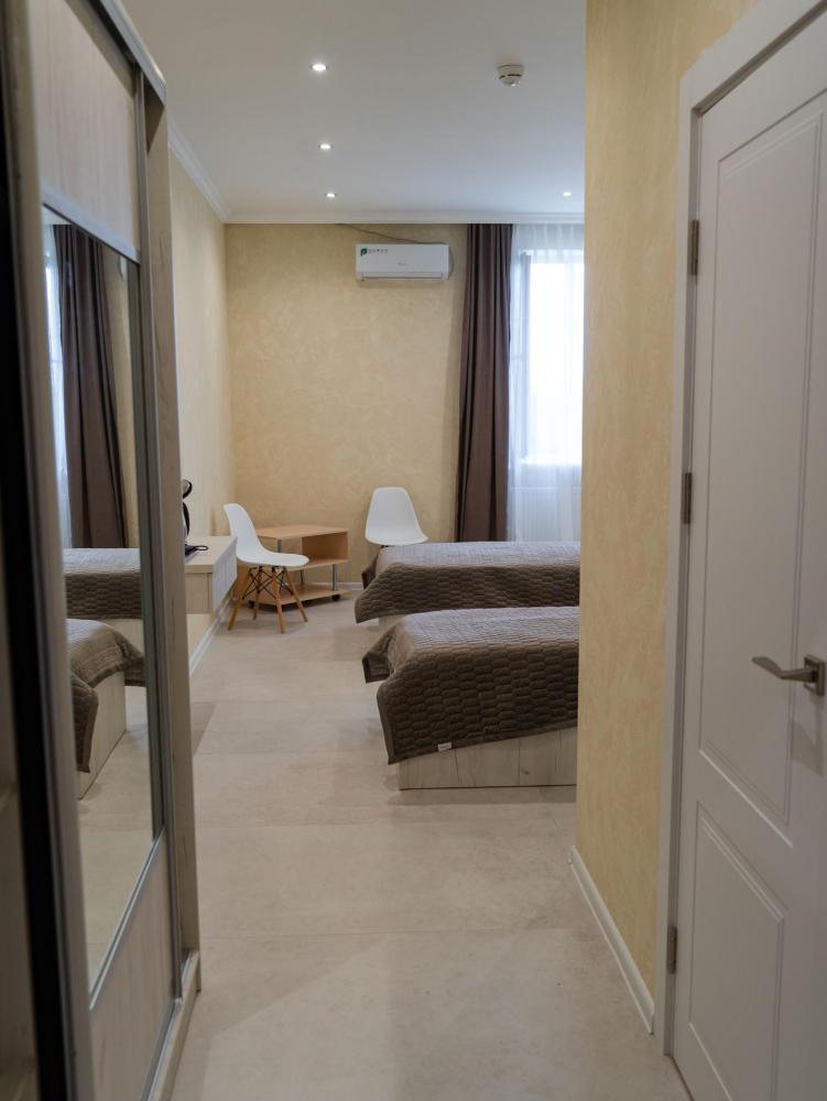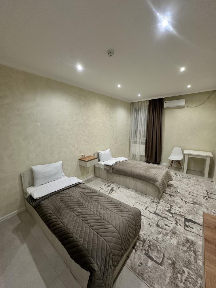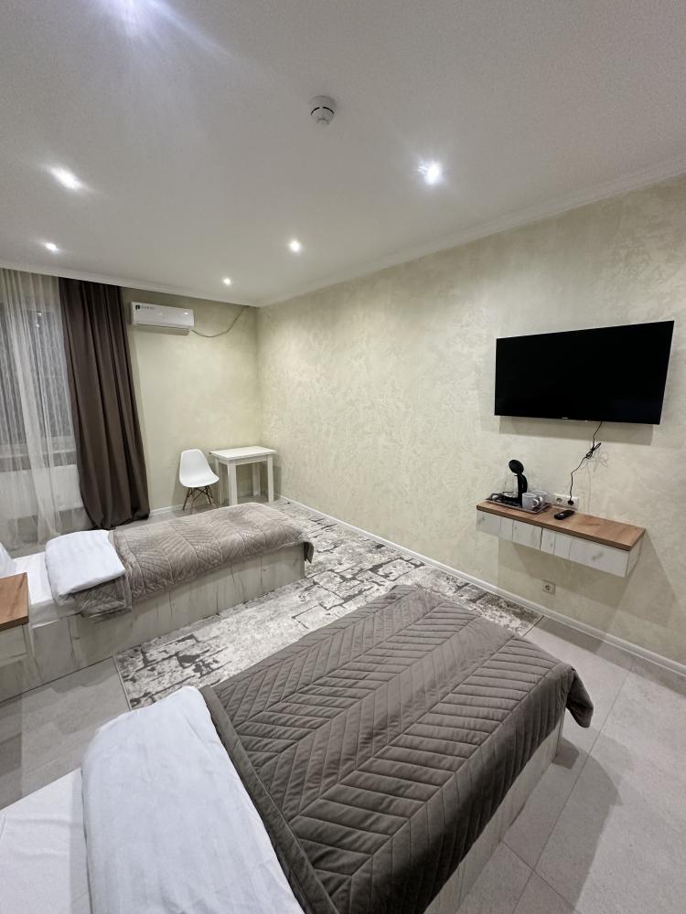 Номер «Люкс 2 кровати» (27 м²) Самый просторный вариант в отеле, идеальный для друзей, коллег или тех, кто предпочитает раздельные кровати, не жертвуя уровнем комфорта. Все преимущества категории «Люкс» в еще более большом формате. В номере есть: Две односпальные кровати с ортопедическими матрасами , Собственный санузел с душевой кабиной , Чайник с набором для чая , Набор полотенец и банные тапочки , Туалетные принадлежности (шампунь, гель для душа, мыло) , Фен, телевизор, кондиционер , Высокоскоростной Wi-Fi