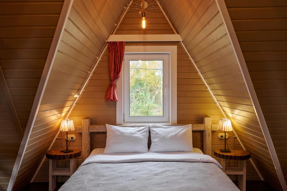 Двухэтажный дом-афрейм подойдет для семейного отдыха. На первом этаже - двуспальная кровать, мини-кухня, санузел, обеденная зона, телевизор, шкафы для одежды. На втором - две односпальные кровати. Дополнительное место может быть организовано на диване на первом этаже. На кухне - индукционная плита, холодильник с морозилкой, раковина, микроволновка, набор посуды, бокалов, приборы, посуда для приготовления еды, чайник, нож, разделочная доска, средство для мытья посуды. В ванной комнате установлена стиральная машинка, что дает возможность планировать длительное проживание. Балкон второго этажа и веранда подсвечиваются в вечернее время, здесь стоит уличная мебель, где можно попить чай, поесть шашлык и насладиться красивым закатом. Рядом с домом - большой крытый мангал. Наши необычные дома называют по-разному - афрейм, бунгало, треугольный дом. Как бы не называли - отдыхается в нем очень хорошо. В санузле на первом этаже - душ, умывальник, унитаз, фен, зубной набор, полотенца. В дозаторе в ванной и душевой - "гель/шампунь в одном" хорошего качества Рядом с домом – мангал ПОДХОДИТ ДЛЯ ДЛИТЕЛЬНОГО ПРОЖИВАНИЯ На карте территории это дома 5 и 9