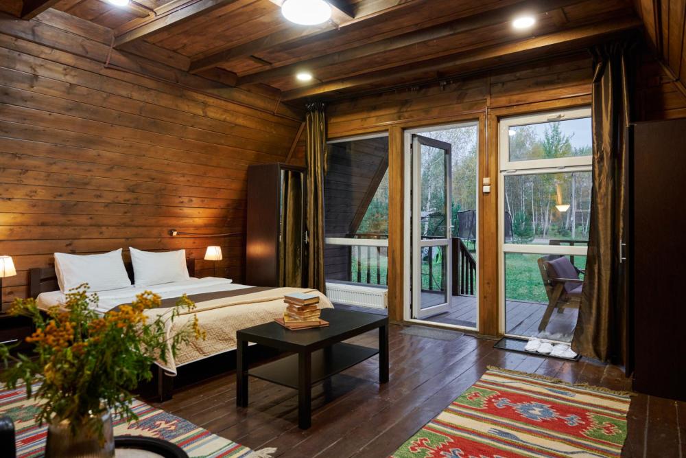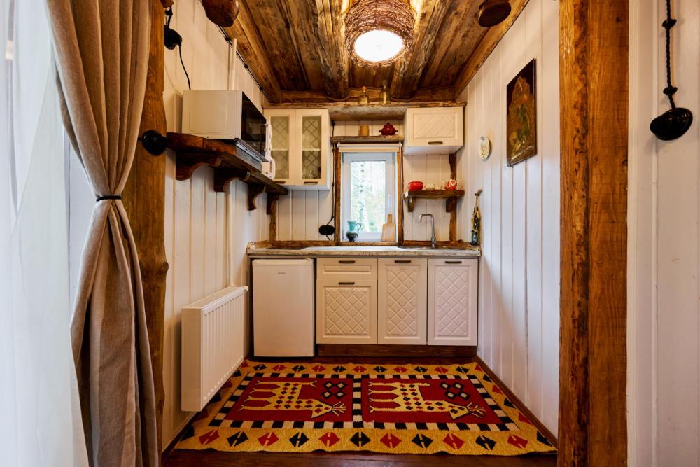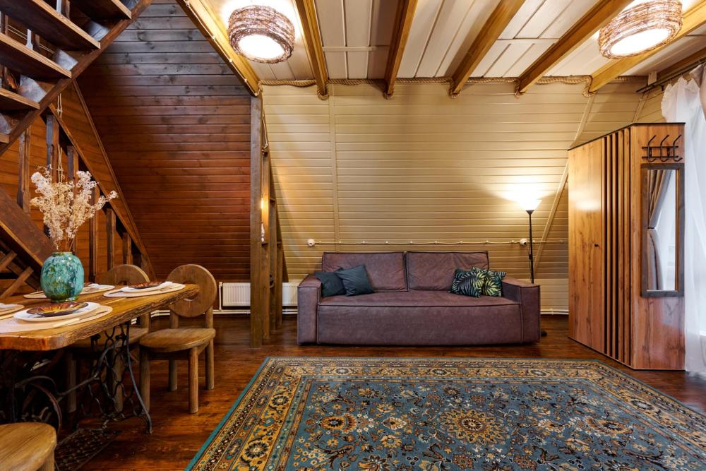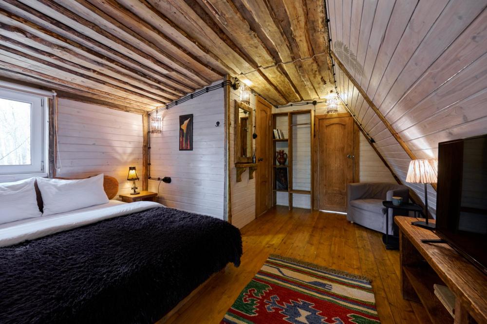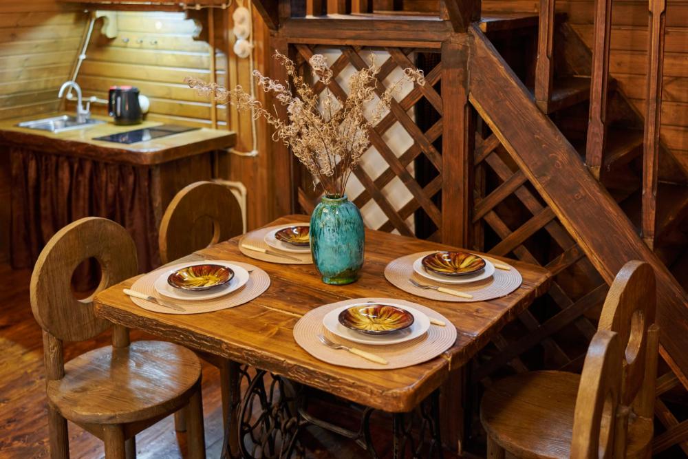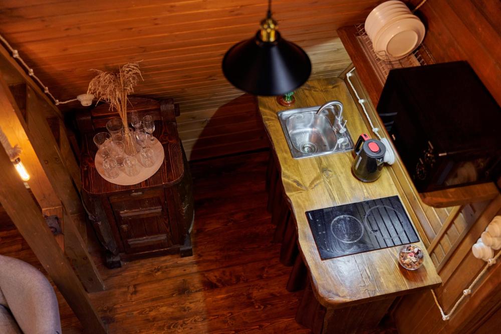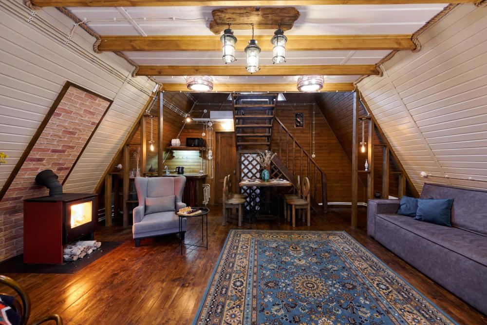 Дом в деревенском стиле с оригинальной отделкой слэбами. На первом этаже - гостиная с диваном (здесь может быть организовано два дополнительных места) и электрокамином, обеденный стол, кресло-качалка, мини-кухня с индукционной плитой, посудой для приготовления и набором столовой посуды. Элементы интерьера сделаны вручную. Спальня с двуспальной кроватью (140х200см) расположена на втором уровне. Здесь есть небольшой балкончик. В санузле - ванная, умывальник, унитаз, фен, зубной набор, полотенца. В дозаторе над ванной – «гель/шампунь в одном» хорошего качества. В доме нет кондиционера, но это не помешает комфортному отдыху на природе.