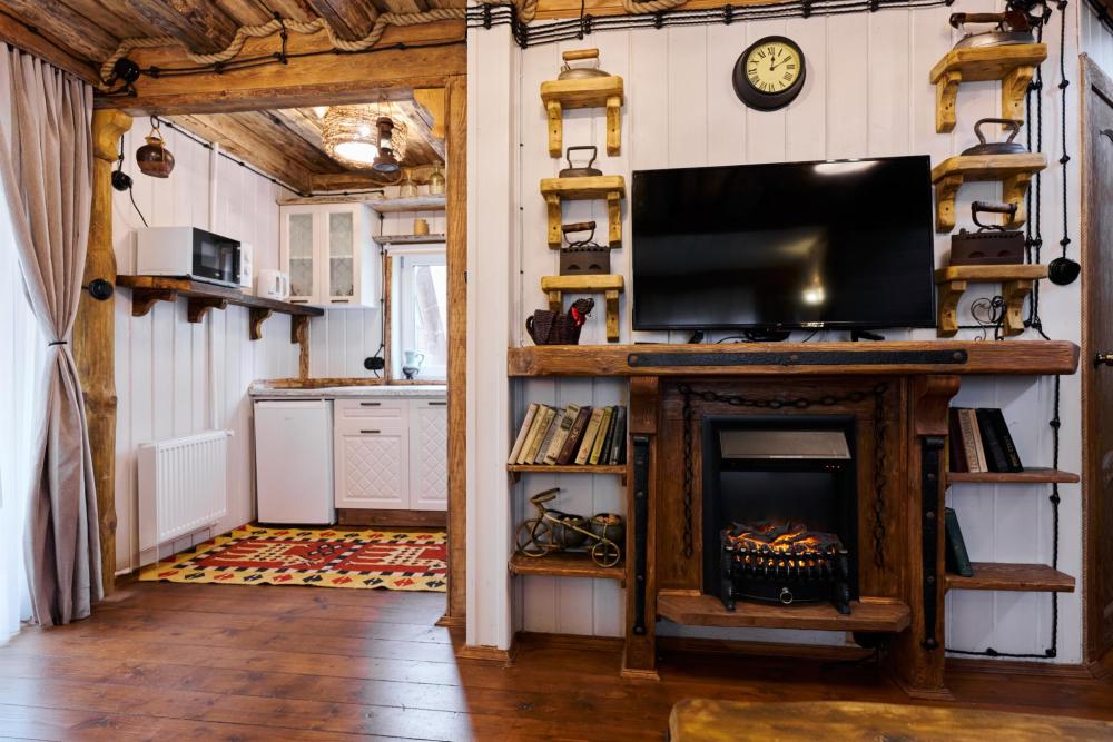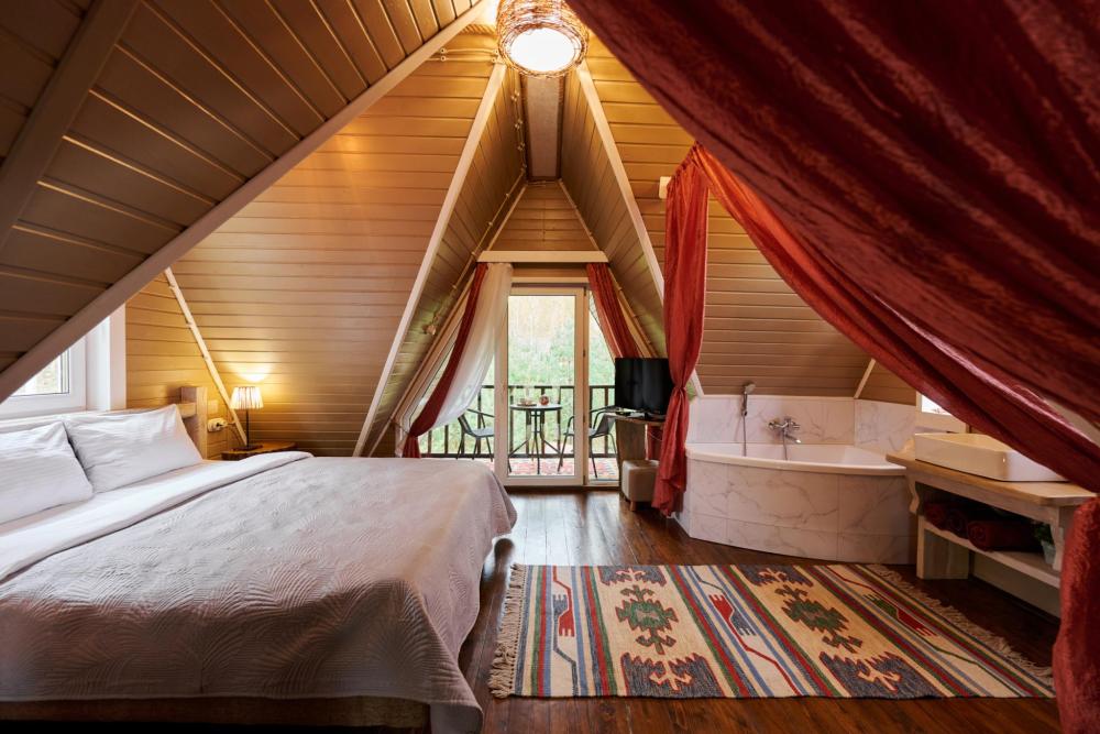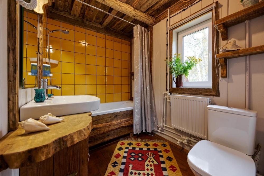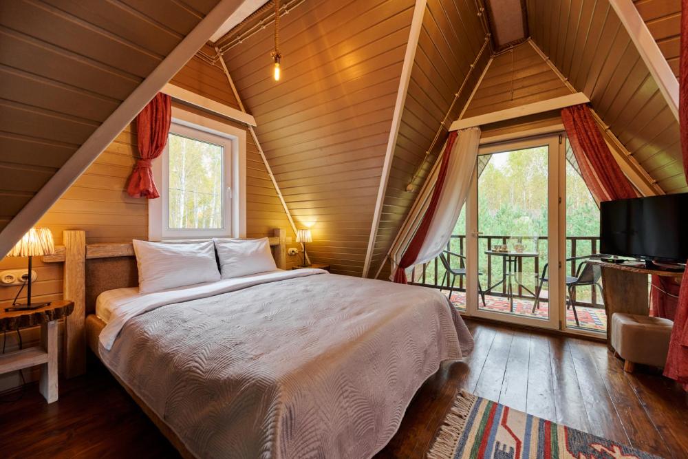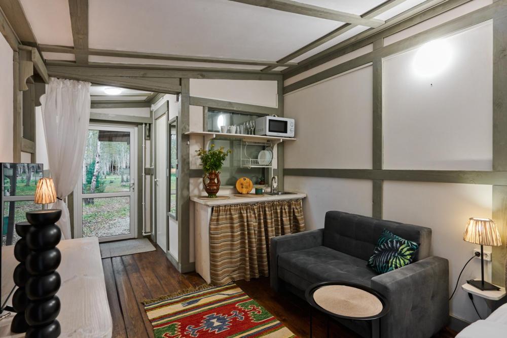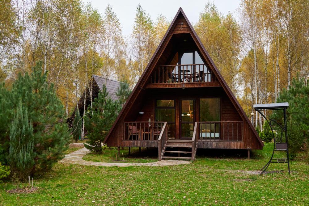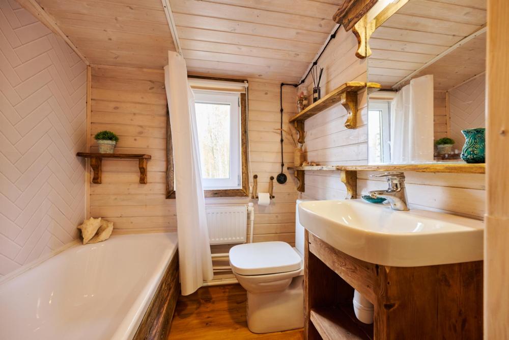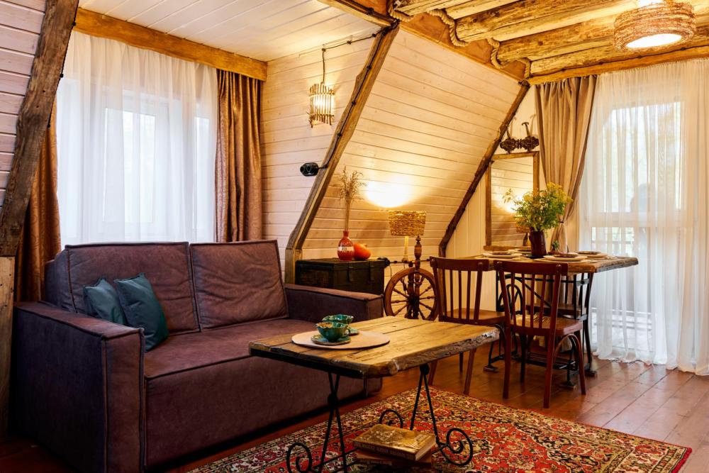 Дом в деревенском стиле с оригинальной отделкой слэбами. На первом этаже - гостиная с диваном (здесь может быть организовано два дополнительных места) и электрокамином, обеденный стол, кресло-качалка, мини-кухня с индукционной плитой, посудой для приготовления и набором столовой посуды. Элементы интерьера сделаны вручную. Спальня с двуспальной кроватью (140х200см) расположена на втором уровне. Здесь есть небольшой балкончик. В санузле - ванная, умывальник, унитаз, фен, зубной набор, полотенца. В дозаторе над ванной – «гель/шампунь в одном» хорошего качества. В доме нет кондиционера, но это не помешает комфортному отдыху на природе.