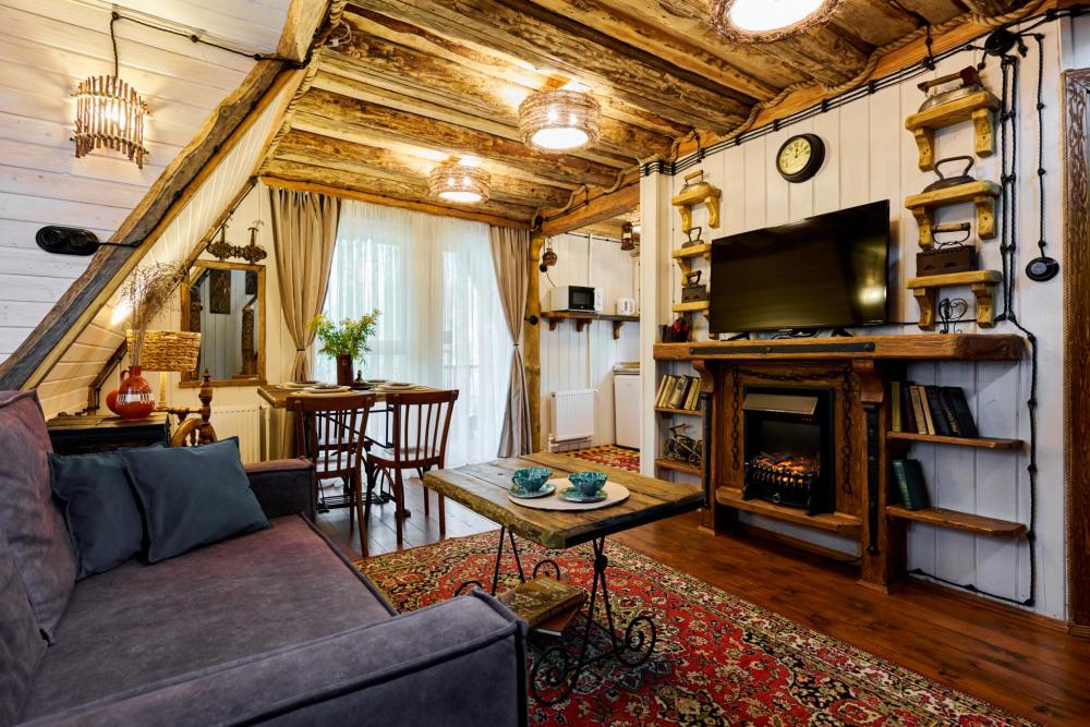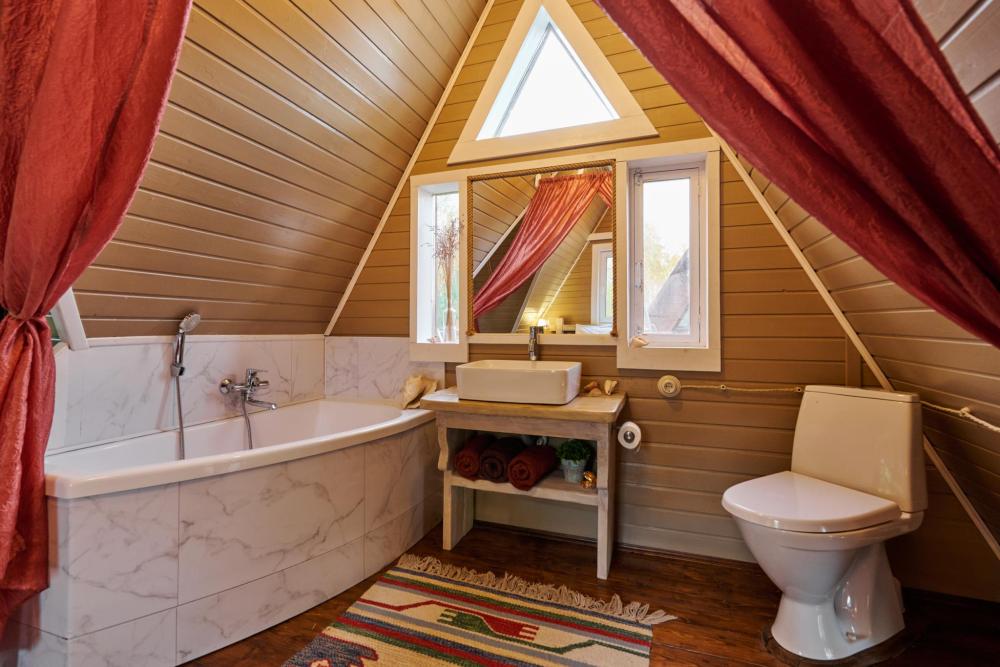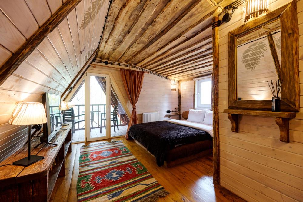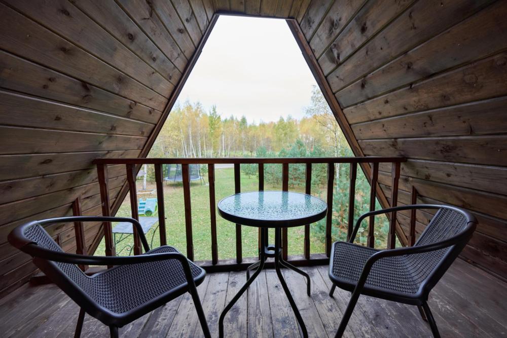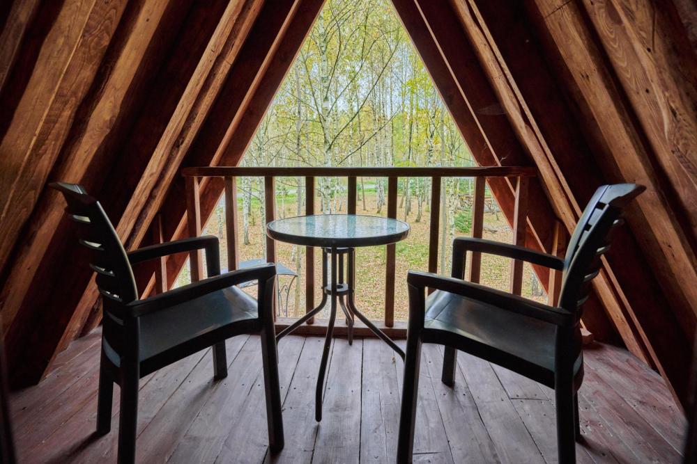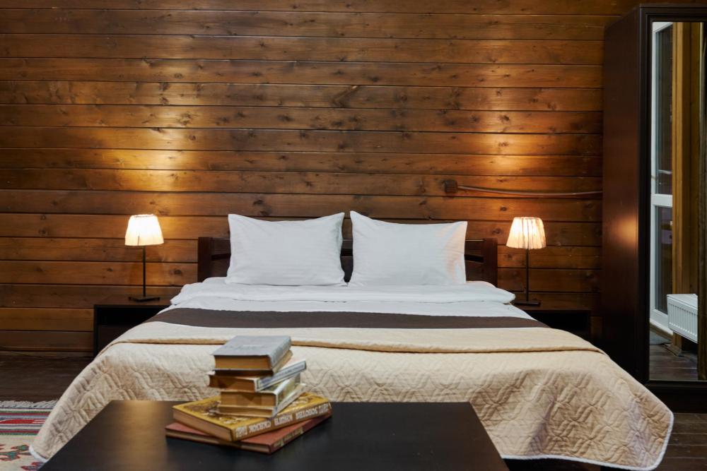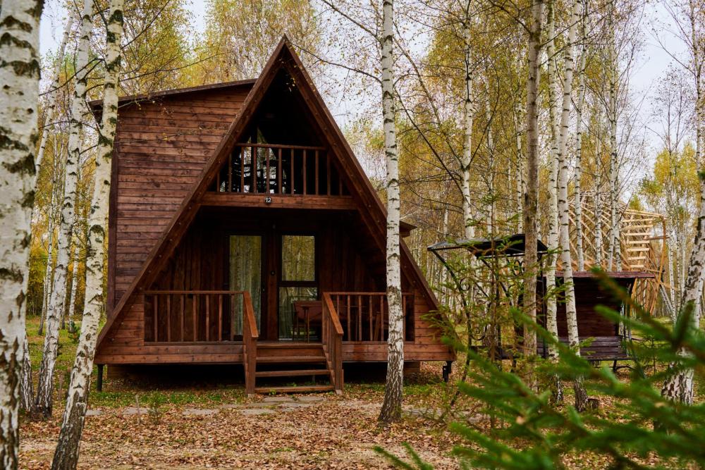 Дом в деревенском стиле с оригинальной отделкой слэбами. На первом этаже - гостиная с диваном (здесь может быть организовано два дополнительных места) и электрокамином, обеденный стол, кресло-качалка, мини-кухня с индукционной плитой, посудой для приготовления и набором столовой посуды. Элементы интерьера сделаны вручную. Спальня с двуспальной кроватью (140х200см) расположена на втором уровне. Здесь есть небольшой балкончик. В санузле - ванная, умывальник, унитаз, фен, зубной набор, полотенца. В дозаторе над ванной – «гель/шампунь в одном» хорошего качества. В доме нет кондиционера, но это не помешает комфортному отдыху на природе.