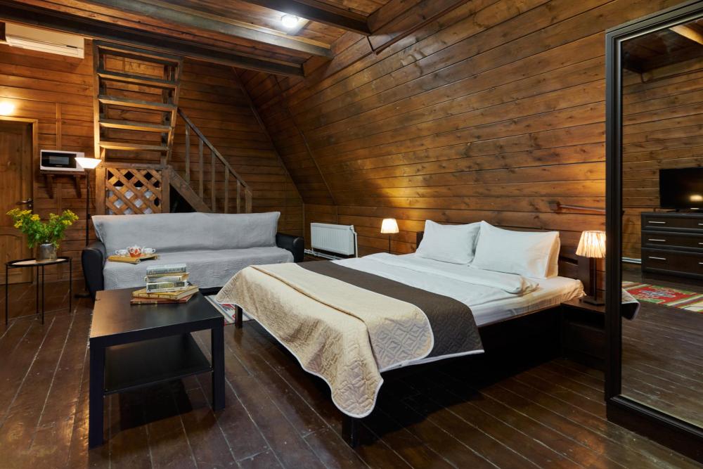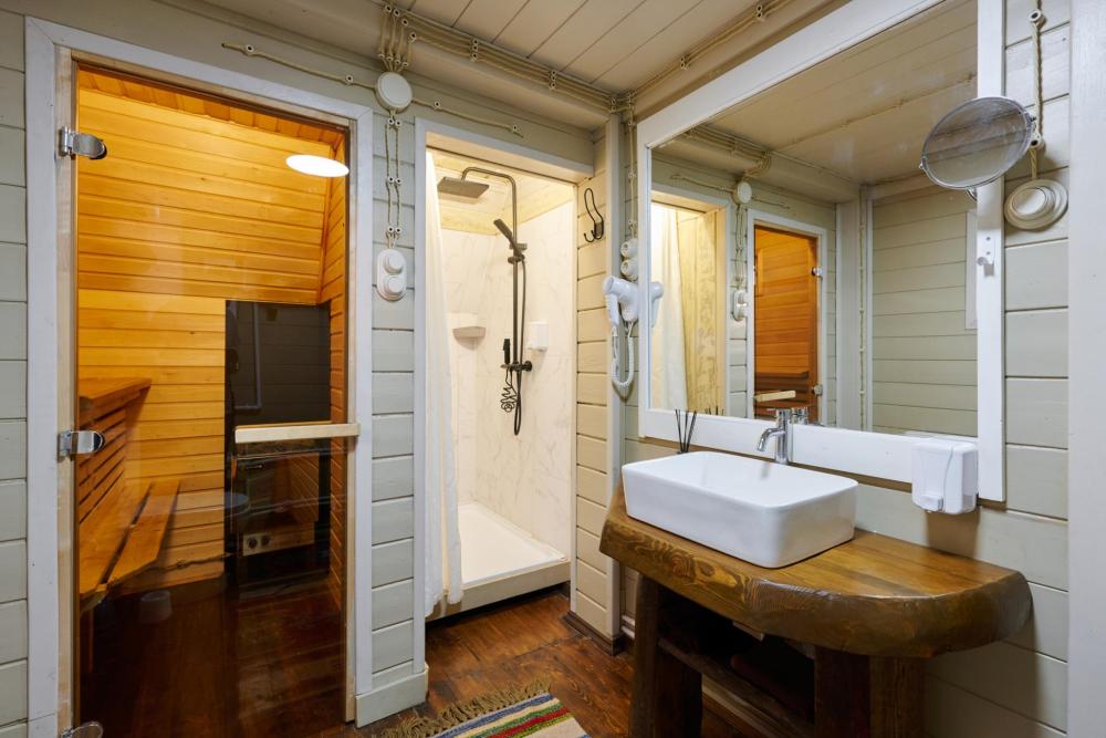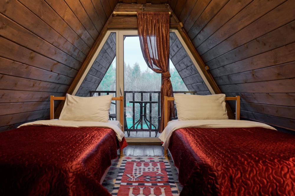Дом люкс двухместный с возможностью заселения еще 2 человек. Спальные места 2 раздельные кровати на 2 этаже, раскладной диван на 1 этаже. На 1 этаже расположена мини кухня со всем необходимым оборудованием и посудой, телевизор, стол, дровяная печь,диван, санузел с сауной и стиральной машиной. На втором этаже санузел с ванной , телевизор, 2 раздельные кровати,балкон.