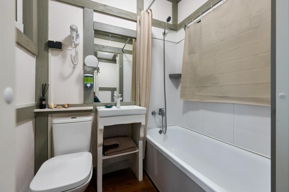 Милый одноэтажный дом, классический "афрейм". Подойдет для отдыха вдвоем или для любителей побыть в одиночестве. В домике компактно собраны все традиционные и нужные для проживания элементы - двуспальная широкая кровать, диван на случай, если будет третий Гость, телевизор, мини-кухня с микроволновкой, индукционной плитой, холодильником. Есть чайник, посуда для приготовления еды и столовая посуда, разделочная доска, нож. В санузле - ванна, раковина, унитаз, фен. В дозаторе над ванной - гель/шампунь в одном хорошего качества В санузле на первом этаже - сауна, душ, умывальник, унитаз, фен, зубной набор, полотенца. В дозаторе в ванной и душевой - "гель/шампунь в одном" хорошего качества