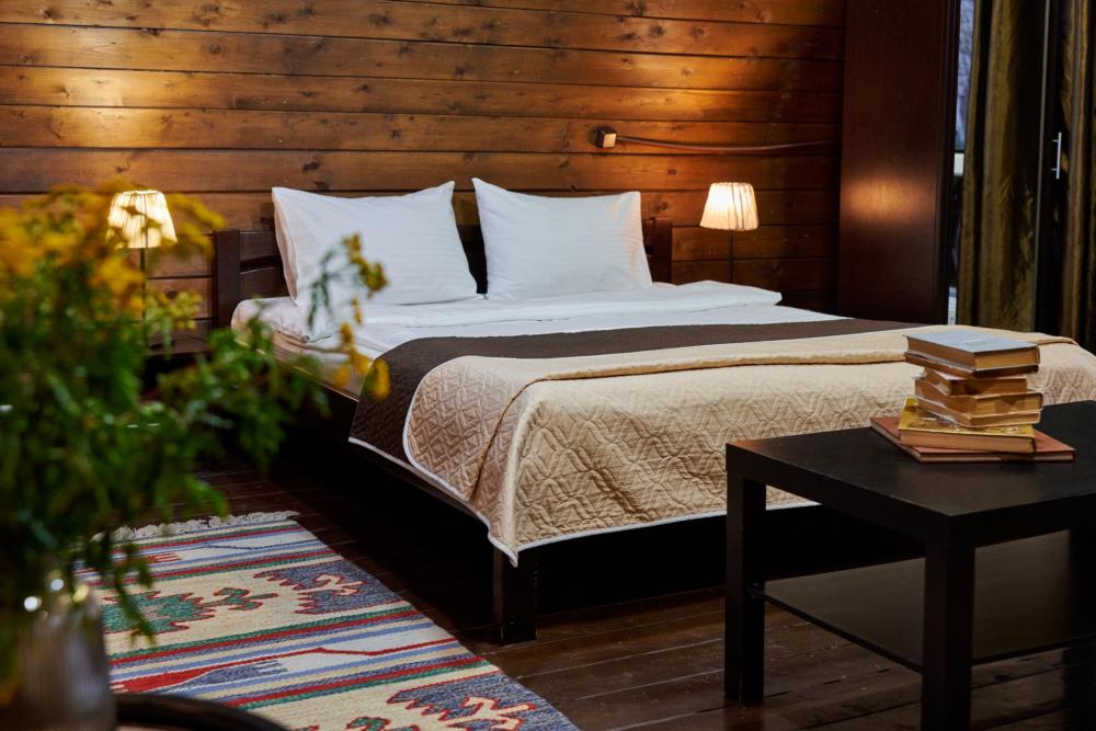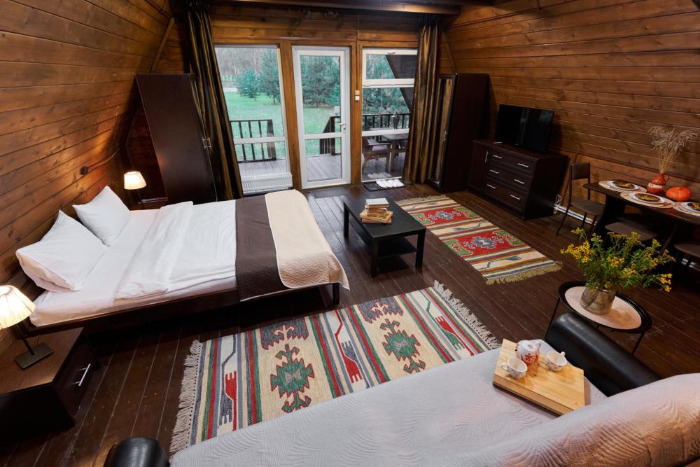 Люкс расположен на втором этаже основного здания. Площадь номера – 39,8 кв.м. Большая кровать, полноценная кухня, обеденный уголок с мягкими креслами, большая ванная комната - все создает атмосферу, когда не хочется никуда спешить, подольше пожить загородом, подышать свежим воздухом, полюбоваться природой.