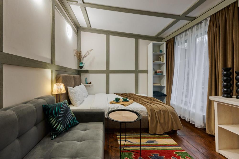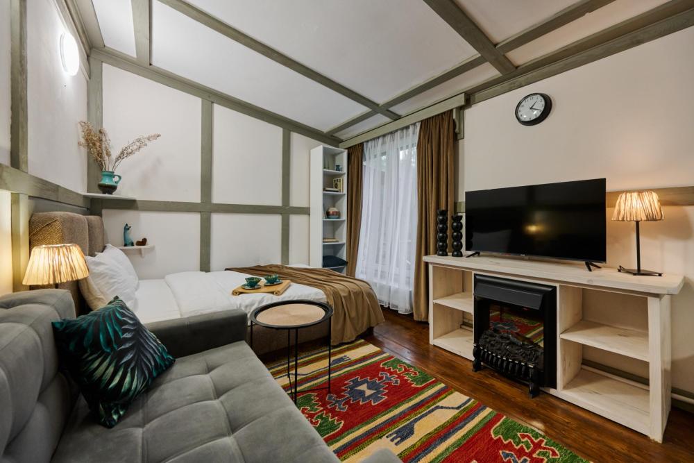 Окруженный березами, с большой своей территорией расположился домик в стиле фахверк на два номера. Этот двухместный номер – часть дома. У номера своя терраса, мангальная площадка. Внутри традиционная обстановка - двуспальная кровать, телевизор, столик. На кухне - индукционная плита, чайник, посуда, холодильник, столовая посуда, приборы, разделочная доска, нож. В санузле – ванна, умывальник, унитаз, фен, зубной набор, полотенца. В дозаторе в ванне – «гель/шампунь в одном» хорошего качества. Для третьего Гостя место можно организовать на диване