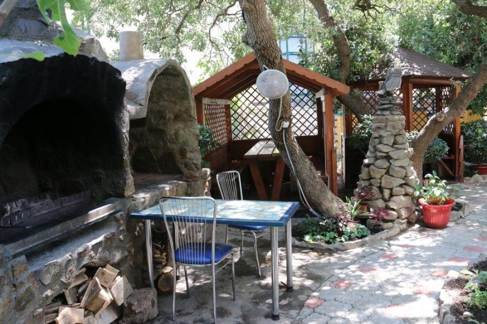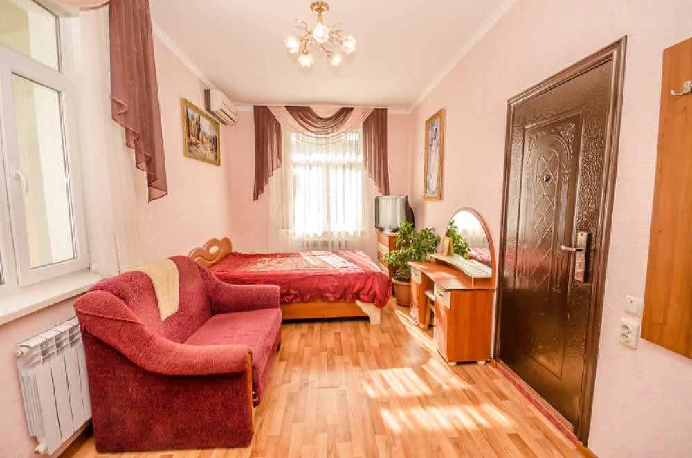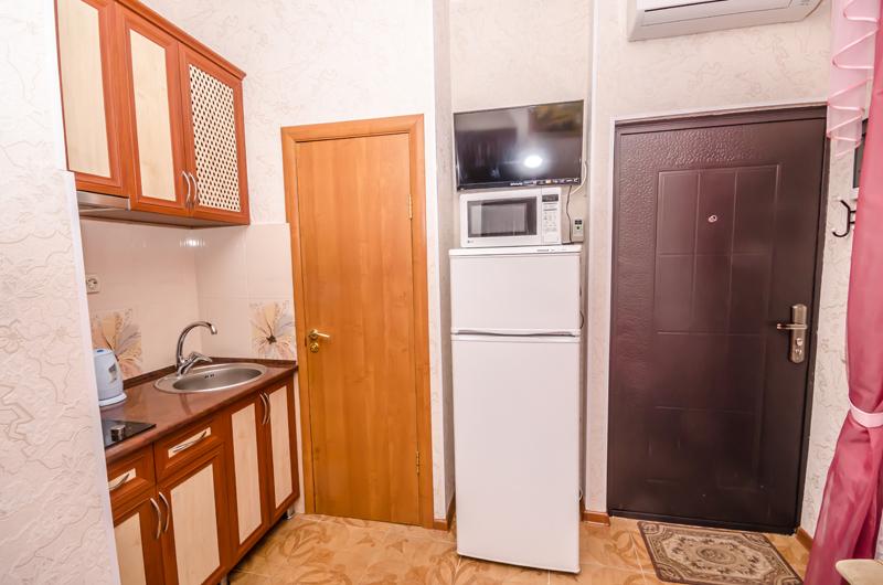 Комната находится на третьем этаже. Есть общий проходной балкон на две комнаты. Вид с балкона во дворик, видно море. Кондиционер, телевизор, Wi-Fi, стиральная машина. Двуспальная кровать, диванчик, постельные принадлежности, шкаф-пенал, журнальный столик, табурет. Мини-кухня с электроплитой, вытяжкой, шкафчиками, рабочей поверхностью, раковиной. Холодильник, электрочайник, микроволновая печь. Кастрюли, сковородки, стаканы, кружки, тарелки, ложки, вилки, нож, досточка, открывашка, губка и тряпочка для посуды/стола, моющее средство для посуды. Ванная комната с туалетом, раковина с зеркалом, бойлер, полотенцесушитель, фен, утюг, банные и лицевые полотенца, туалетная бумага, мыло.