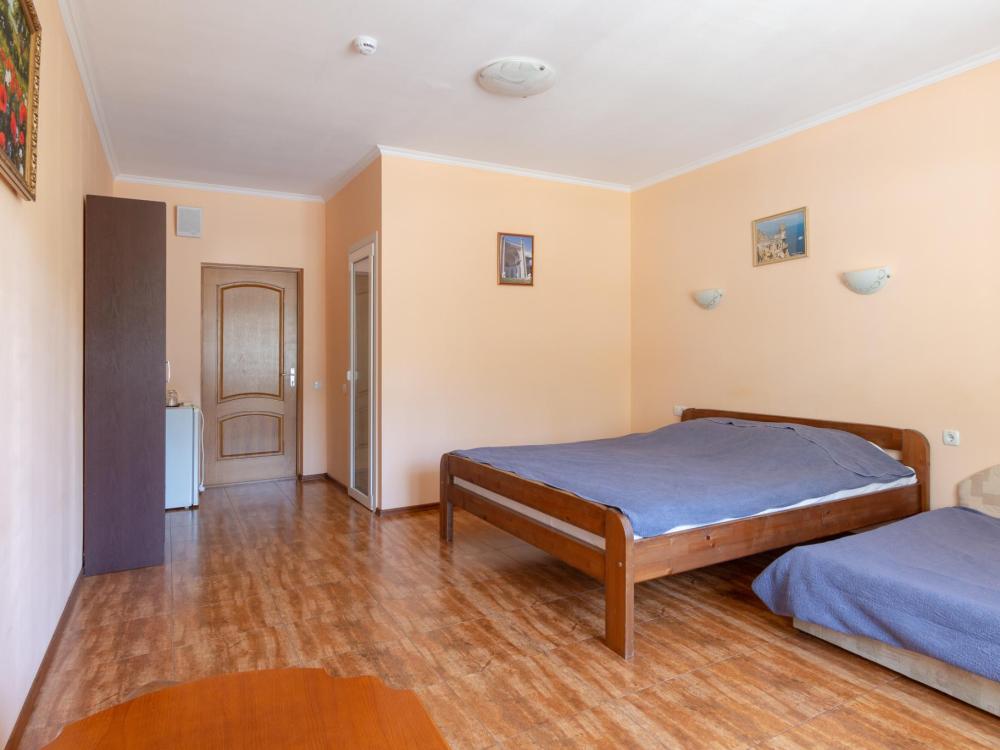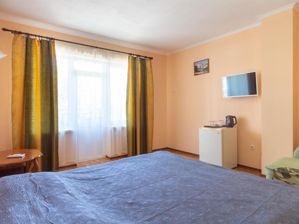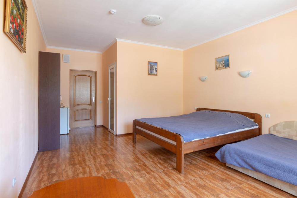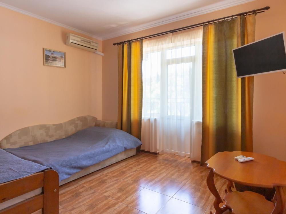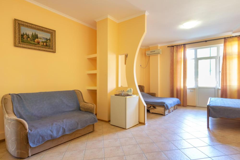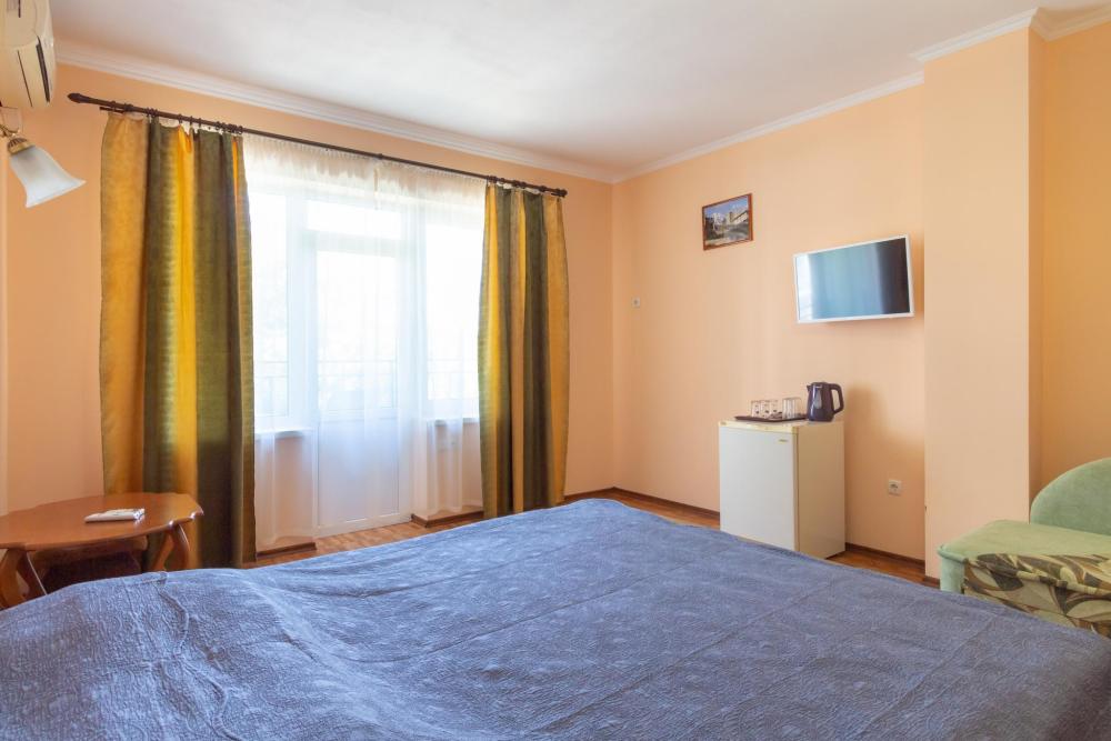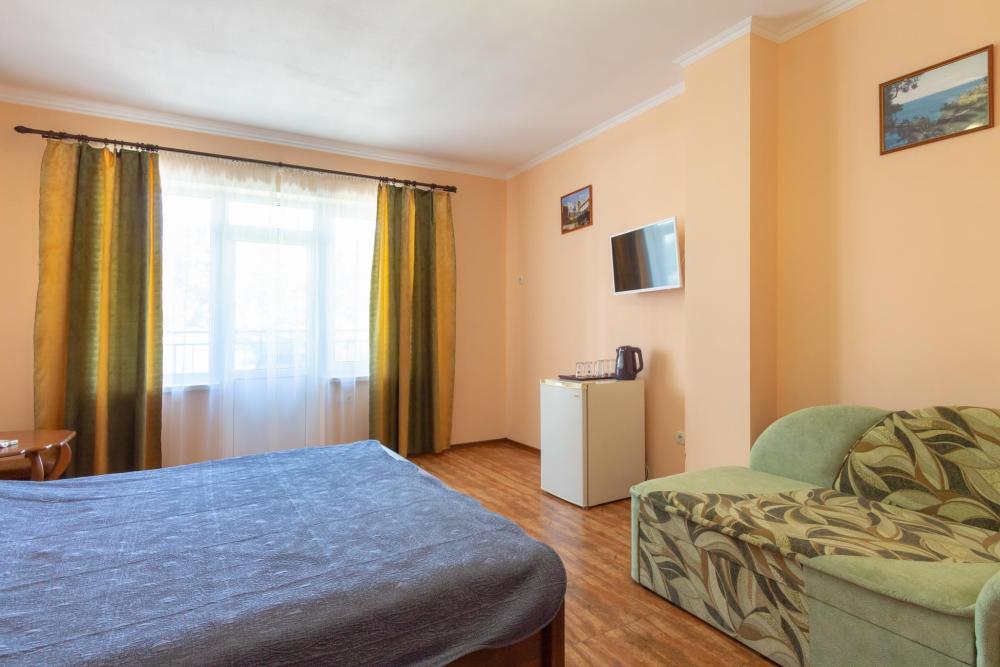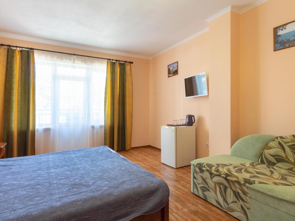 Номер стандарт четырехместный общей площадью 24 кв.м. с видом на море. Номер оснащен: шкаф, тумбочки, кровать двуспальная, диван-кровать, журнальный столик, балкон, посуда, техника (телевизор, кабельное ТВ, холодильник, электрочайник, кондиционер, сейф), санузел и душ в номере.