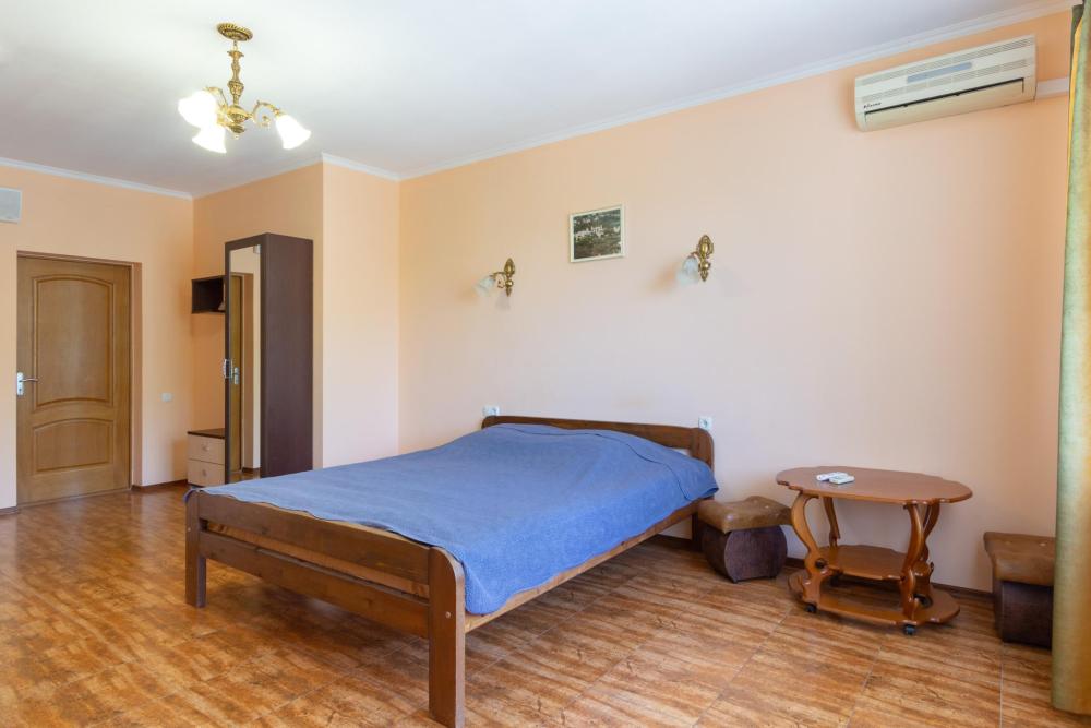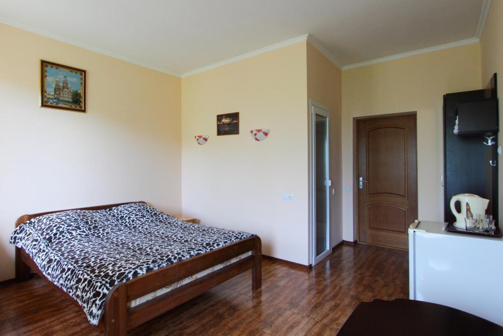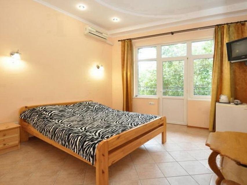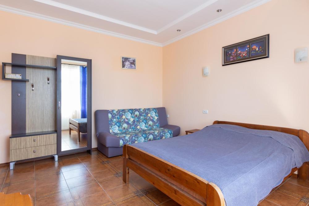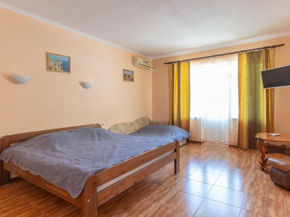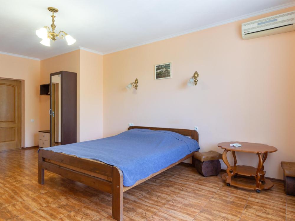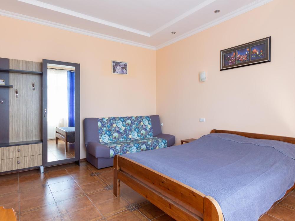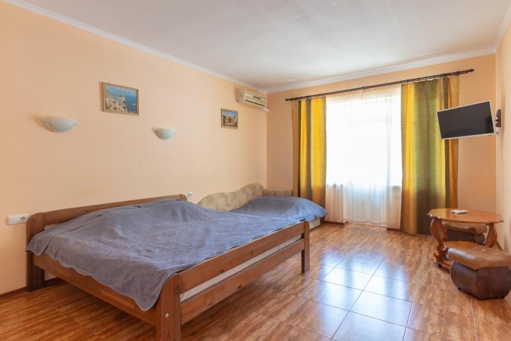 Номер стандарт четырехместный общей площадью 24 кв.м. с видом на море. Номер оснащен: шкаф, тумбочки, кровать двуспальная, диван-кровать, журнальный столик, балкон, посуда, техника (телевизор, кабельное ТВ, холодильник, электрочайник, кондиционер, сейф), санузел и душ в номере.