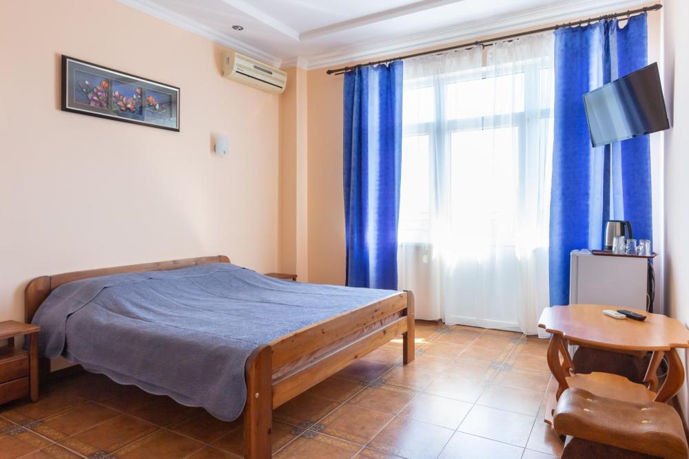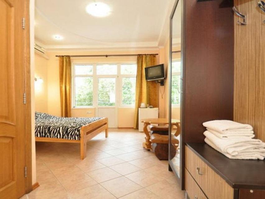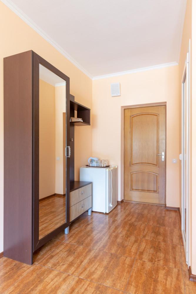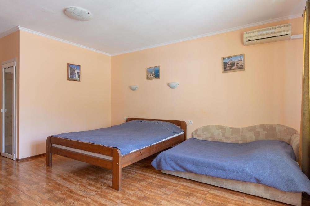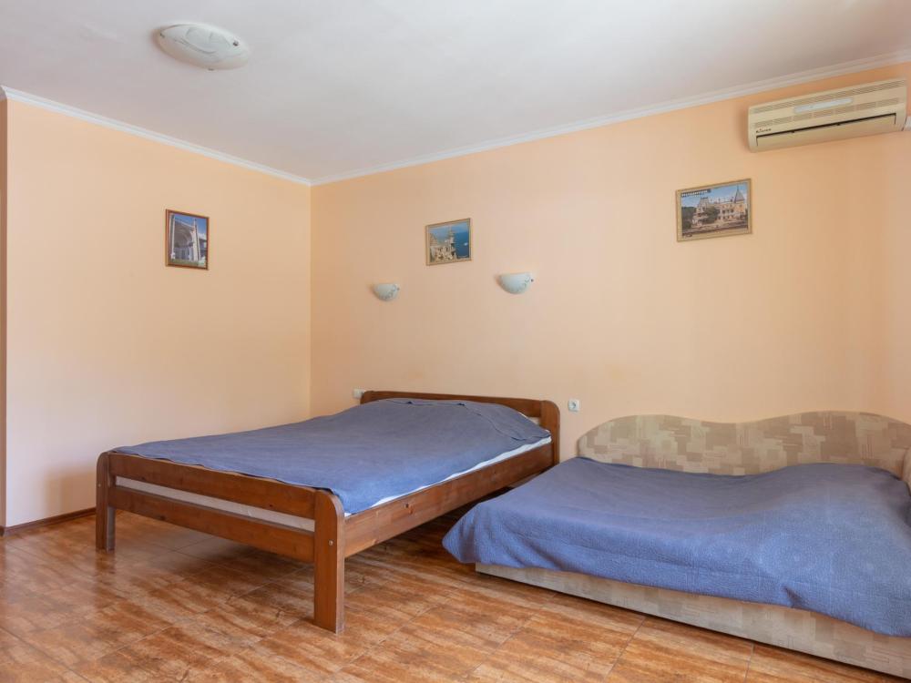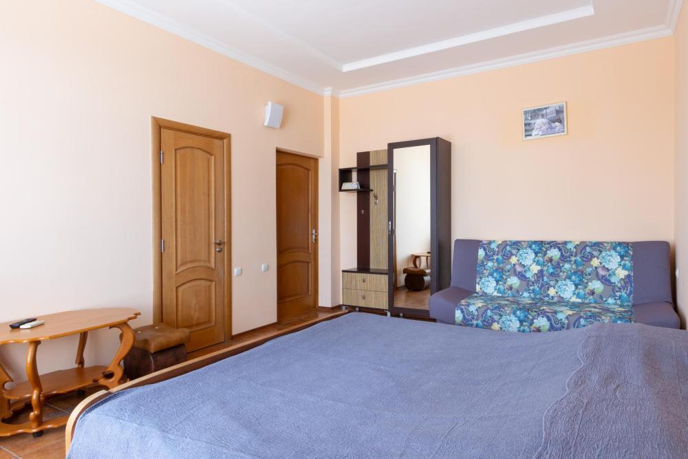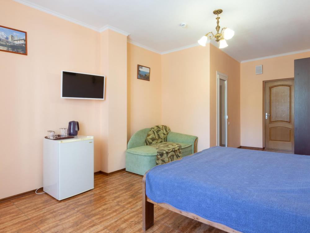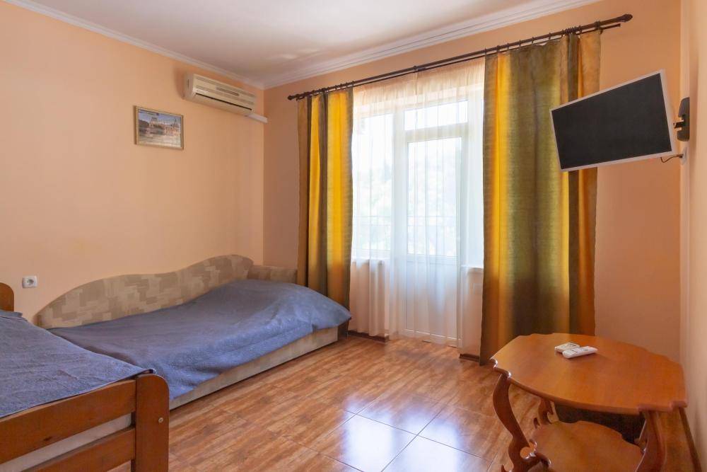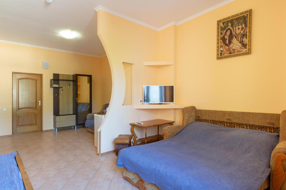 Номер стандарт четырехместный общей площадью 24 кв.м. с видом на море. Номер оснащен: шкаф, тумбочки, кровать двуспальная, диван-кровать, журнальный столик, балкон, посуда, техника (телевизор, кабельное ТВ, холодильник, электрочайник, кондиционер, сейф), санузел и душ в номере.