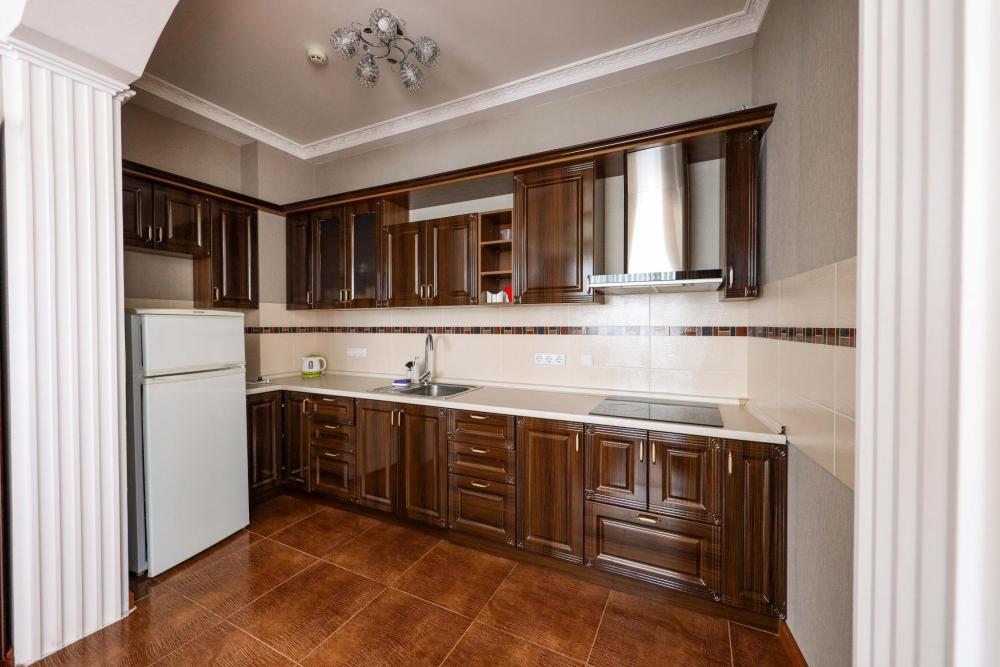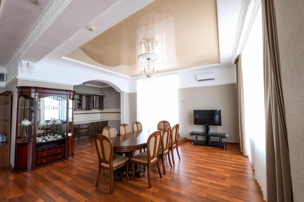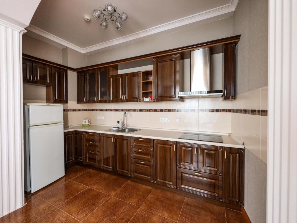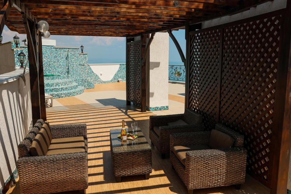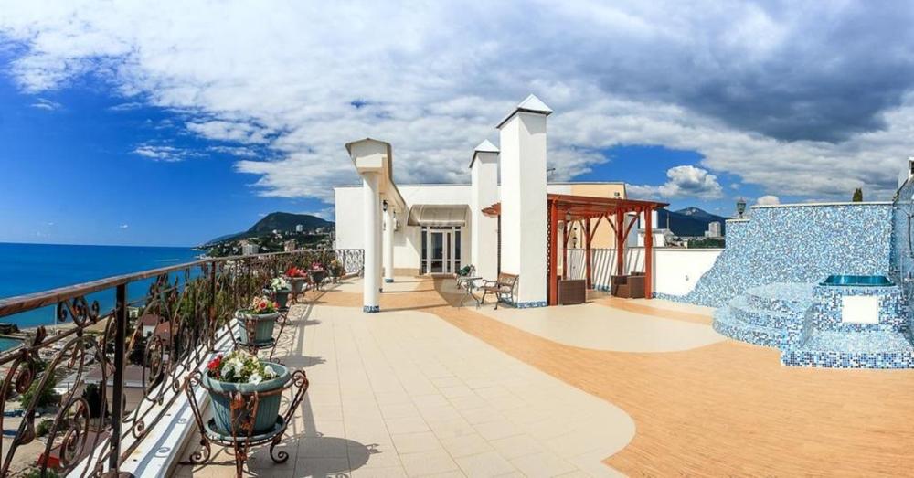 Апартаменты люкс идеально сочетают в себе удобства семейного номера, оформление выдержано в стиле «минималистская роскошь», оснащенные гостиной 63,1м2 (мягкий диван, обеденный стол, телевизор LCD, WI-FI интернет, мини-бар), 3 балкона 7,7 м2 с видом на море (столик, 2 кресла), мини-кухней (электрическая плита, холодильник), спальной комнатой 23,6 м2 (двуспальная кровать, сейф, телевизор, кондиционер, прикроватные тумбочки, шифоньер, зеркало, телефон), ванная комната 6,3 м2 (фен, набор мини-парфюмерии, комплект полотенец, халаты, тапочки), сан-узел 2,5 м2, летняя площадка 175 м2, с прекрасно разработанным дизайном, где стоят лежаки для СПА-процедур, джакузи, мангал, цветочная оранжерея, беседка для отдыха.