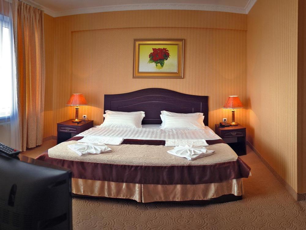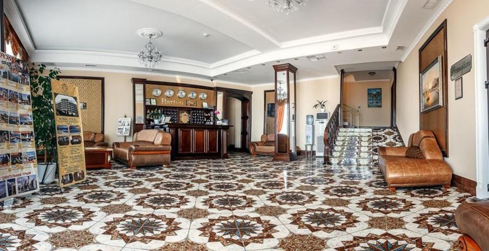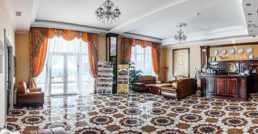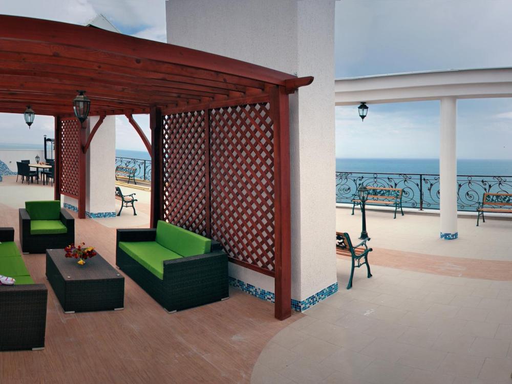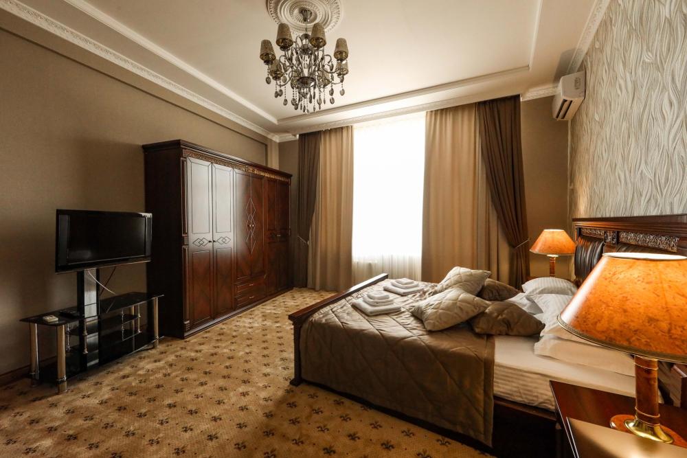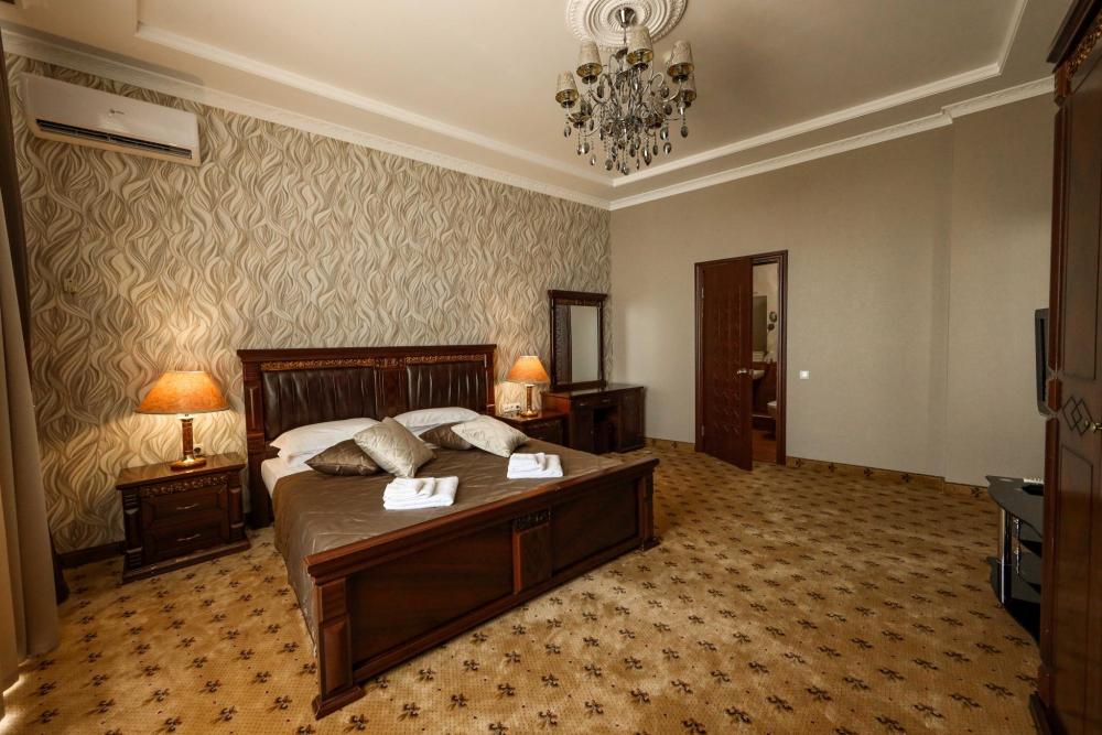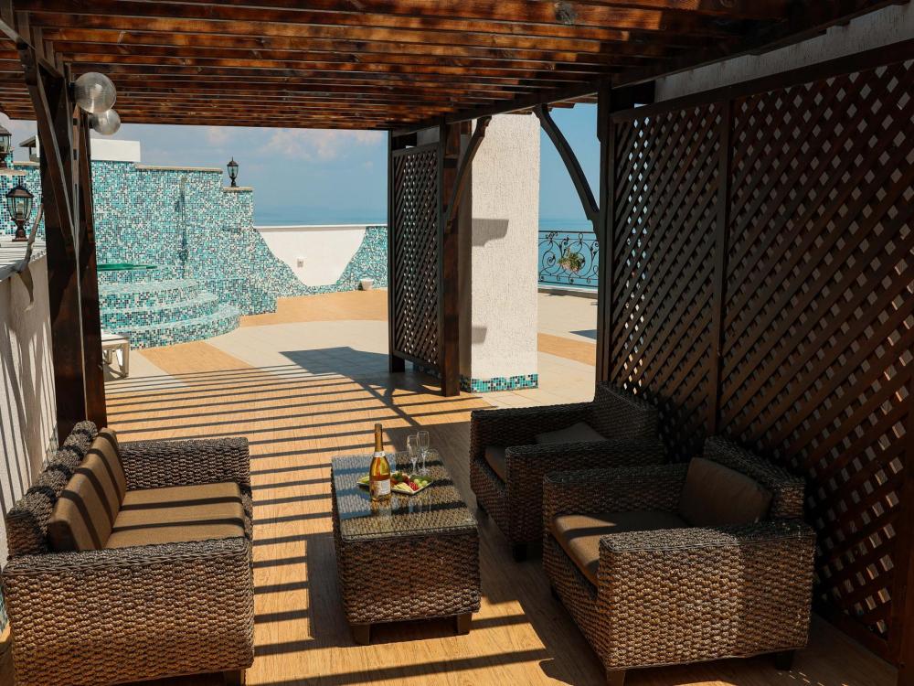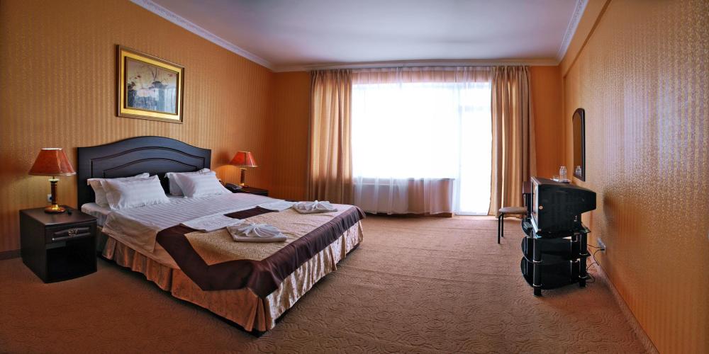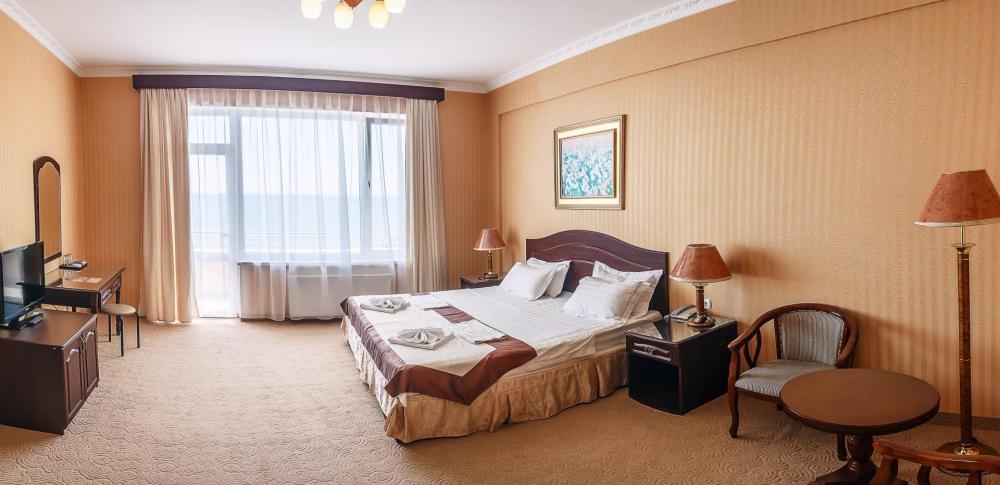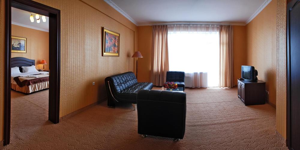 Номер люкс оснащенный комнатой 23,6 м2 с двуспальной кроватью и гостиной 17,8 м2 с мягким диваном, креслами и журнальным столиком, мини-баром, сейфом, телевизором, кондиционером, прикроватными тумбочками, шифоньером, зеркалом, телефоном, 2 балкона 6-8 м2 с видом на море (столик, 2 кресла), ванной комнатой 5,2 м2, феном, набором мини-парфюмерии, комплектом полотенец, халатами, тапочками.