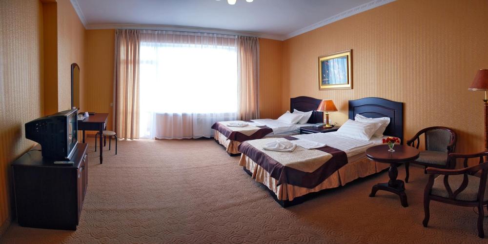 Номер семейный стандарт оснащенный двумя комнатами по 18 м2 с двуспальной и двумя раздельными кроватями. В каждой комнате мини-бар, сейф, телевизор, кондиционер, прикроватные тумбочки, шифоньер, зеркало, телефон, балкон (4-6 м2) с видом на море (столик, 2 кресла), ванная комната (3-4 м2), фен, набор мини-парфюмерии, комплект полотенец, халаты, тапочки.