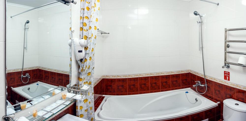 Номер полулюкс общей площадью 40 кв.м. для размещения до 2-х гостей. Номер оснащен двуспальной или двумя раздельными кроватями, мини-баром, сейфом, телевизором, кондиционером, прикроватными тумбочками, шифоньером, зеркалом, телефоном, столиком с 2-мя креслами, балконом (7,7 м2) с видом на море (столик, 2 кресла), ванной комнатой (3-4 м2), феном, набором мини-парфюмерии, комплектом полотенец, халатами, тапочками.