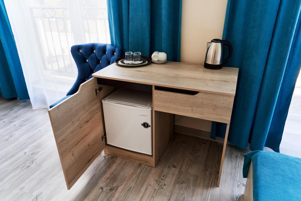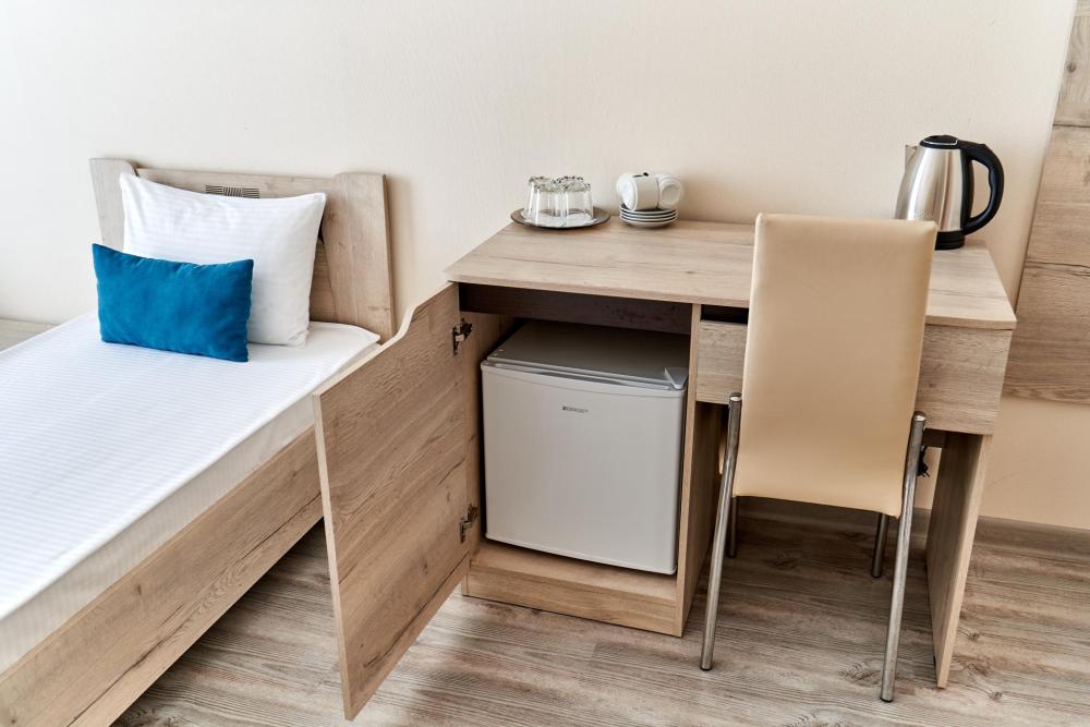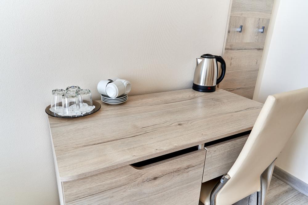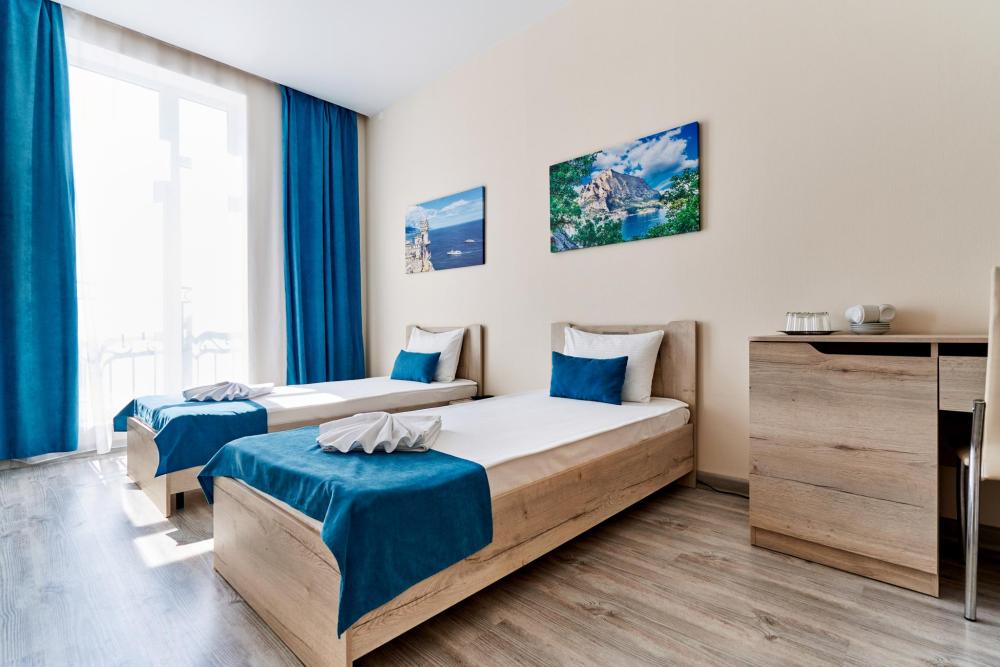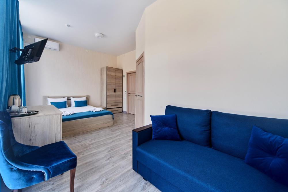 Просторный, уютный однокомнатный номер студия общей площадью 22 кв.м. с современными кроватями спринг-бокс. Дополнительным местом является раскладной полуторный диван. Номер идеально подходит как для семейного отдыха, так и для тех кто приезжает в командировку для работы. Оснащение номера: WIFI, современные кровати, ТВ, кондиционер, центральное отопление, набор банных полотенец, пляжные полотенца, тапочки, мини парфюмерия при заезде, с/у с душевой кабиной, холодильник, чайник.