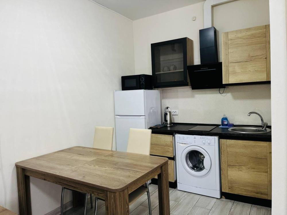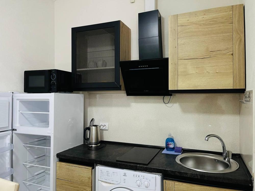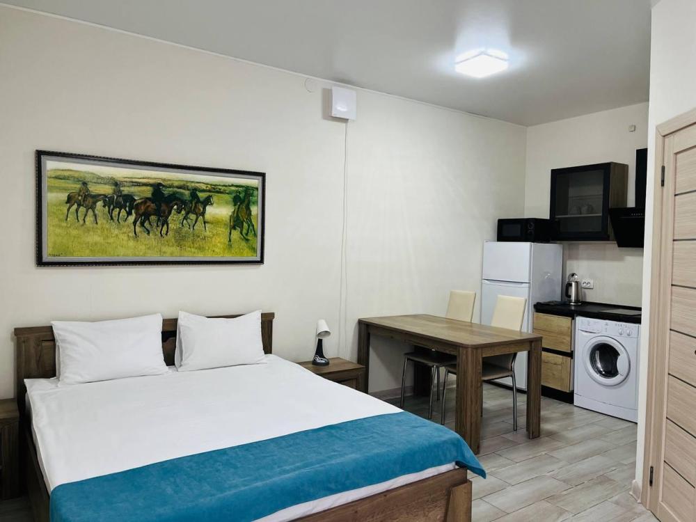 Номер «Студия с кухней» имеет площадь 14 м2, В номере размещены: - плазменная панель, - индивидуальная система кондиционирования, - шкаф для хранения одежды, - прикроватная тумба, - санузел с душевой, - фен, - набор мягких махровых полотенец. - мини-парфюмерия. Комната рассчитана на проживание от 1-го до 2-х человек.