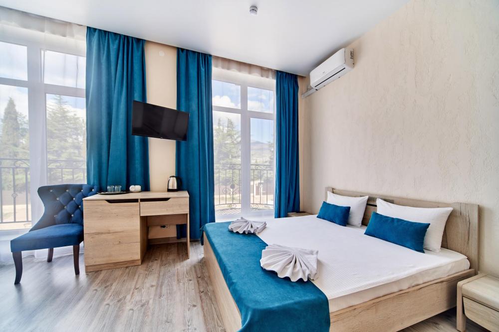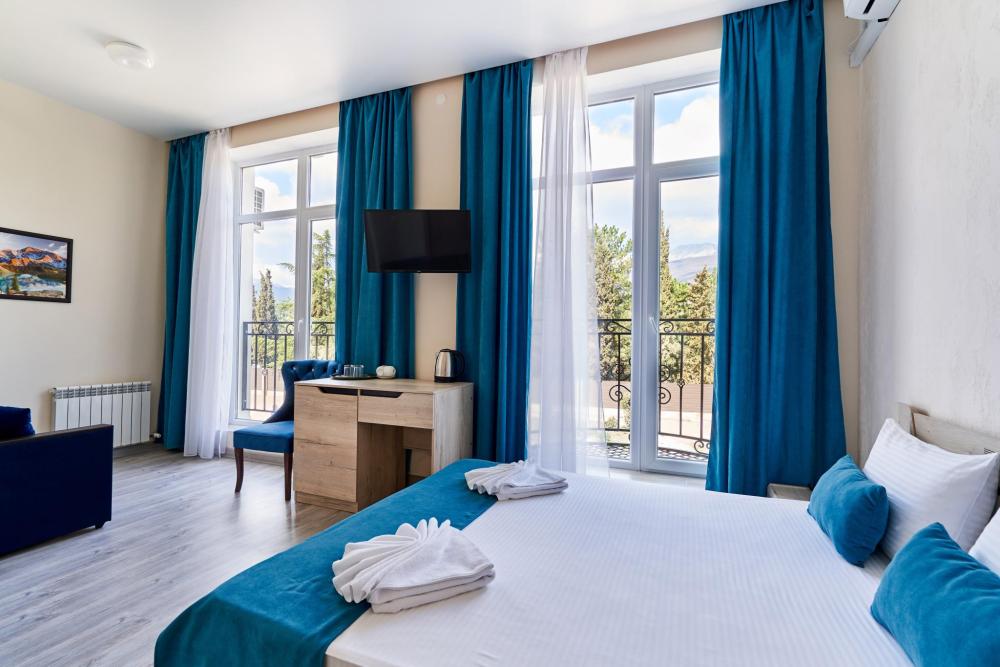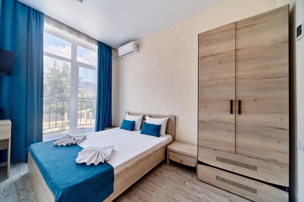 Однокомнатный номер стандарт улучшенный общей площадью 17 кв.м. оснащенный современными кроватями спринг-баксами. Номера расположены на втором и третьем этаже отеля, вид из окон на бассейн и море, либо на горы. В номере данной категории есть возможность разместить третьего гостя на дополнительном месте. Оснащение номера: WIFI, современные кровати, ТВ, кондиционер, центральное отопление, набор банных полотенец, пляжные полотенца, тапочки, мини парфюмерия при заезде, с/у с душевой кабиной.
