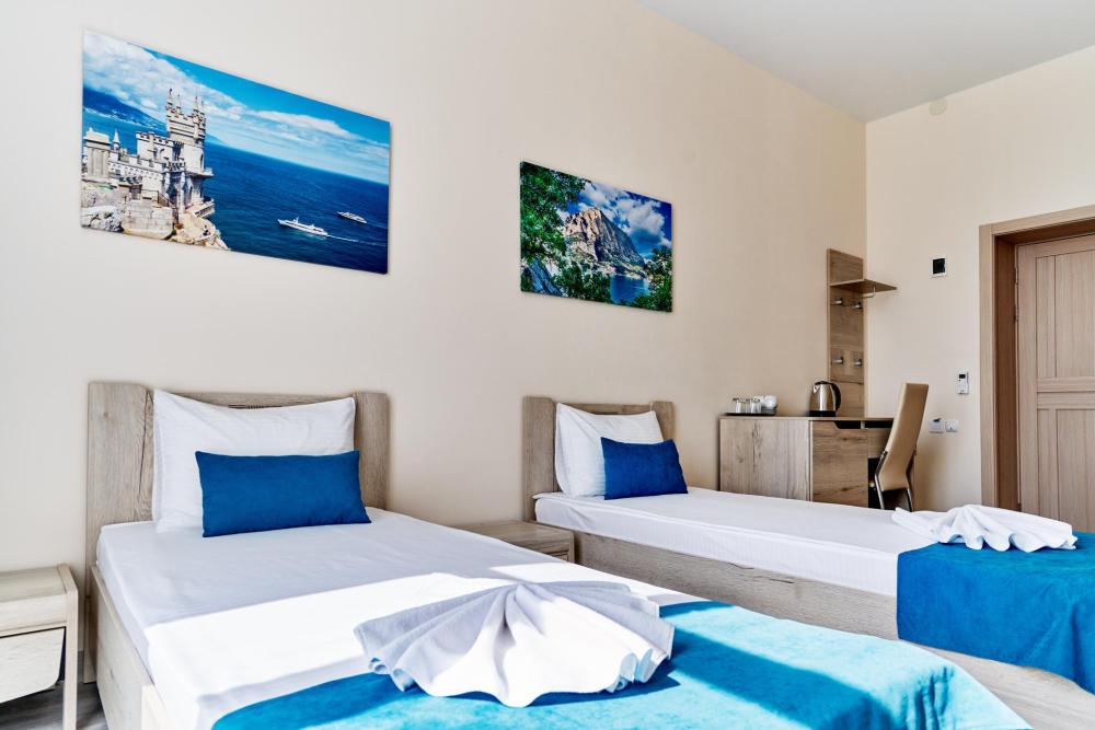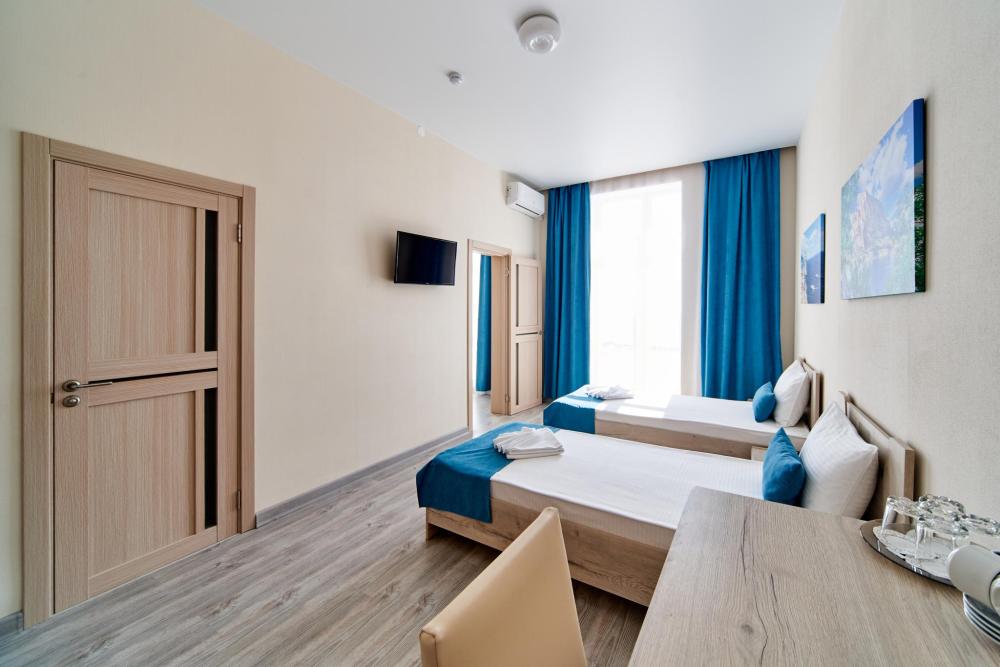 Уютный современный 2х комнатный номер семейный общей площадью , где она комната проходная с раздельными кроватями, вторая спальня с двуспальной кроватью. В номере комфортно становиться детская кроватка, для самых маленьких наших гостей. Номер отлично подходит для размещения как большой семьи, так и дружной компании. Оснащение номера: WIFI, современные кровати, ТВ, кондиционер, центральное отопление, набор банных полотенец, пляжные полотенца, тапочки, мини парфюмерия при заезде, с/у с душевой кабиной.