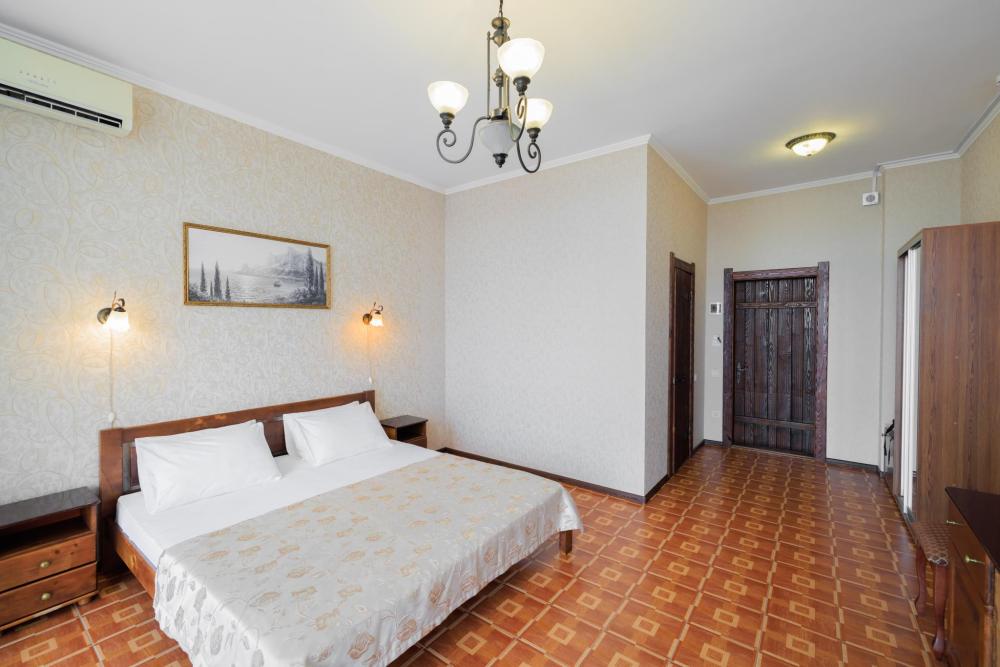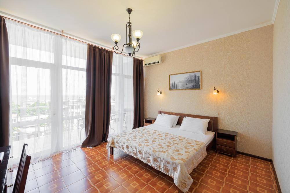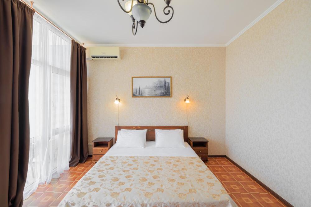 Номера категории «Улучшенный ЮГ» - просторные, удобные, меблированные, с двуспальной кроватью, прикроватными тумбами, шкаф-купе, стол,LCD телевизор со спутниковым телевидением, кондиционер, холодильник, для вашего комфорта в номере находится электрочайник, фен. В санузле расположена удобная ванна с круглосуточной подачей холодной и горячей воды. Вид с балкона открывается на сторону моря.