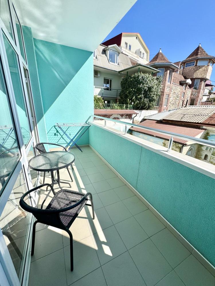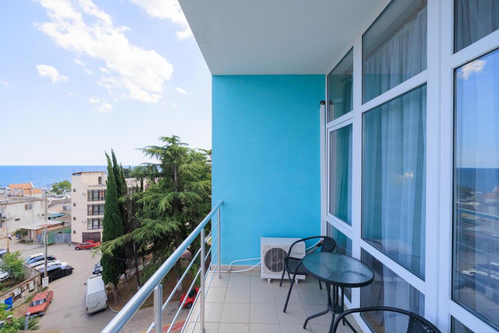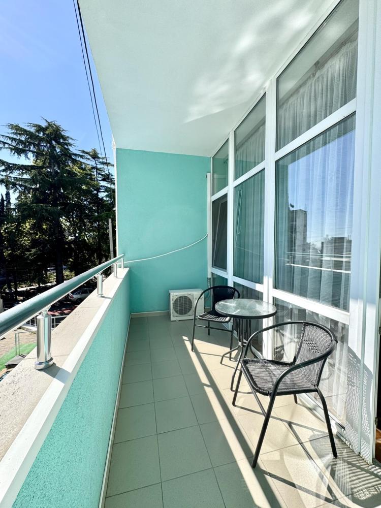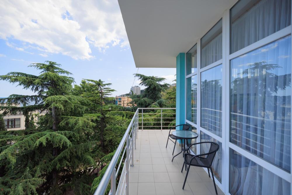Номера категории «Джуниор Сюит ЮГ» - изысканный интерьер сочетает комфорт и уют, окна в пол открывают панорамный вид на сторону моря и хвою сквера. Балкон с мебелью охватывает номер с двух сторон по его периметру. В номере имеется двуспальная кровать, раскладной диван, который предусматривает комфортное дополнительное место или может служить уютным местом для отдыха в сочетании с журнальным столиком. LCD телевизор с диагональю 108 см , холодильник и кондиционер. Электрочайник, утюг, фен-наличие этих мелочей сделают ваш отдых по-домашнему уютным. Номер оснащен санузлом с удобной ванной и конечно же бесперебойная подача холодной и горячей воды.