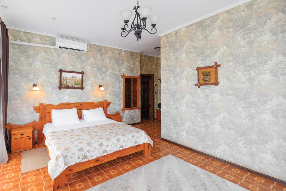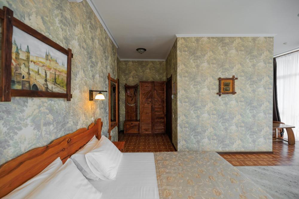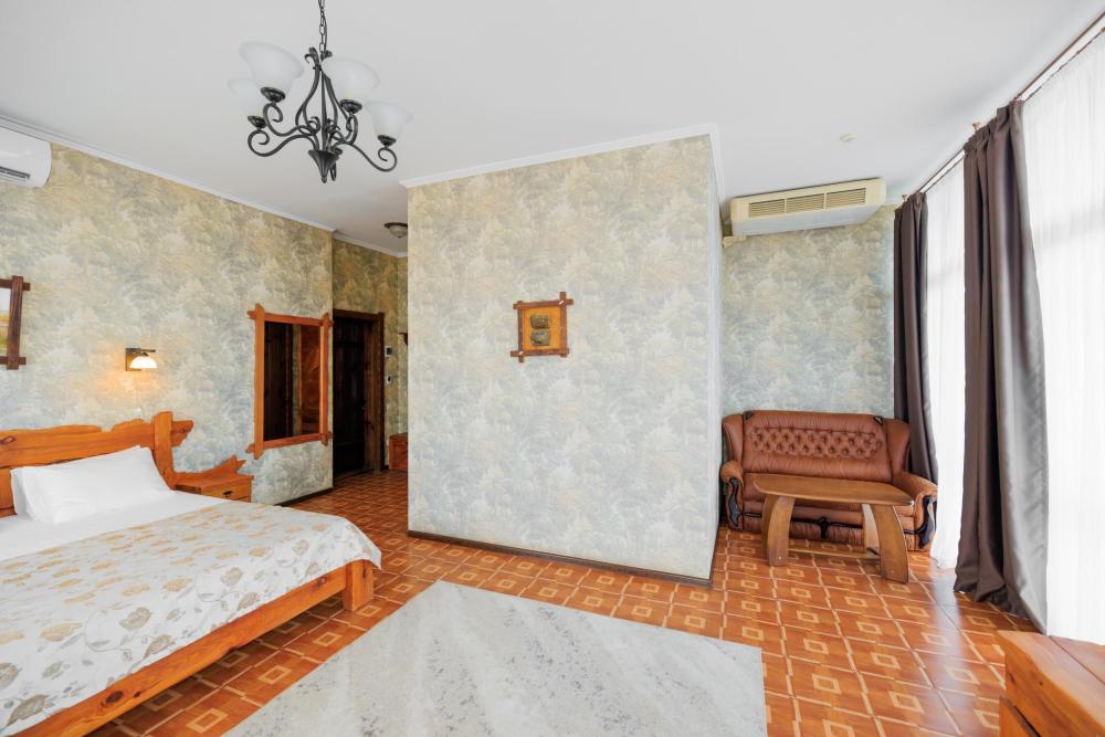Номера категории «Джуниор Сюит (с видом на парк)» - интерьер этого номера особенно отличается от других тем, что здесь практически нет стен, а огромные панорамные окна открывают шикарный панорамный вид, который позволит вам любоваться пейзажем и красотами горного Крыма. Номер оснащен двуспальной кроватью, прикроватными тумбами, раскладной диван и журнальный столик может служить вам не только как уютное место для отдыха, но и как комфортное дополнительное место. Система кондиционирования класса «климат контроль», современный LCD телевизор, холодильник, фен, утюг, электрочайник сделают ваше пребывание у нас более уютным и комфортным. Удобная ванная комната.