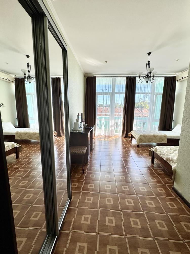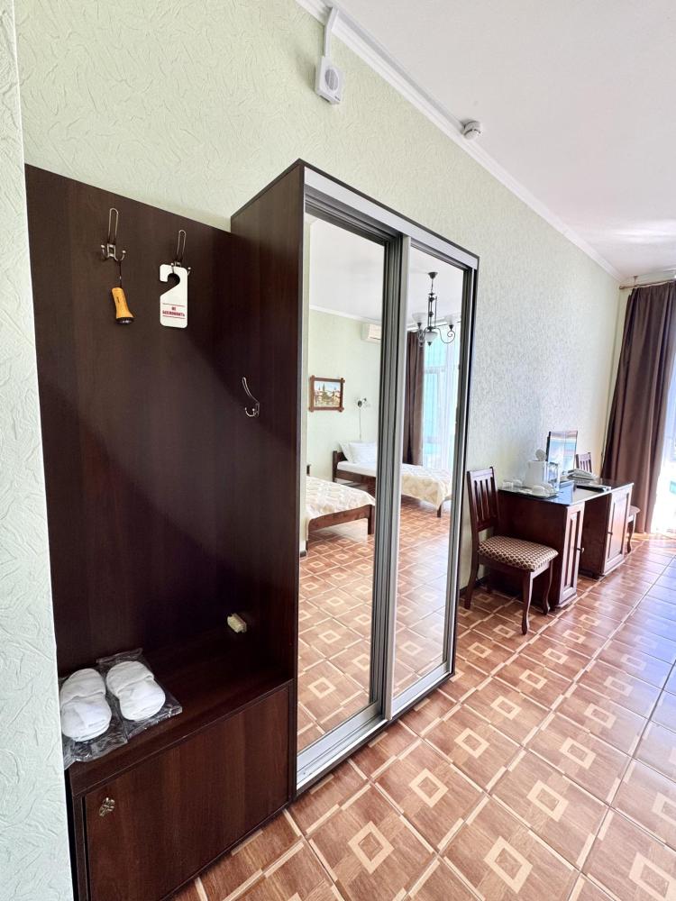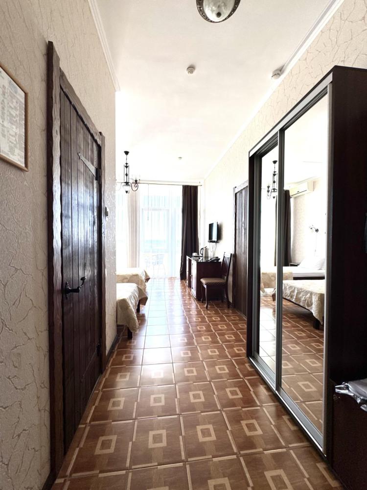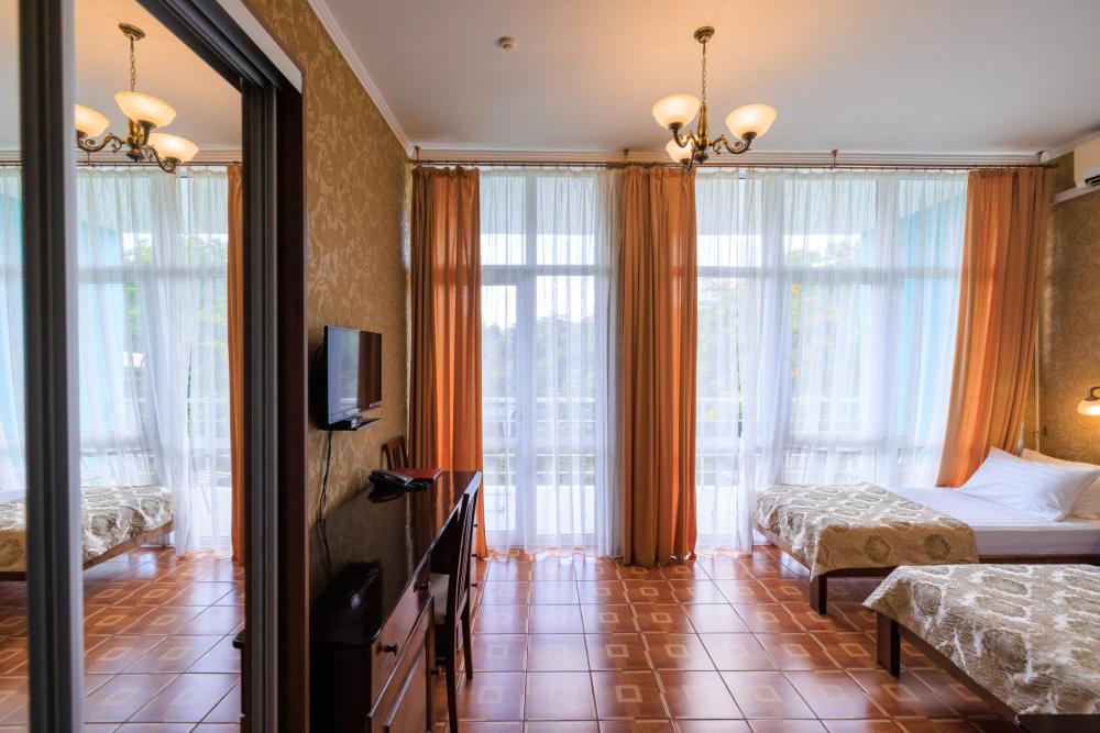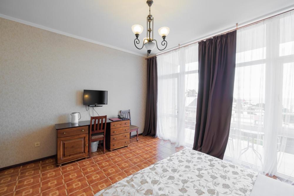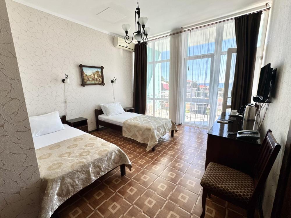 Номера категории «Улучшенный ЮГ» - просторные, удобные, меблированные, с двумя односпальными кроватями, прикроватными тумбами, шкаф-купе, стол,LCD телевизор со спутниковым телевидением, кондиционер, холодильник, для вашего комфорта в номере находится электрочайник, фен. В санузле расположена удобная ванна с круглосуточной подачей холодной и горячей воды. Вид с балкона открывается на сторону моря.
