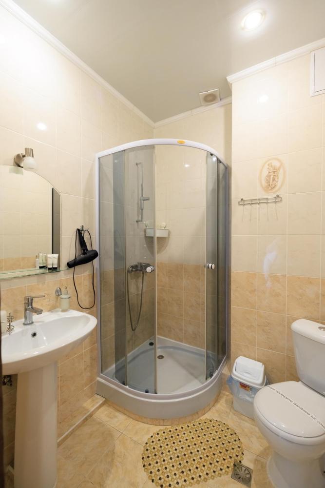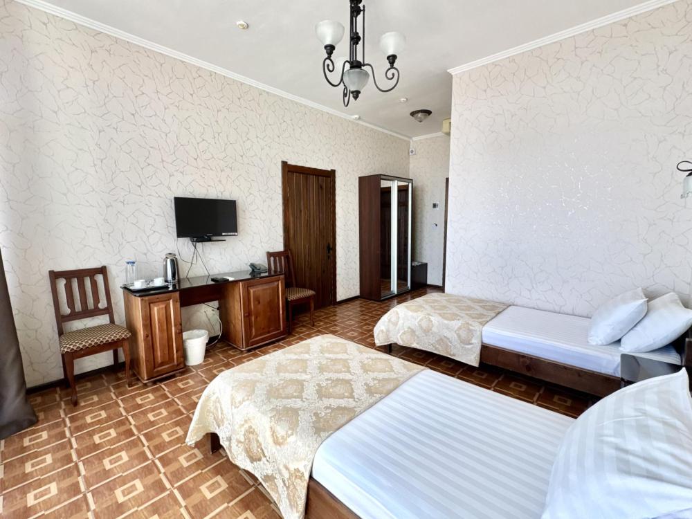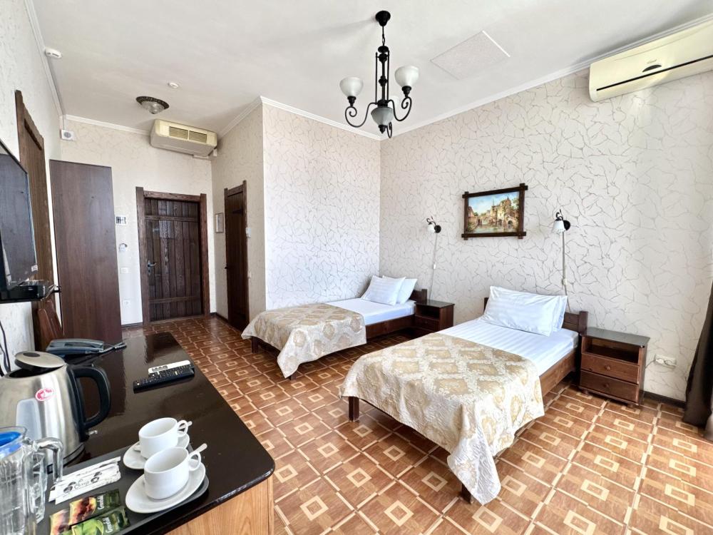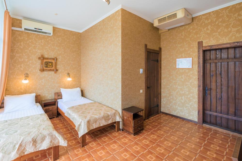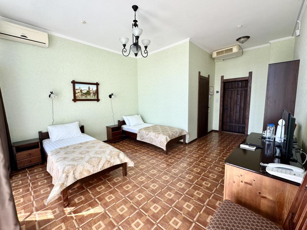 Номера категории «Эконом» - функциональные и удобные, площадью от 16м/кв., имеют все необходимое для комфортного проживания. В номере имеется две односпальные кровати, шкаф-купе, стол, LCD телевизор (спутниковое телевидение), кондиционер, холодильник. Для вашего удобства в номере находится электрочайник, фен. Санузел оснащен душевой кабиной с постоянной подачей холодной и горячей воды. В каждом номере есть балкон, из которого открывается прекрасный вид на хвойный сквер и Крымские горы.