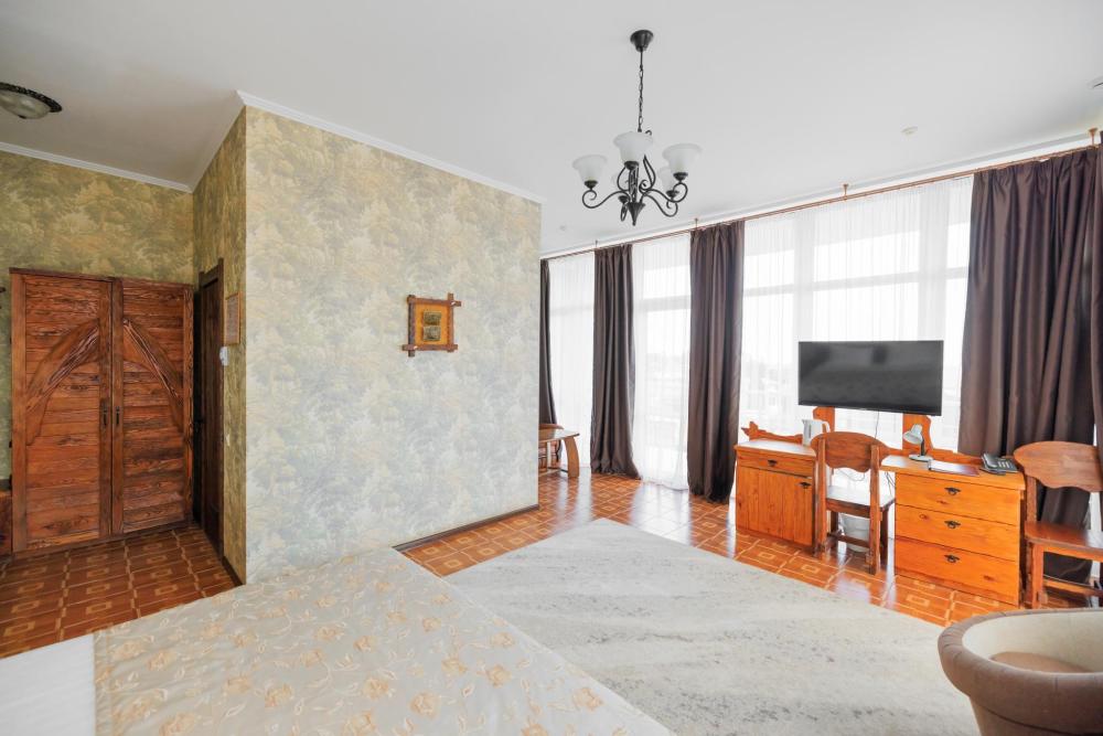 Номера категории «Джуниор Сюит» - изысканный интерьер сочетает комфорт и уют, окна в пол открывают панорамный вид на бассейн и хвою сквера. Балкон с мебелью охватывает номер с двух сторон по его периметру. В номере имеется двуспальная кровать, раскладной диван, который предусматривает комфортное дополнительное место или может служить уютным местом для отдыха в сочетании с журнальным столиком. LCD телевизор с диагональю 108 см , холодильник и кондиционер. Электрочайник, утюг, фен-наличие этих мелочей сделают ваш отдых по-домашнему уютным. Номер оснащен санузлом с удобной ванной и конечно же бесперебойная подача холодной и горячей воды.