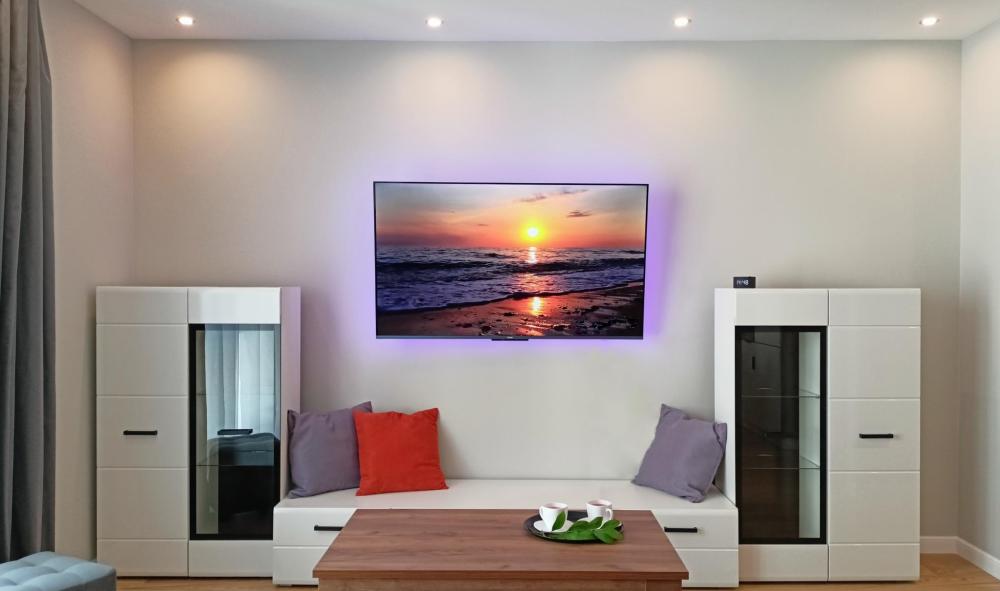 Для просмотра любимых передач и кино - большой современный телевизор (60 дюймов) с функцией Smart TV. Высокоскоростной Wi-Fi, подключено более 200 каналов и бесплатный доступ к онлайн-кинотеатру с множеством новинок кинопроката, мультфильмов для детей «Кинопоиск», «Kion», «Wink» всё подключено специально для Вас.