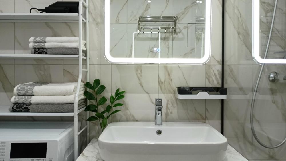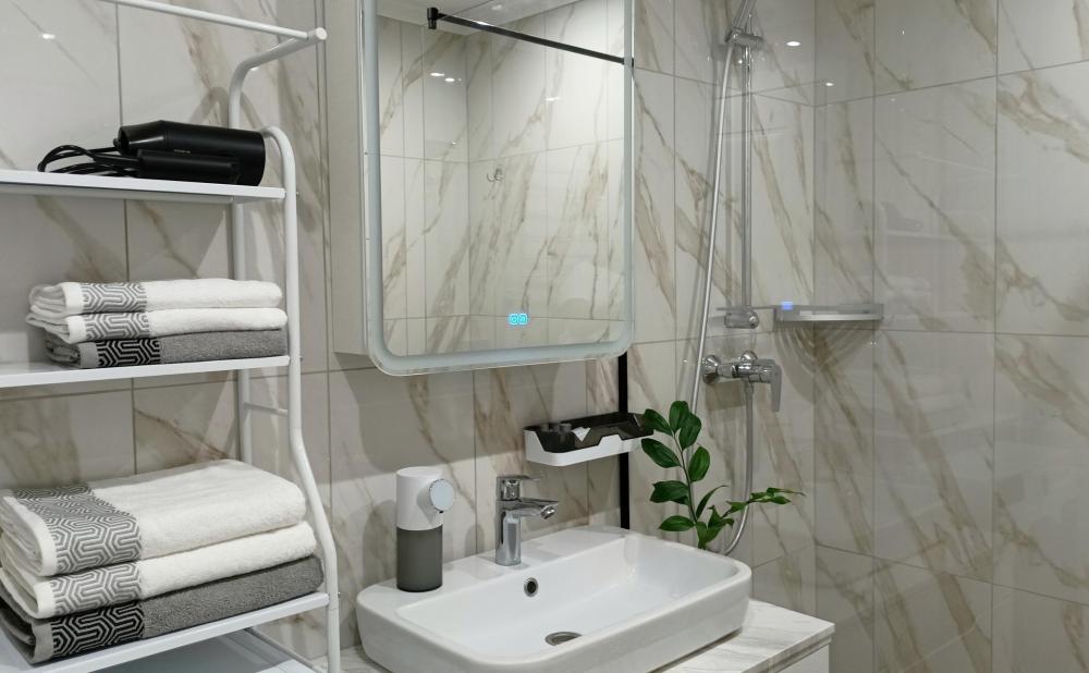 Просторная душевая кабина с «Тропической» душевой системой, умное сенсорное ведро для мусора, сенсорный дозатор пенки для умывания, шампуни, гели для душа помогут Вам всегда чувствовать себя свежо и комфортно