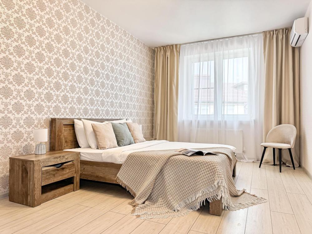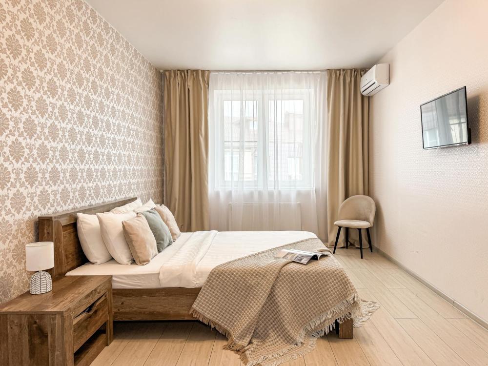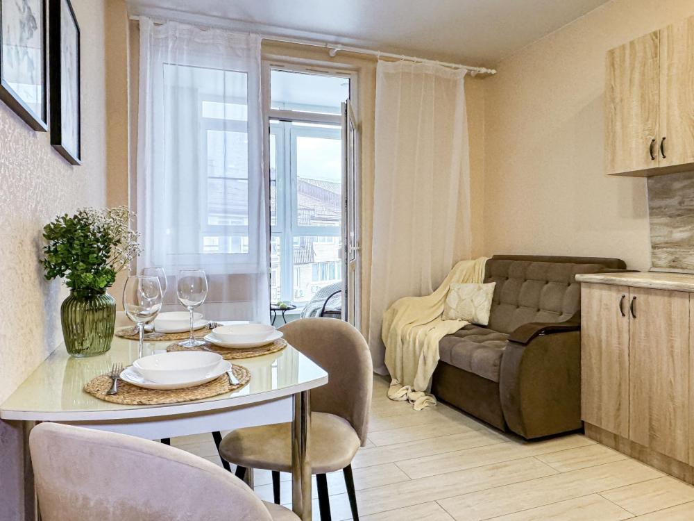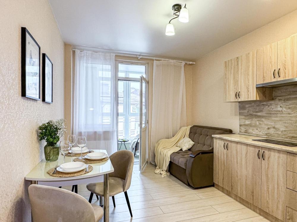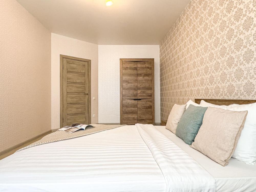 Уютные апартаменты, оборудованные всем необходимым для комфортного проживания. В апартаментах: двуспальная кровать с ортопедическим матрасом Аскона в спальне, удобный двуспальный диван на кухне, оборудованная кухня: холодильник, индукционная плита, микроволновая печь, чайник, вытяжка, стиральная машина, фен, утюг, сплит-система в спальне, сетка на окнах, набор посуды и столовых принадлежностей на 4 персоны, Смарт-ТВ и высокоскоростной Wi-Fi. Каждому гостю предоставляется по 2 полотенца (банное и для лица), полотенце для ног. 2 комплекта белого постельного белья. Застекленная лоджия с панорамным остеклением.