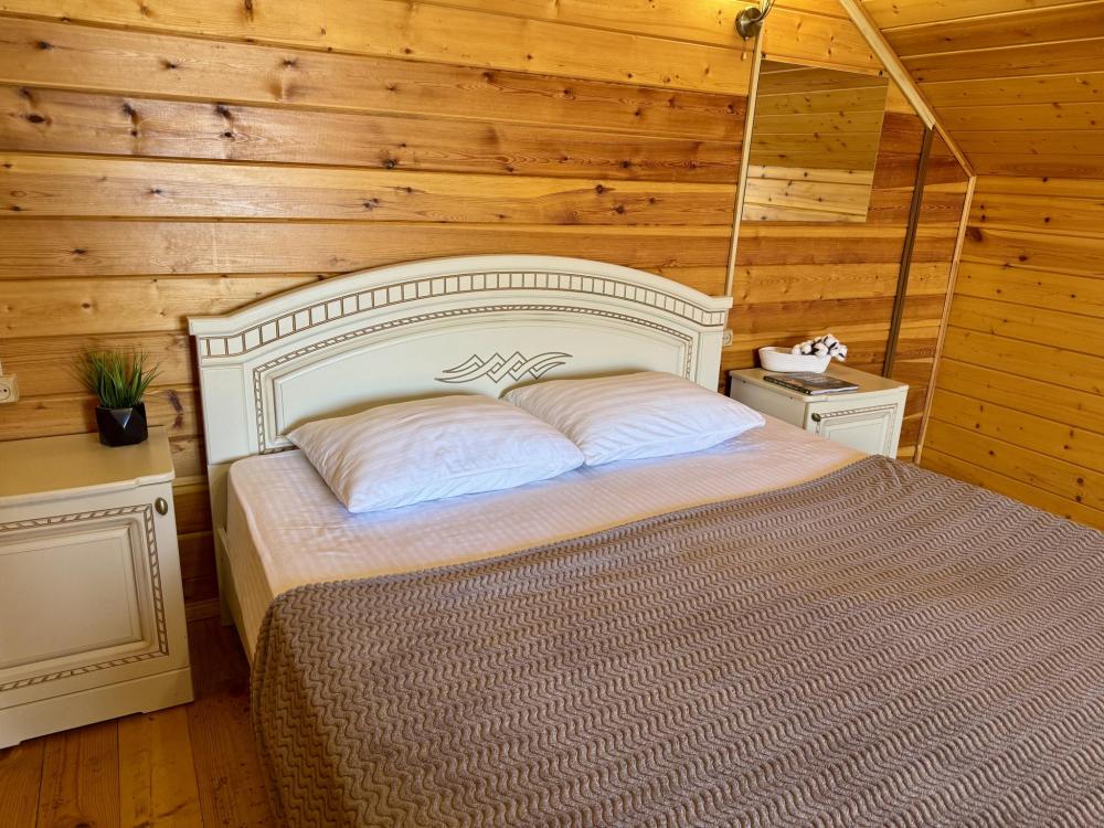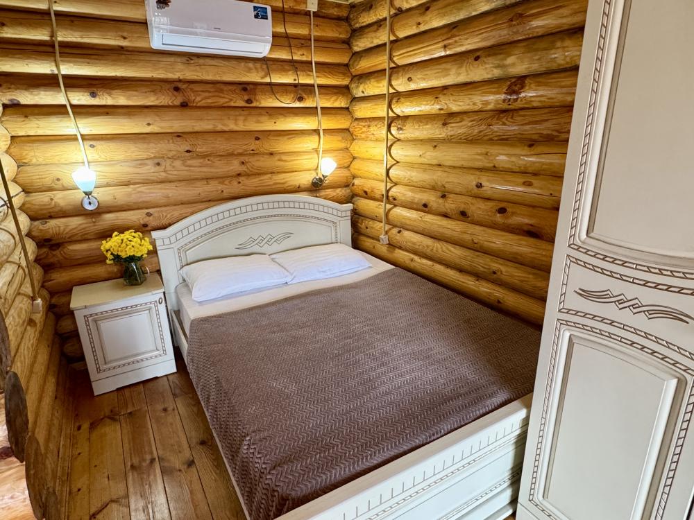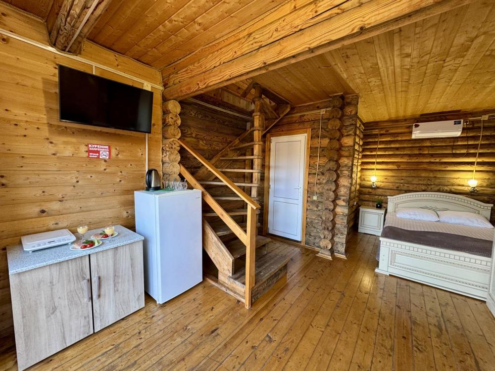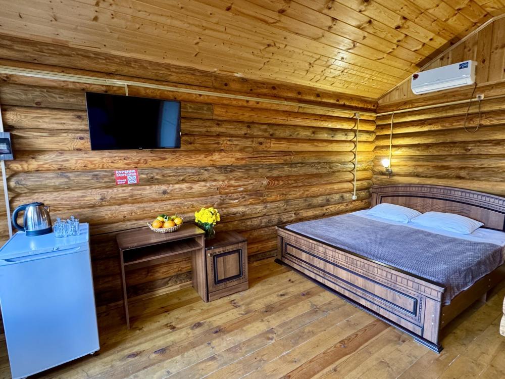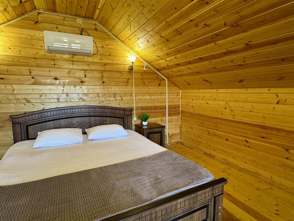 Уютный эко-домик с полным оснащением для двух человек. В домике имеется: тумбочка и шкаф для хранения вещей, гигиенические принадлежности для душа, полностью оборудованный санузел с душем, удобная двуспальная кровать, мини-холодильник, набор чайной посуды, электрический чайник, телевизор, сплит-система, постельное белье, полотенца, wi-fi.
