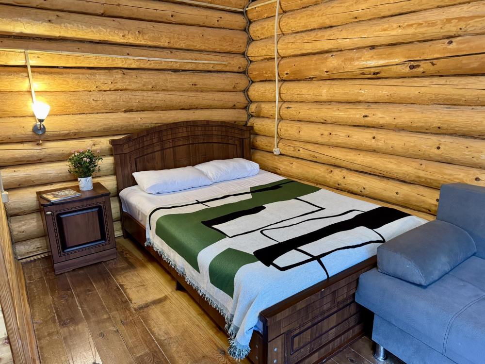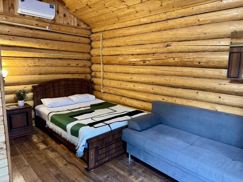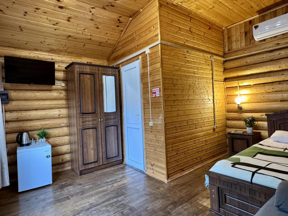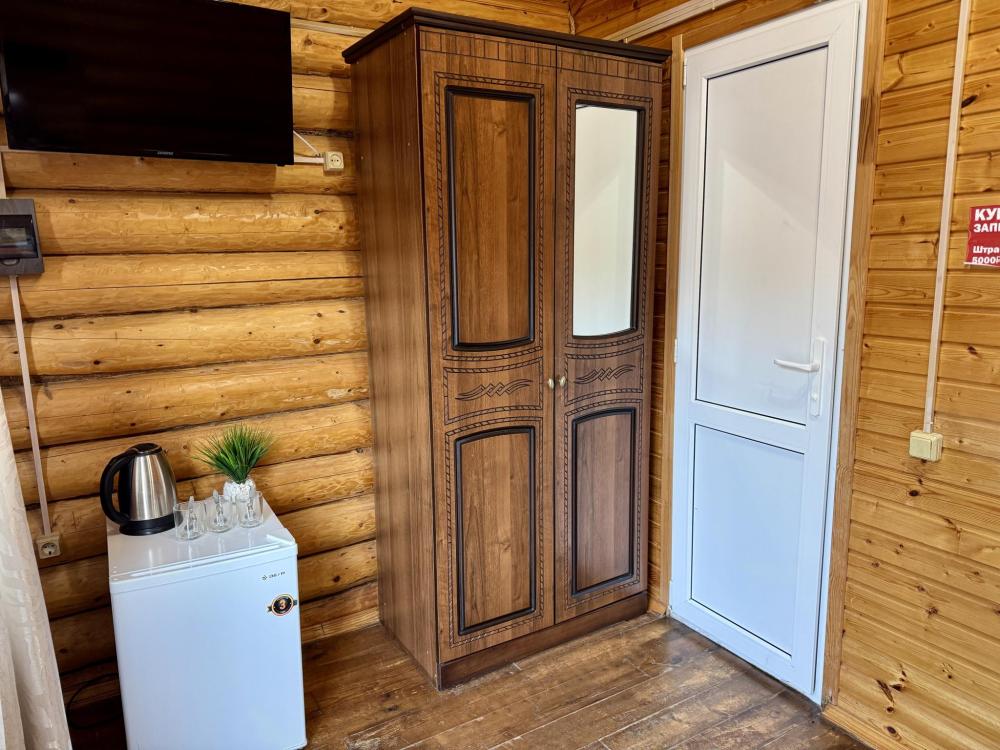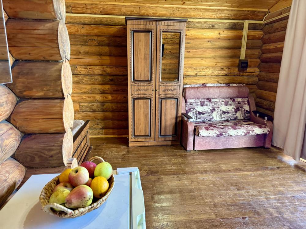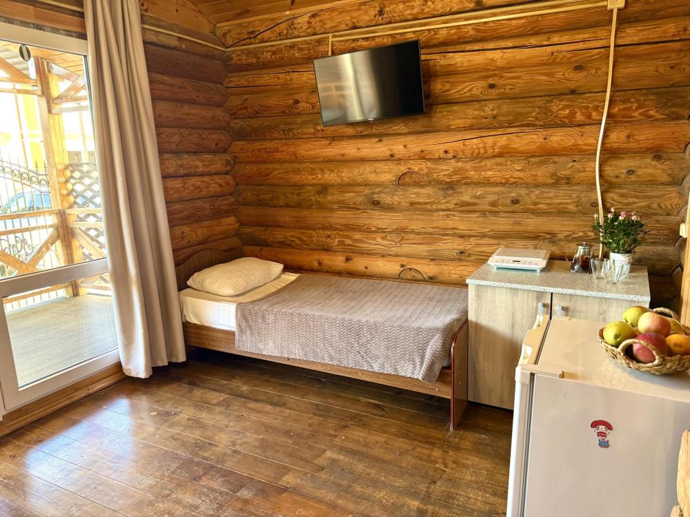Уютный эко-домик с полным оснащением, подходящий для комфортного размещения трех человек. В домике имеется: удобная двухспальная кровать и комфортный одноместный диван, тумбочка и шкаф для хранения вещей, гигиенические принадлежности для душа, полностью оборудованный санузел с душем, мини-холодильник, набор чайной посуды, электрический чайник, телевизор, сплит-система, постельное белье, полотенца, Wi-Fi.