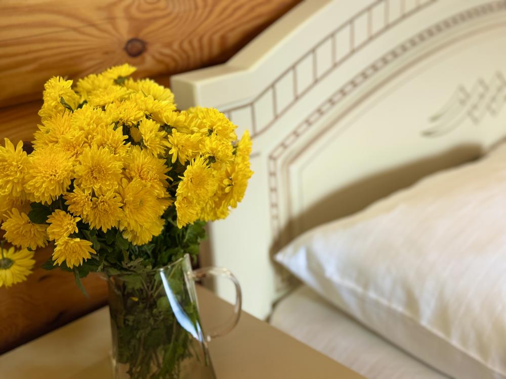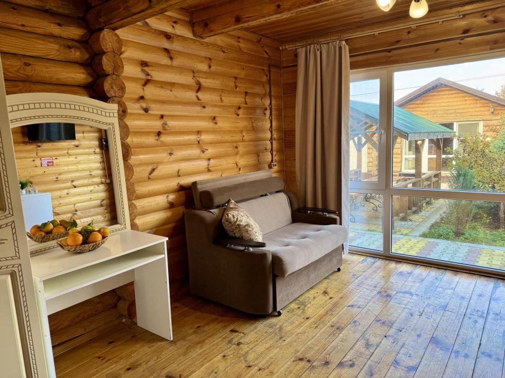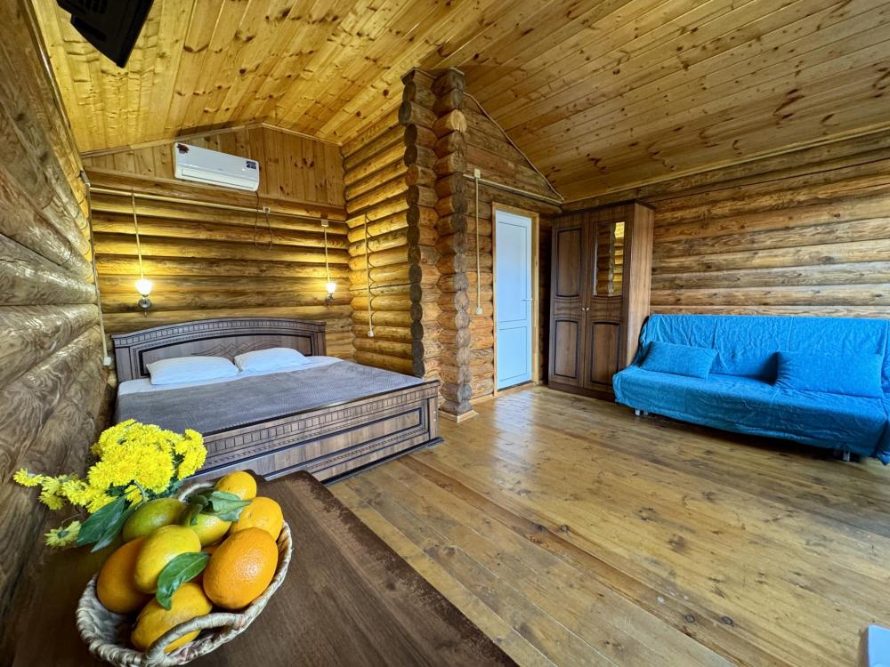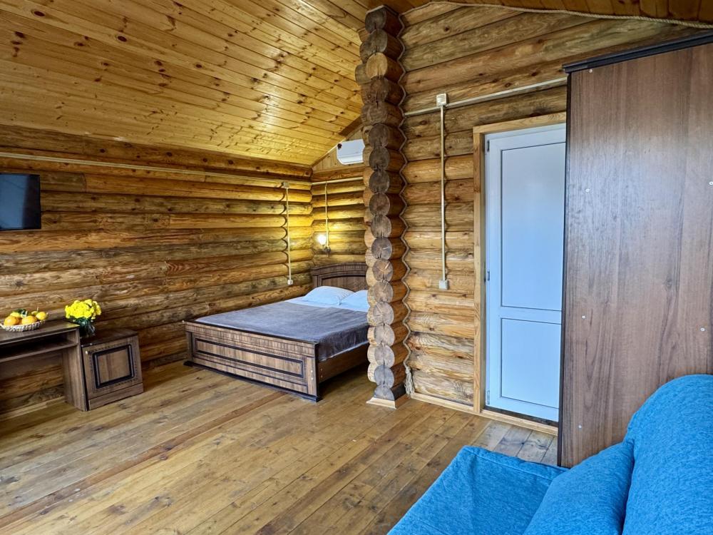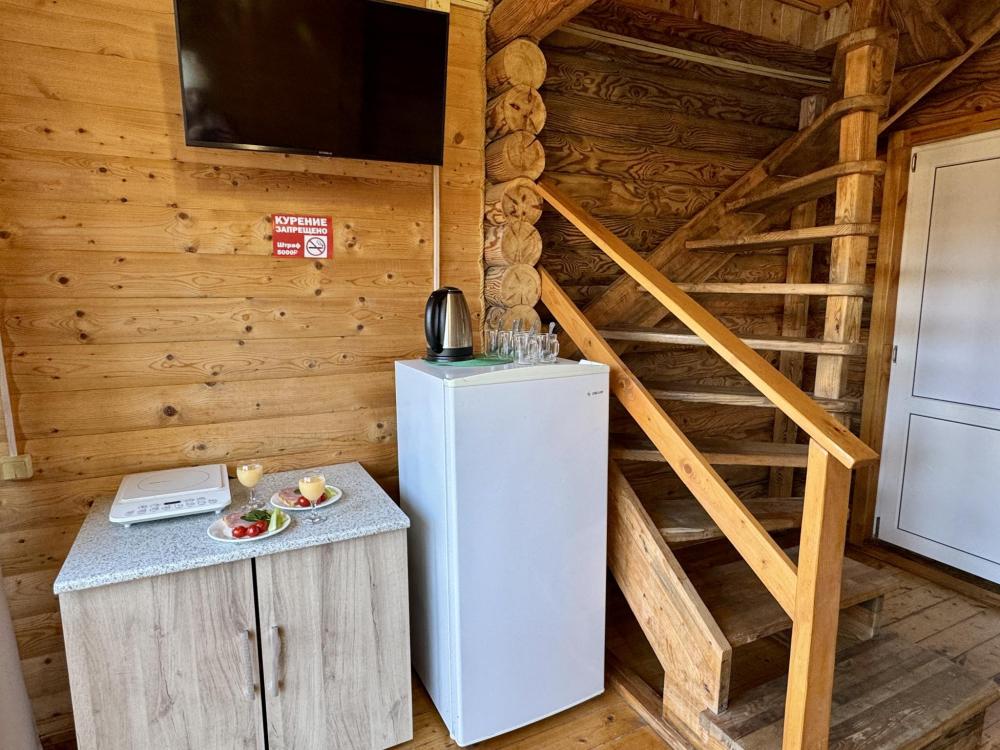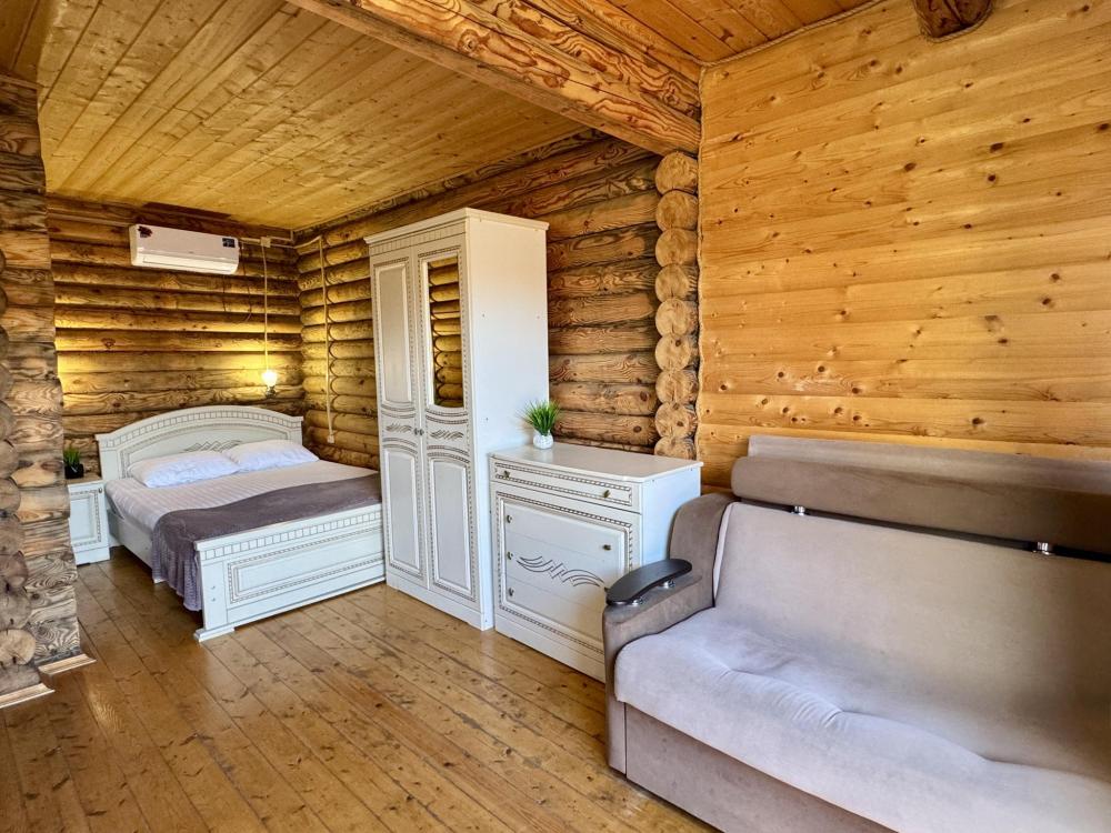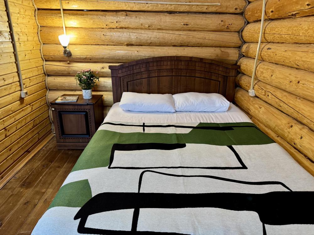 Уютный эко-домик с полным оснащением, подходящий для комфортного размещения трех человек. В домике имеется: удобная двухспальная кровать и комфортный одноместный диван, тумбочка и шкаф для хранения вещей, гигиенические принадлежности для душа, полностью оборудованный санузел с душем, мини-холодильник, набор чайной посуды, электрический чайник, телевизор, сплит-система, постельное белье, полотенца, Wi-Fi.