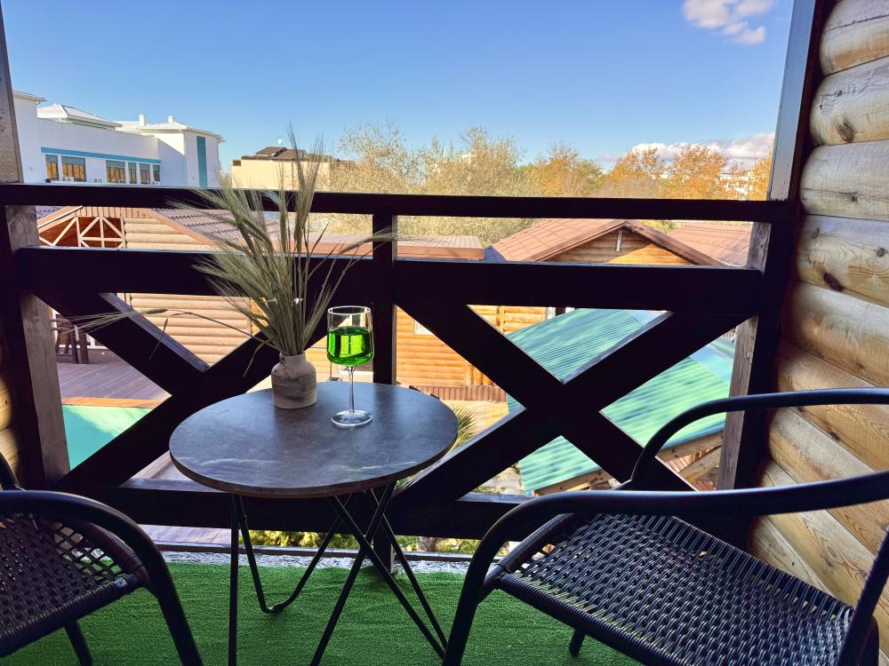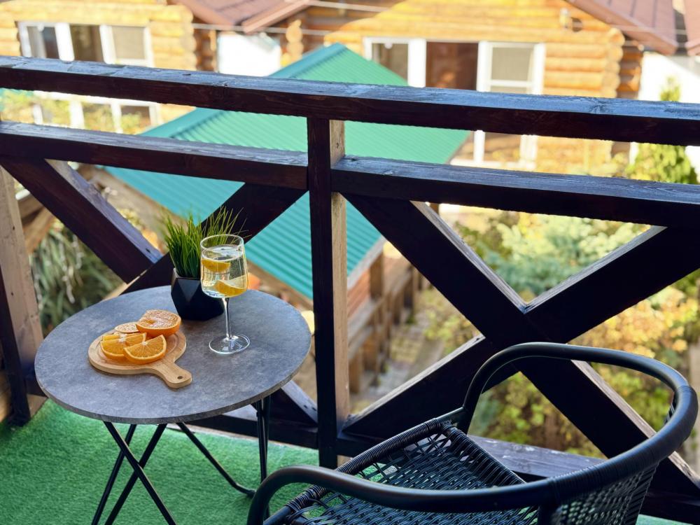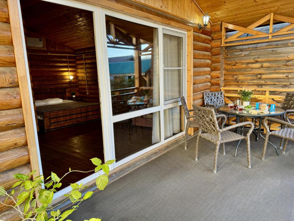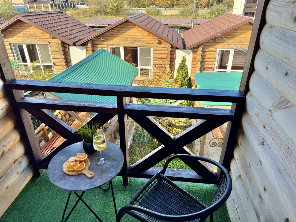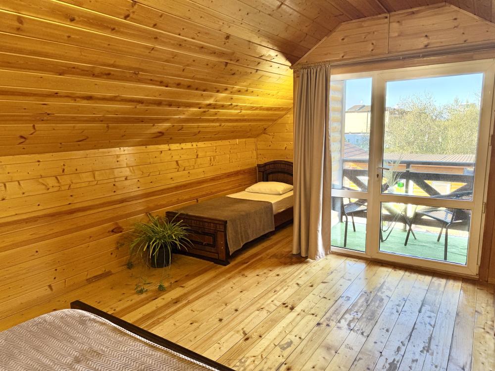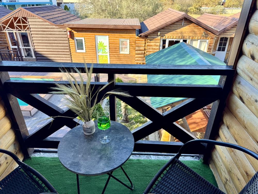 Уютный эко-домик с полным оснащением, подходящий для комфортного размещения 4-5 человек. В домике две двуспальные кровати (или двуспальная кровать и диван двуспальный), а на втором уровне - матрас односпальный и выход на балкон. Удобства в домике: телевизор, сплит-система, тумбочка, гигиенические принадлежности, санузел с душем, мини-холодильник, набор чайной посуды, электрический чайник, постельное белье, полотенца, wi-fi, терраса со столом и стульями.