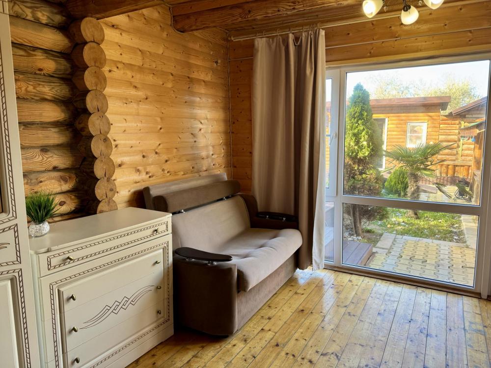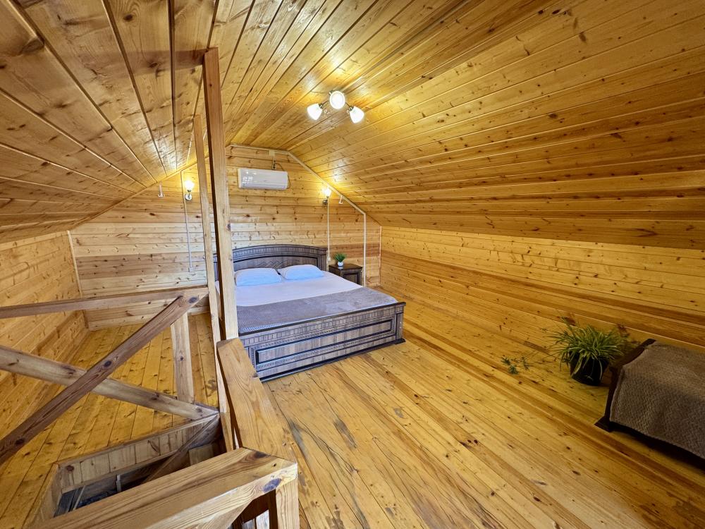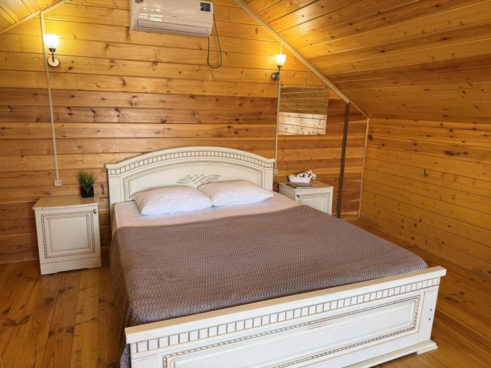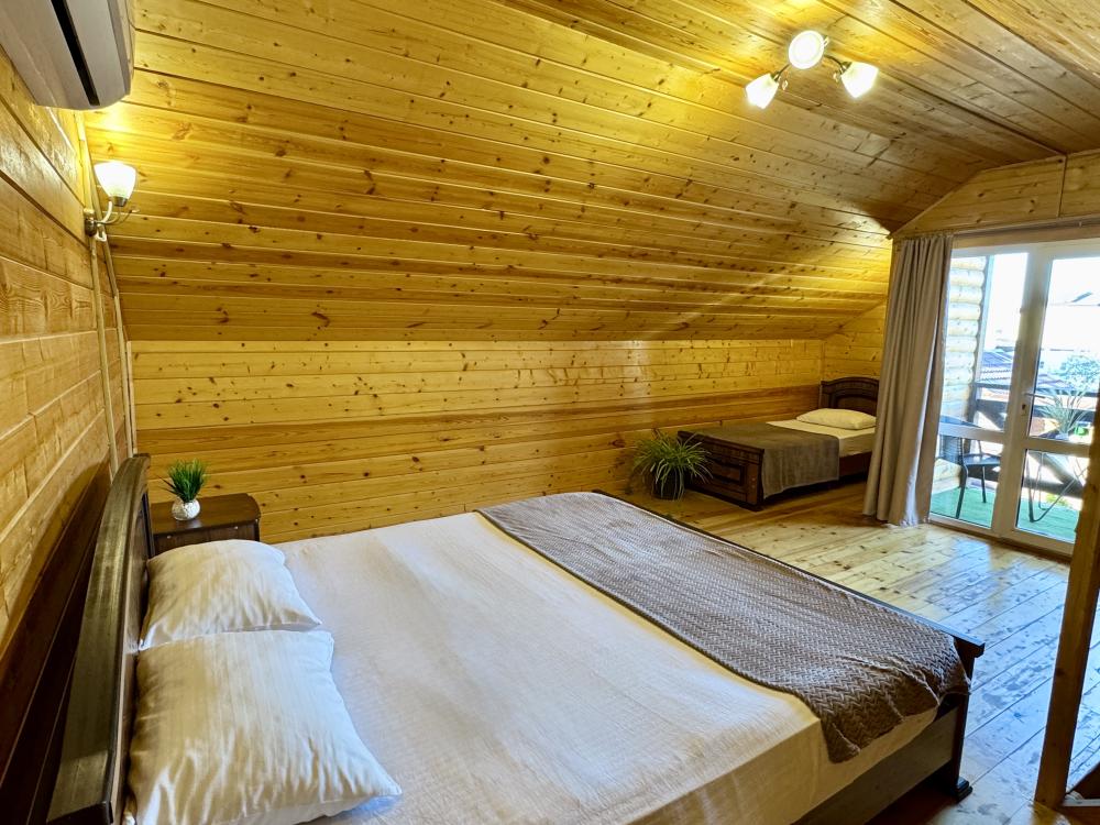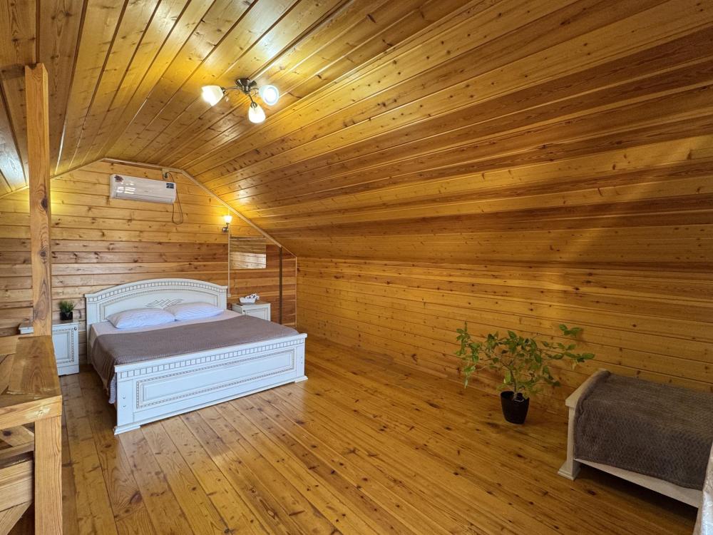 Уютный эко-домик с полным оснащением, подходящий для комфортного размещения от 6 до 8 человек и дополнительно маленькие дети могут проживать без предоставления отдельного спального места. На первом этаже дома: двуспальная кровать и диван двуспальный, удобный двухстворчатый шкаф для вещей и комод с зеркалом и ящиками, кухонный гарнитур с варочной панелью, электрическим чайником и полным набором посуды, телевизор, сплит-система, санузел с душем, фен, полотенца, гигиенические принадлежности, wi-fi, постельное белье. В спальной комнате на втором этаже: одна двуспальная кровать и две односпальные кровати, тумбочка, сплит-система, выход на балкон. На улице есть беседка с лавками и и столом.