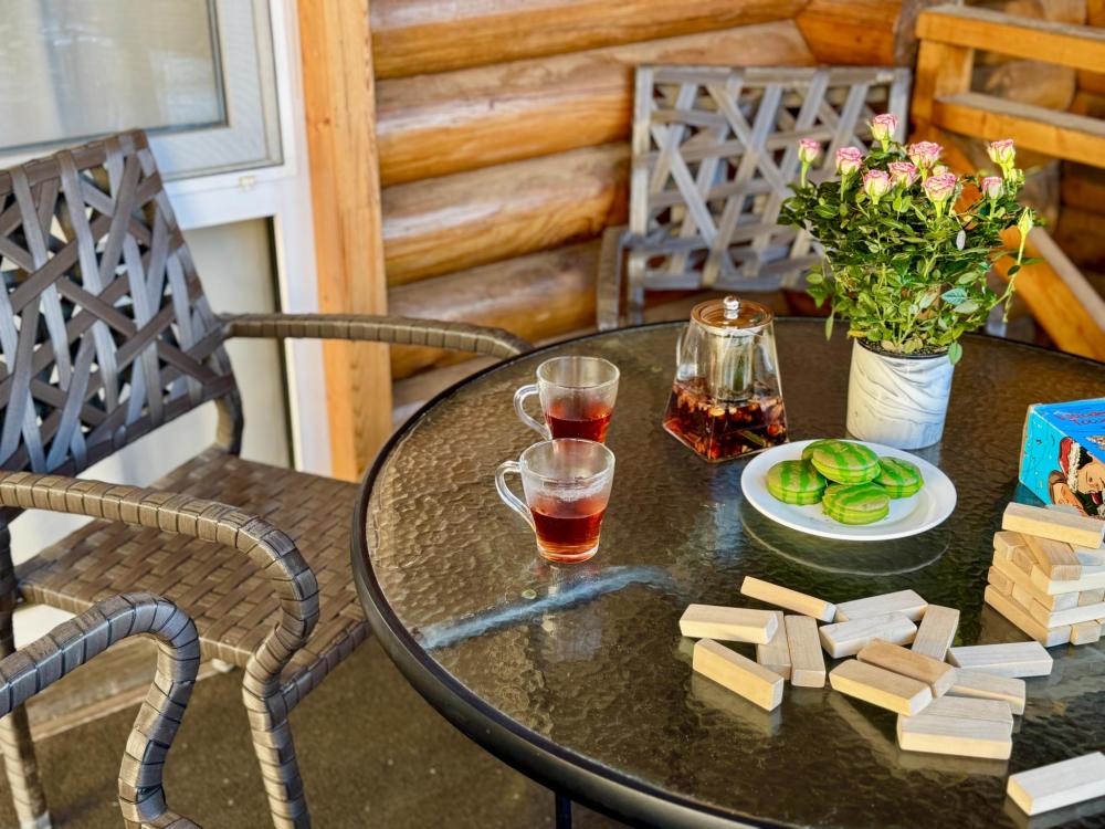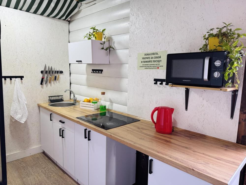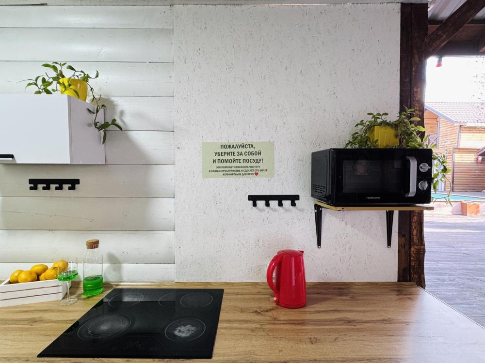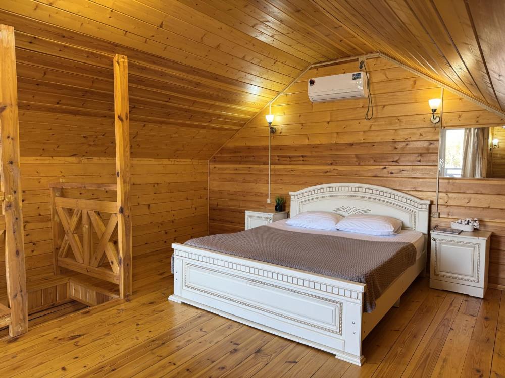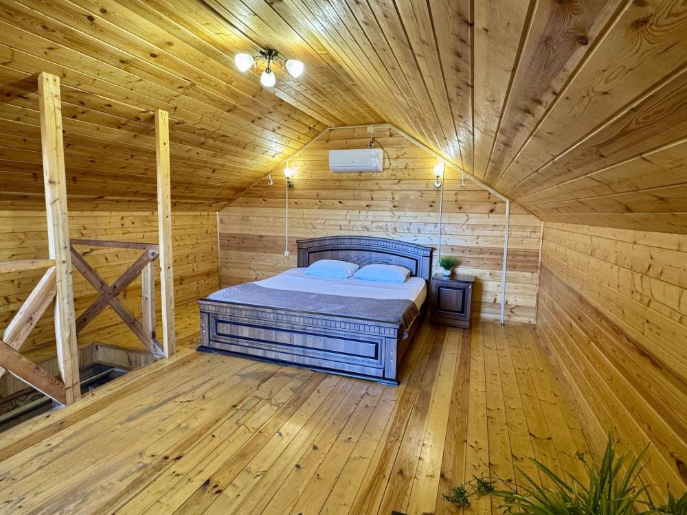 Уютный эко-домик с полным оснащением, подходящий для комфортного размещения от 6 до 8 человек и дополнительно маленькие дети могут проживать без предоставления отдельного спального места. На первом этаже дома: двуспальная кровать и диван двуспальный, удобный двухстворчатый шкаф для вещей и комод с зеркалом и ящиками, кухонный гарнитур с варочной панелью, электрическим чайником и полным набором посуды, телевизор, сплит-система, санузел с душем, фен, полотенца, гигиенические принадлежности, wi-fi, постельное белье. В спальной комнате на втором этаже: одна двуспальная кровать и две односпальные кровати, тумбочка, сплит-система, выход на балкон. На улице есть беседка с лавками и и столом.