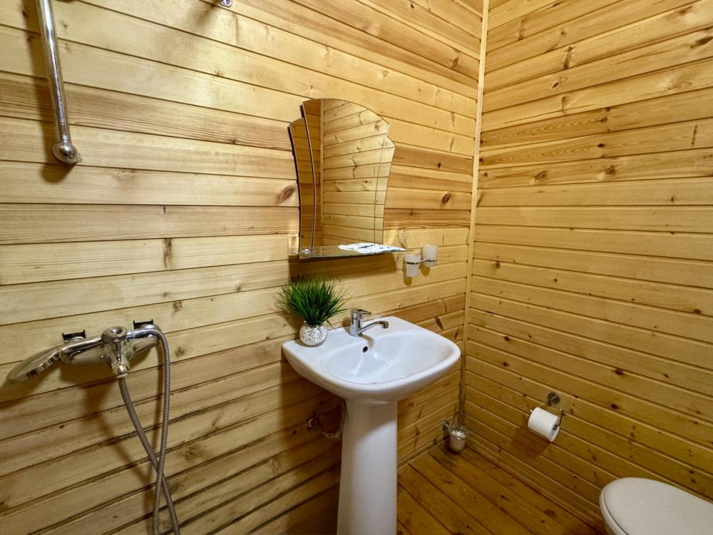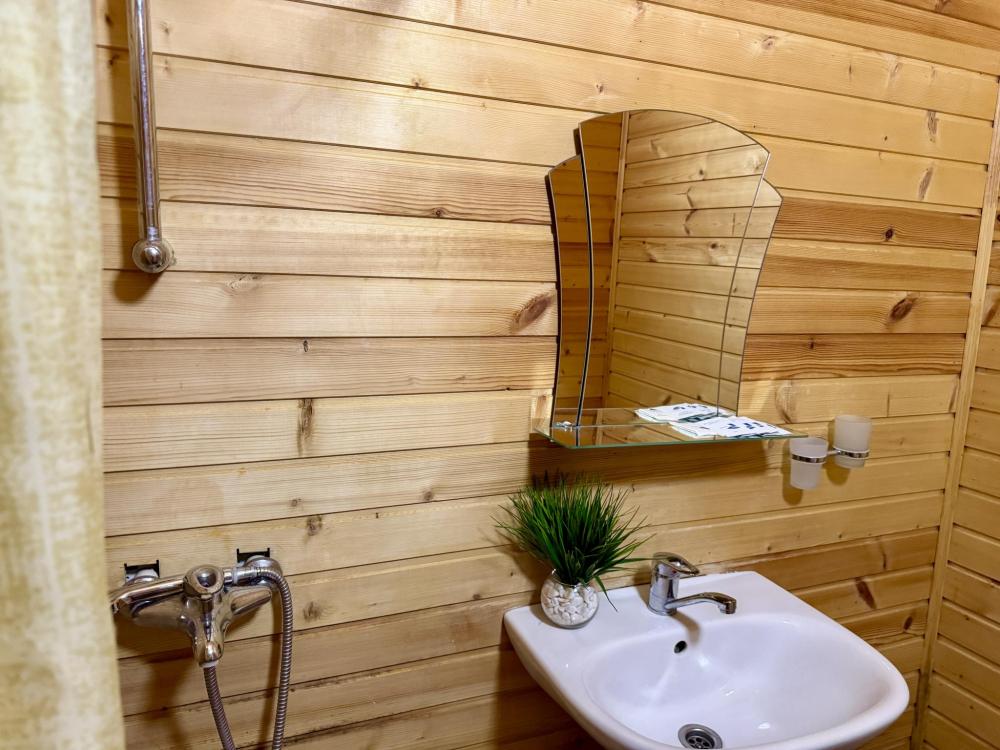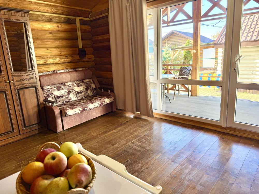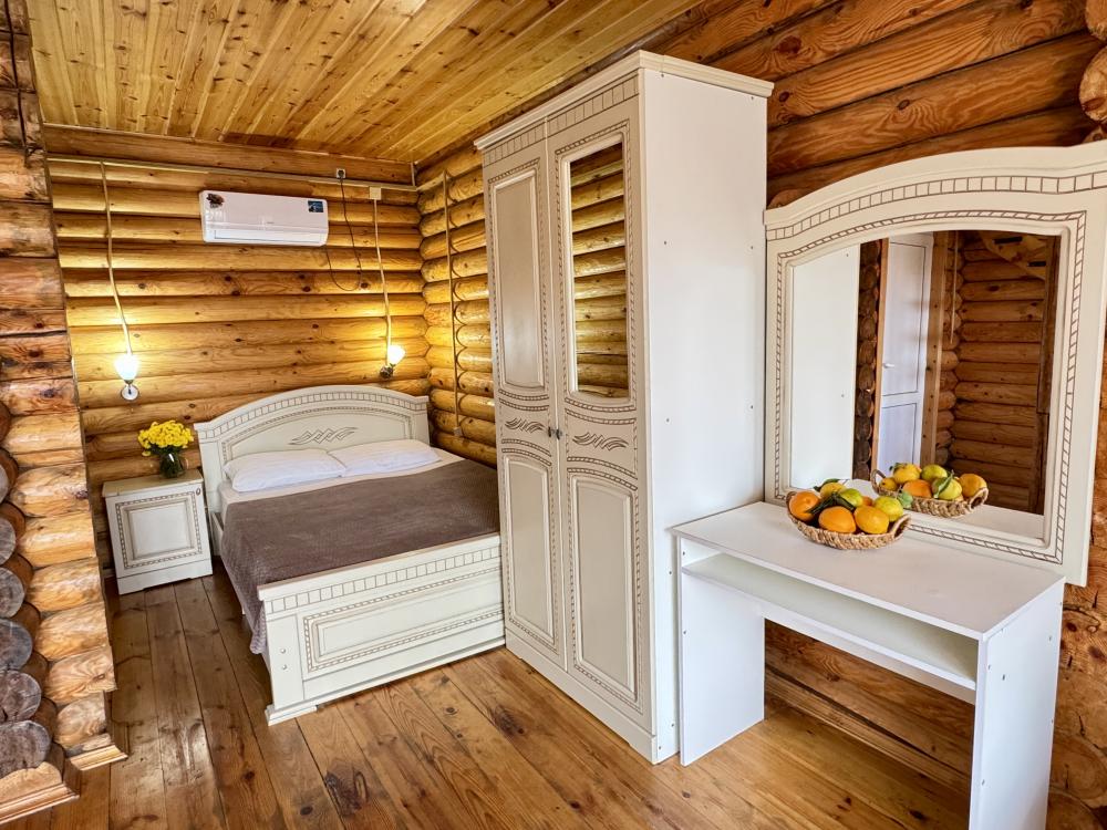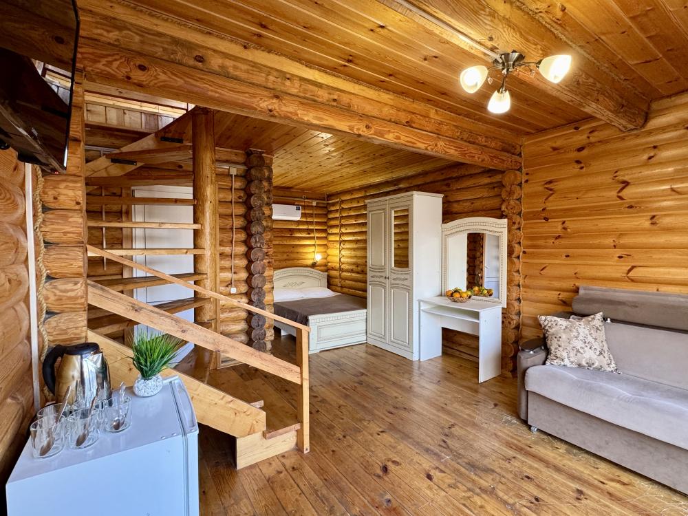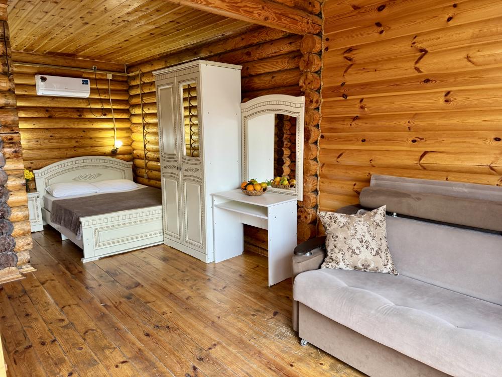 Уютный эко-домик с полным оснащением, подходящий для комфортного размещения четырех человек. В домике имеется: удобная двухспальная кровать и комфортный двухспальный диван, тумбочка и шкаф для хранения вещей, гигиенические принадлежности для душа, полностью оборудованный санузел с душем, мини-холодильник, набор чайной посуды, электрический чайник, телевизор, сплит-система, постельное белье, полотенца, wi-fi.