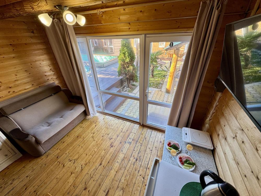 Уютный эко-домик с полным оснащением, подходящий для комфортного размещения 3-х человек. В домике имеется: оборудованная мини-кухня с варочной панелью, электрическим чайником и полным набором посуды, удобная двухспальная кровать, раскладной диван, тумбочка и шкаф для хранения вещей, гигиенические принадлежности для душа, полностью оборудованный санузел с душем, мини-холодильник, телевизор, сплит-система, постельное белье, полотенца, wi-fi, своя терраса со столиком.
