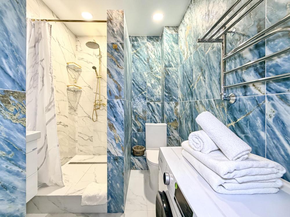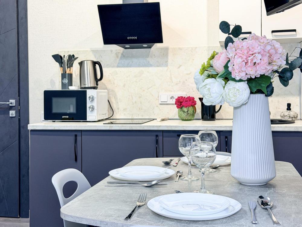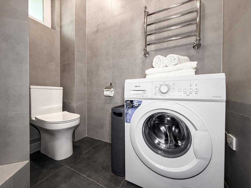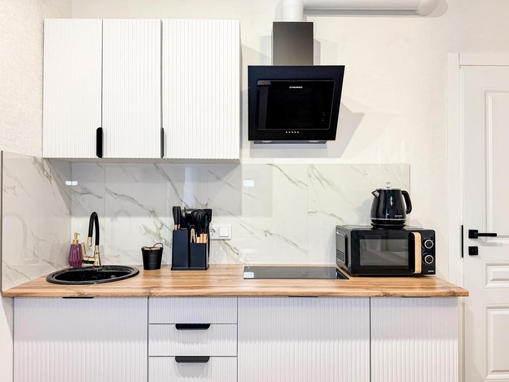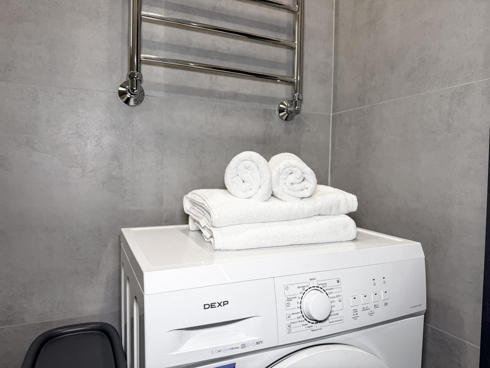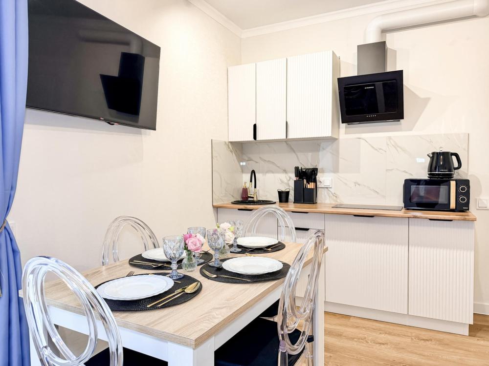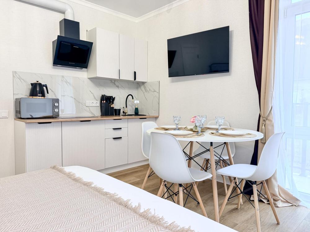 В студии предусмотрен совмещённый санузел с современной душевой системой и стиральной машиной. Все необходимые мелочи для комфорта: полотенца, фен, мыло, шампунь и гель для душа — уже ждут гостей. Кухня оборудована всем необходимым для самостоятельного приготовления еды: полноразмерный двухкамерный холодильник, микроволновая печь, варочная плита, чайник, а также полный набор посуды для готовки и сервировки, обеденная зона. Для удобства в номере предусмотрены шкаф для одежды, прикроватные тумбочки, телевизор, рабочая зона и напольная раскладная сушка для белья. Гладильные принадлежности находятся на этаже в общем доступе. Бесплатный Wi-Fi обеспечивает стабильное подключение к интернету на протяжении всего вашего пребывания.