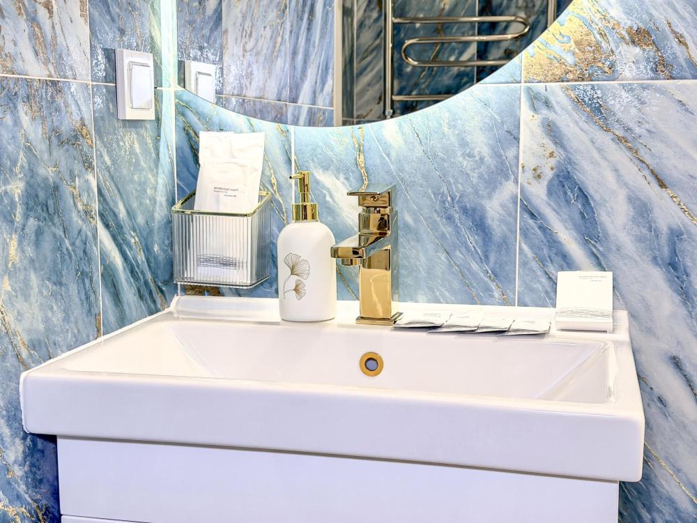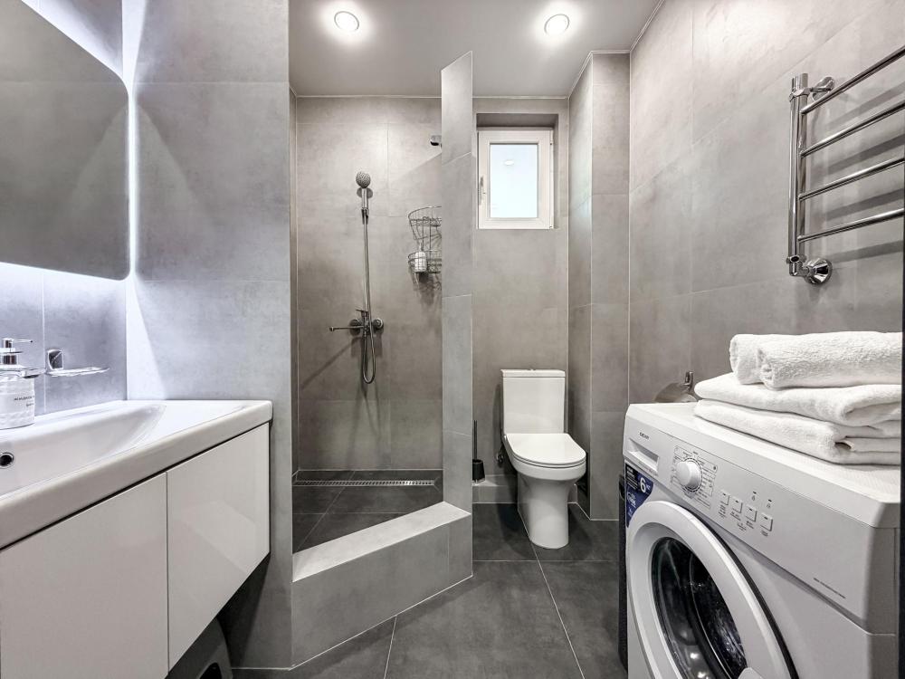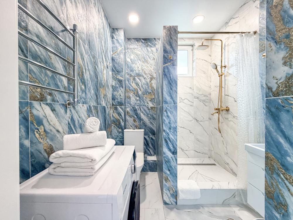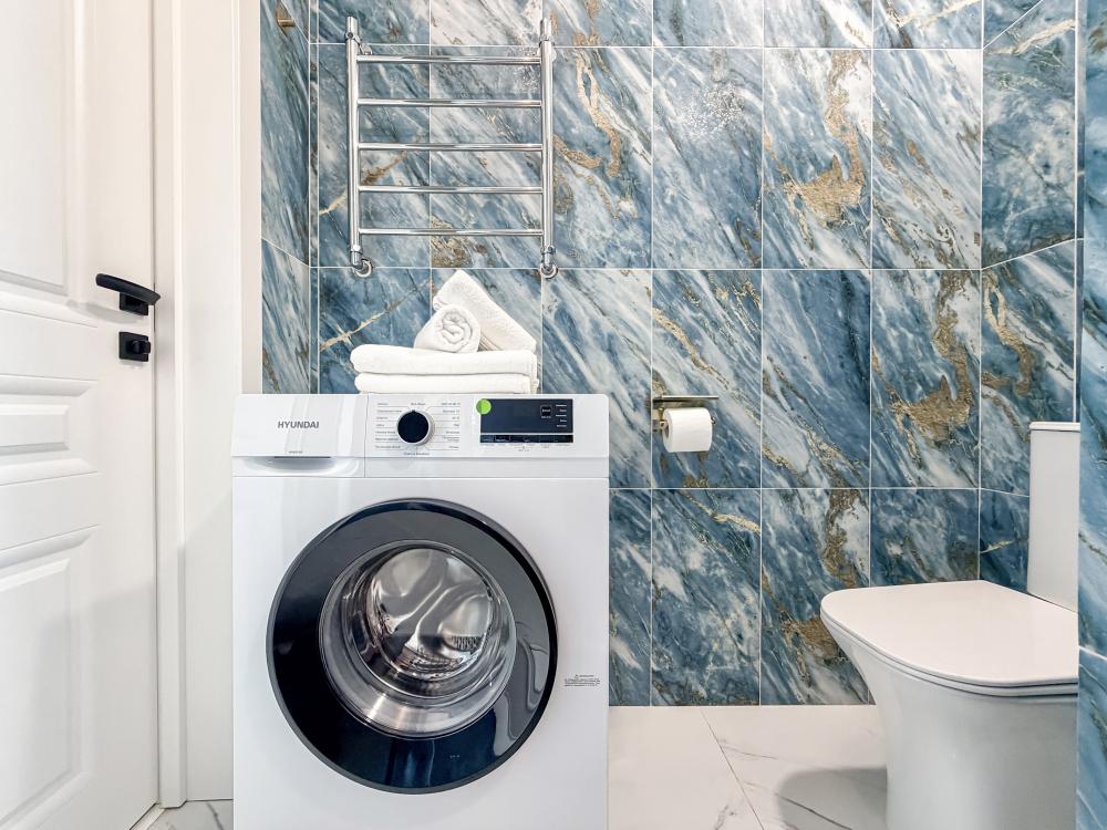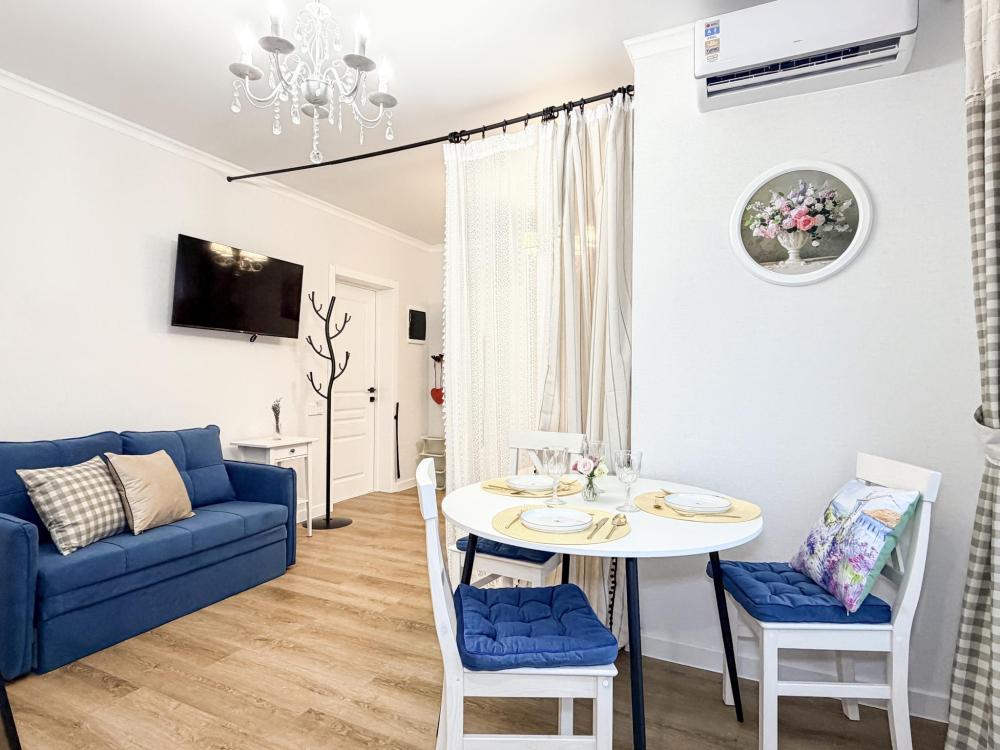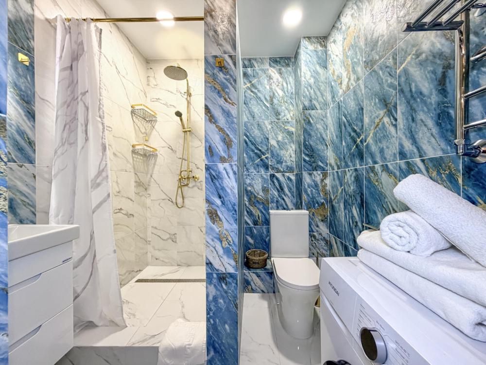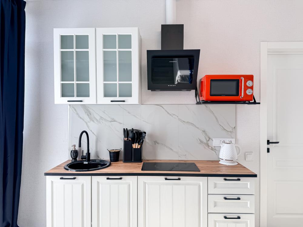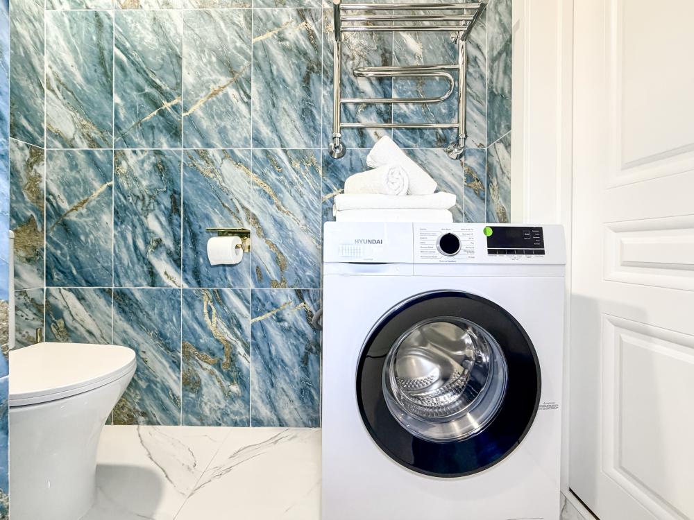 В студии предусмотрен совмещённый санузел с современной душевой системой и стиральной машиной. Все необходимые мелочи для комфорта: полотенца, фен, мыло, шампунь и гель для душа — уже ждут гостей. Кухня оборудована всем необходимым для самостоятельного приготовления еды: полноразмерный двухкамерный холодильник, микроволновая печь, варочная плита, чайник, а также полный набор посуды для готовки и сервировки, обеденная зона. Для удобства в номере предусмотрены шкаф для одежды, прикроватные тумбочки, телевизор, рабочая зона и напольная раскладная сушка для белья. Гладильные принадлежности находятся на этаже в общем доступе. Бесплатный Wi-Fi обеспечивает стабильное подключение к интернету на протяжении всего вашего пребывания.