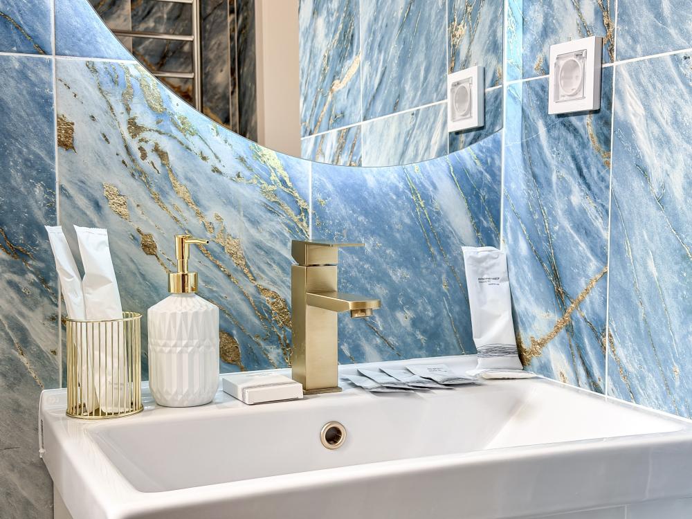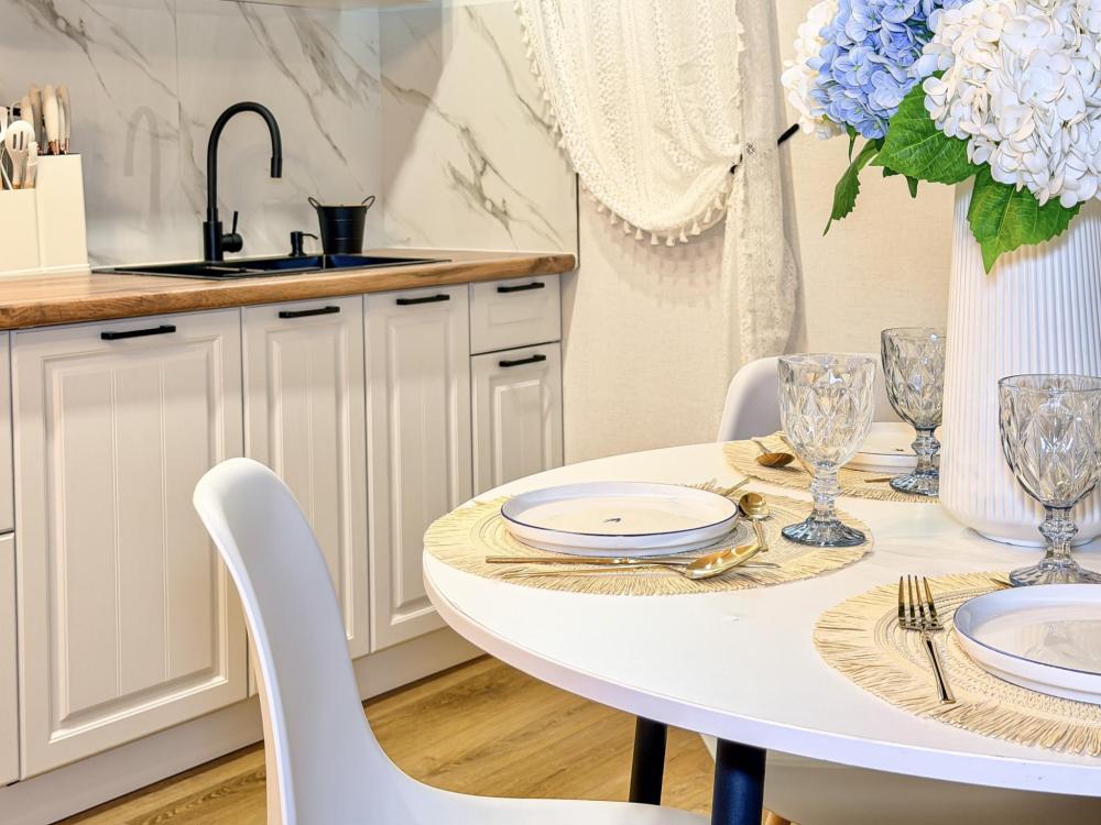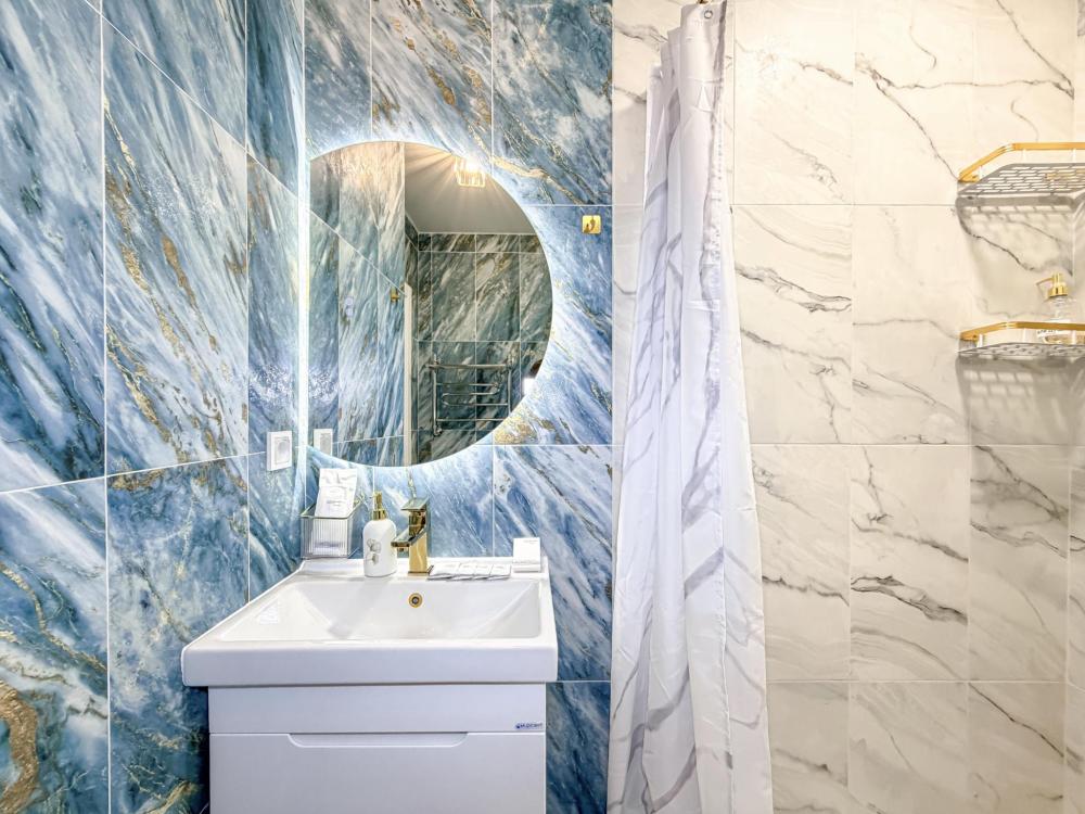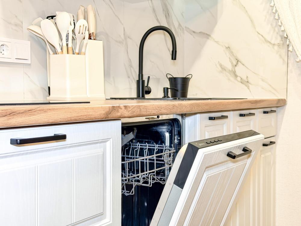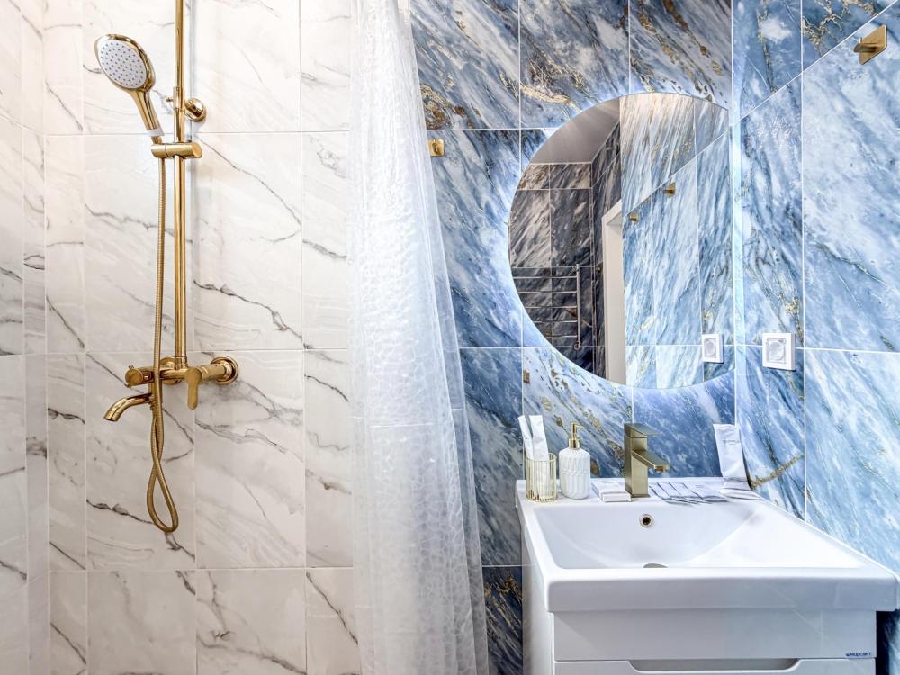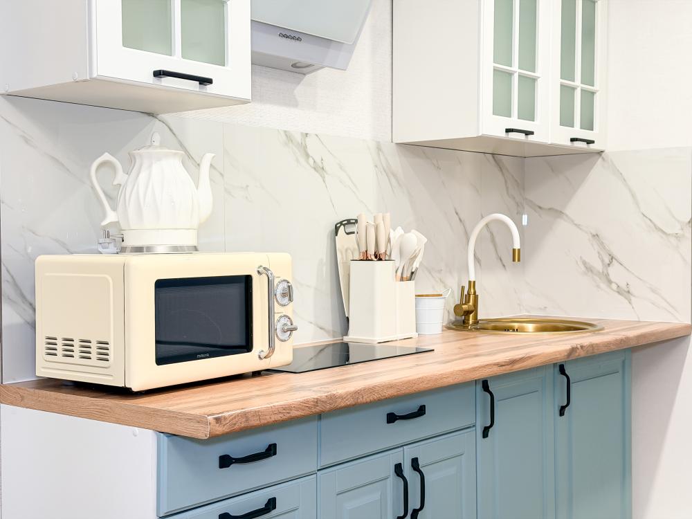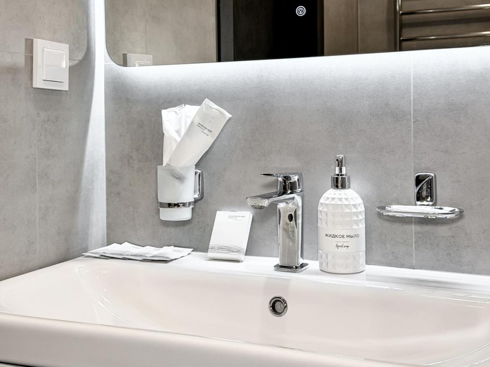 В студии предусмотрен совмещённый санузел с современной душевой системой и стиральной машиной. Все необходимые мелочи для комфорта: полотенца, фен, мыло, шампунь и гель для душа — уже ждут гостей. Кухня оборудована всем необходимым для самостоятельного приготовления еды: полноразмерный двухкамерный холодильник, микроволновая печь, варочная плита, чайник, а также полный набор посуды для готовки и сервировки, обеденная зона. Для удобства в номере предусмотрены шкаф для одежды, прикроватные тумбочки, телевизор, рабочая зона и напольная раскладная сушка для белья. Гладильные принадлежности находятся на этаже в общем доступе. Бесплатный Wi-Fi обеспечивает стабильное подключение к интернету на протяжении всего вашего пребывания.